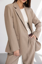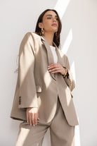 ג'קט אלגנטי בגזרה ישרה ומחמיאה, בשילוב שלושה כיסי דמה וסגירת כפתור.