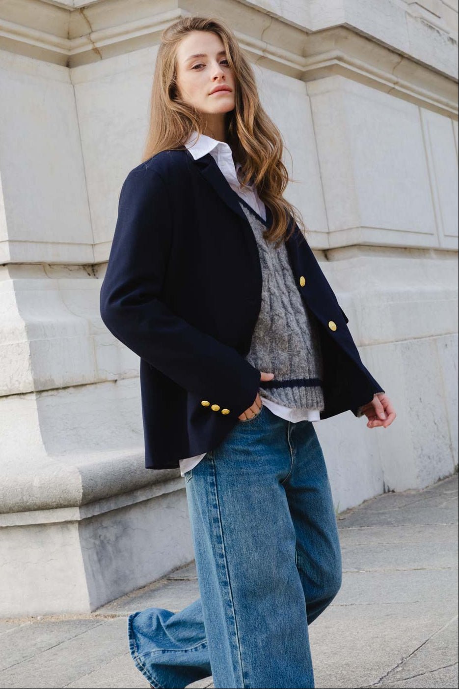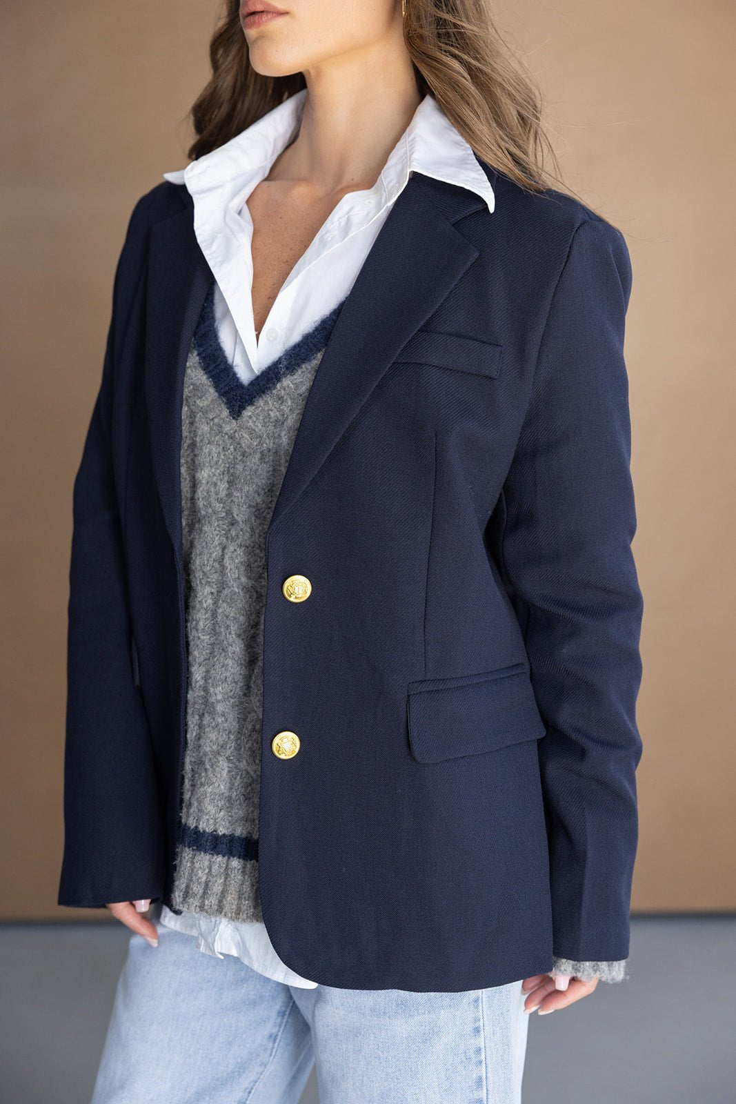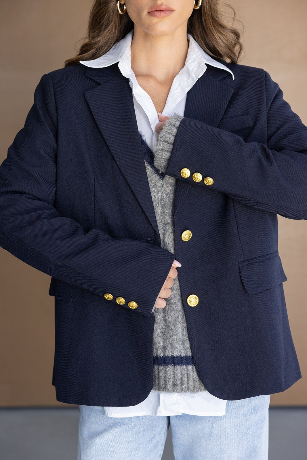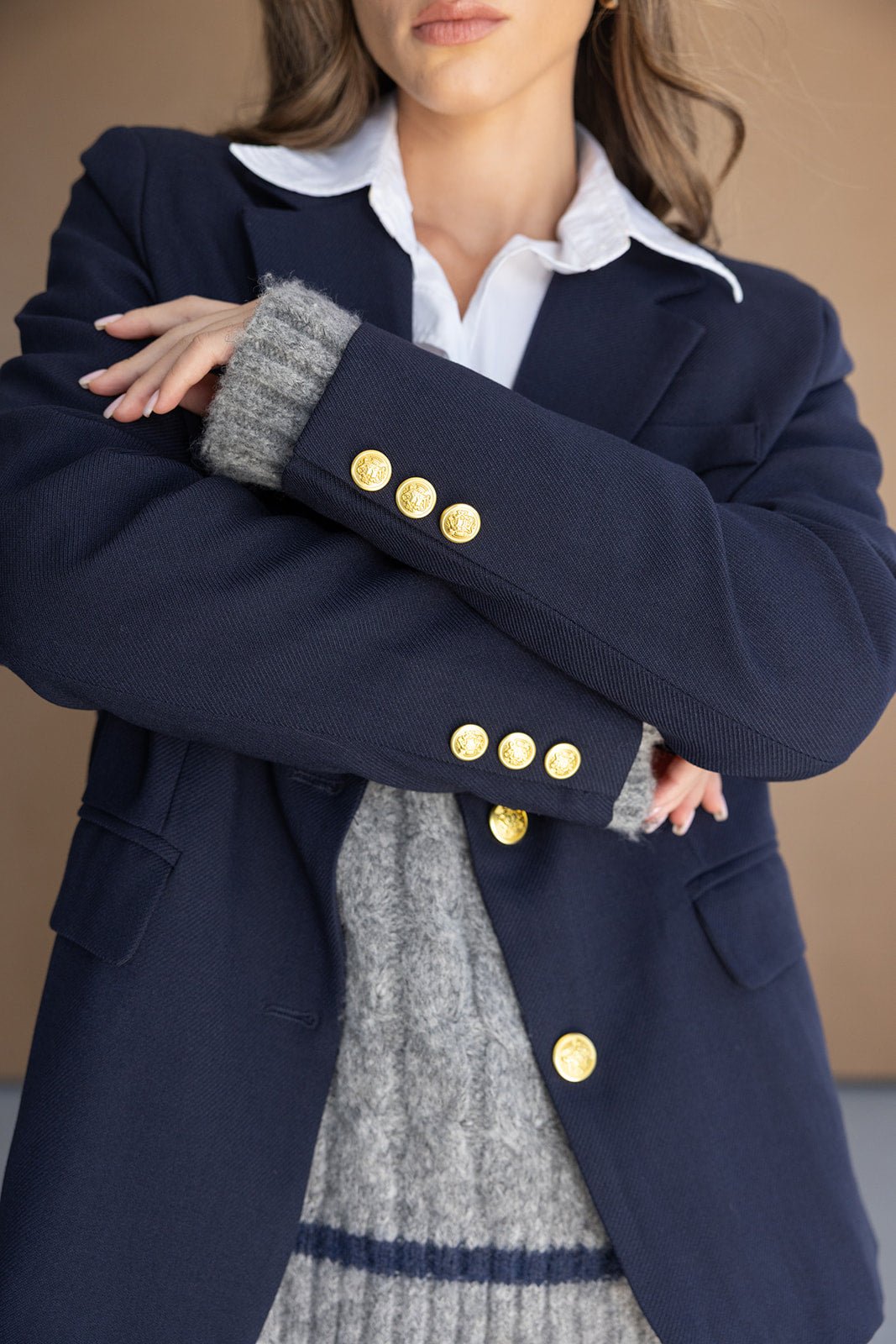ג'קט מחויט במראה קלאסי ואלגנטי, בשילוב כפתורים מוזהבים וכיסים קדמיים.