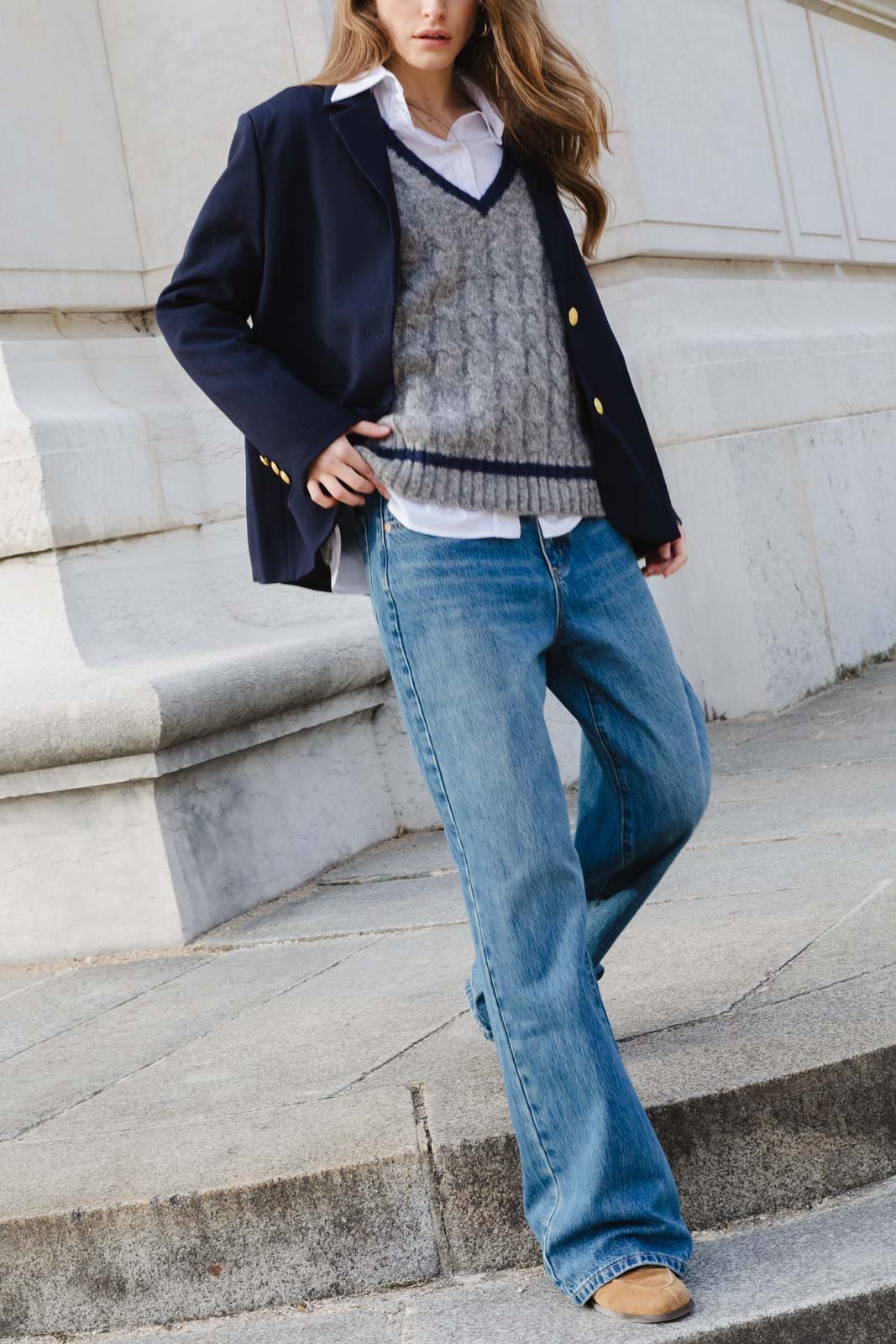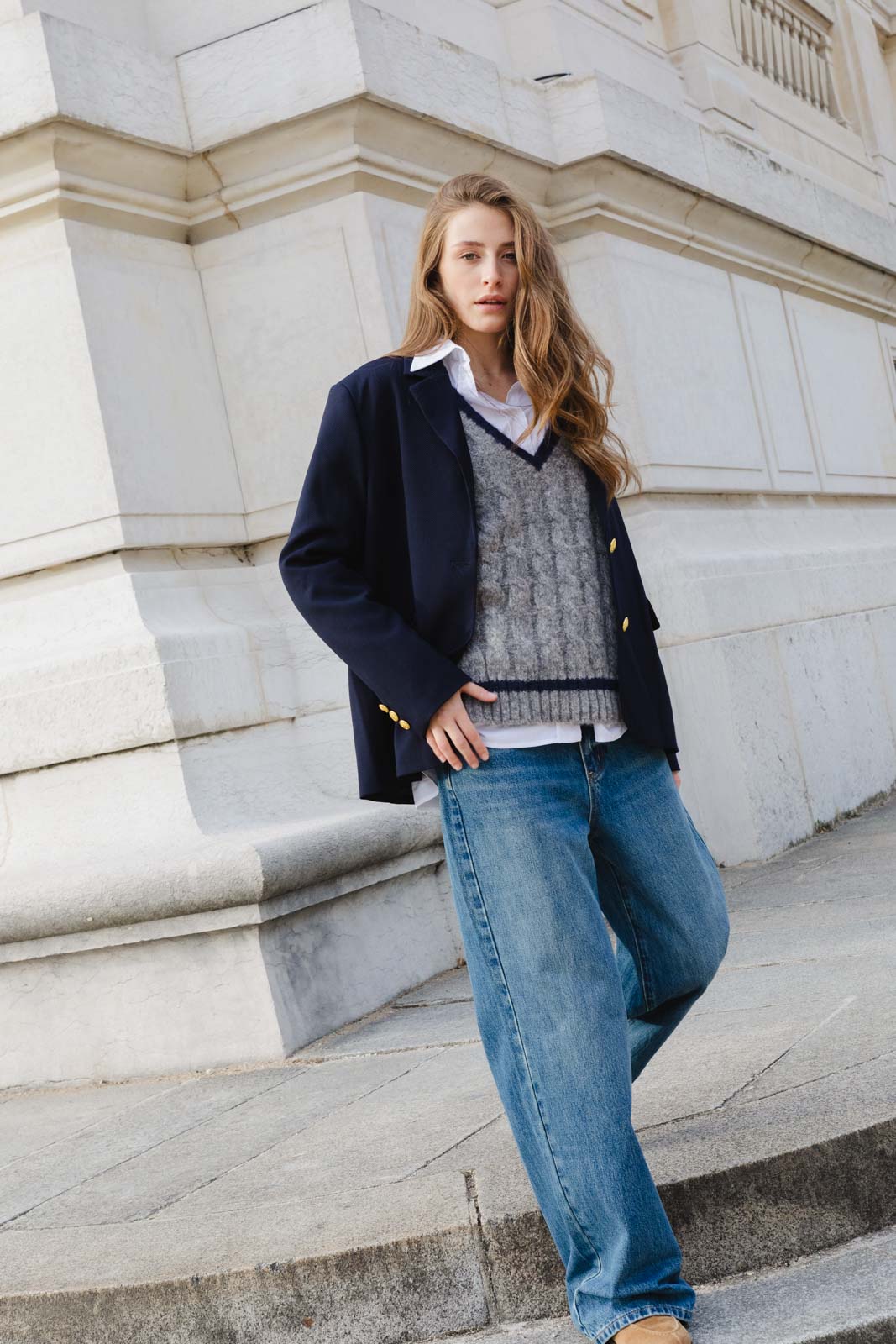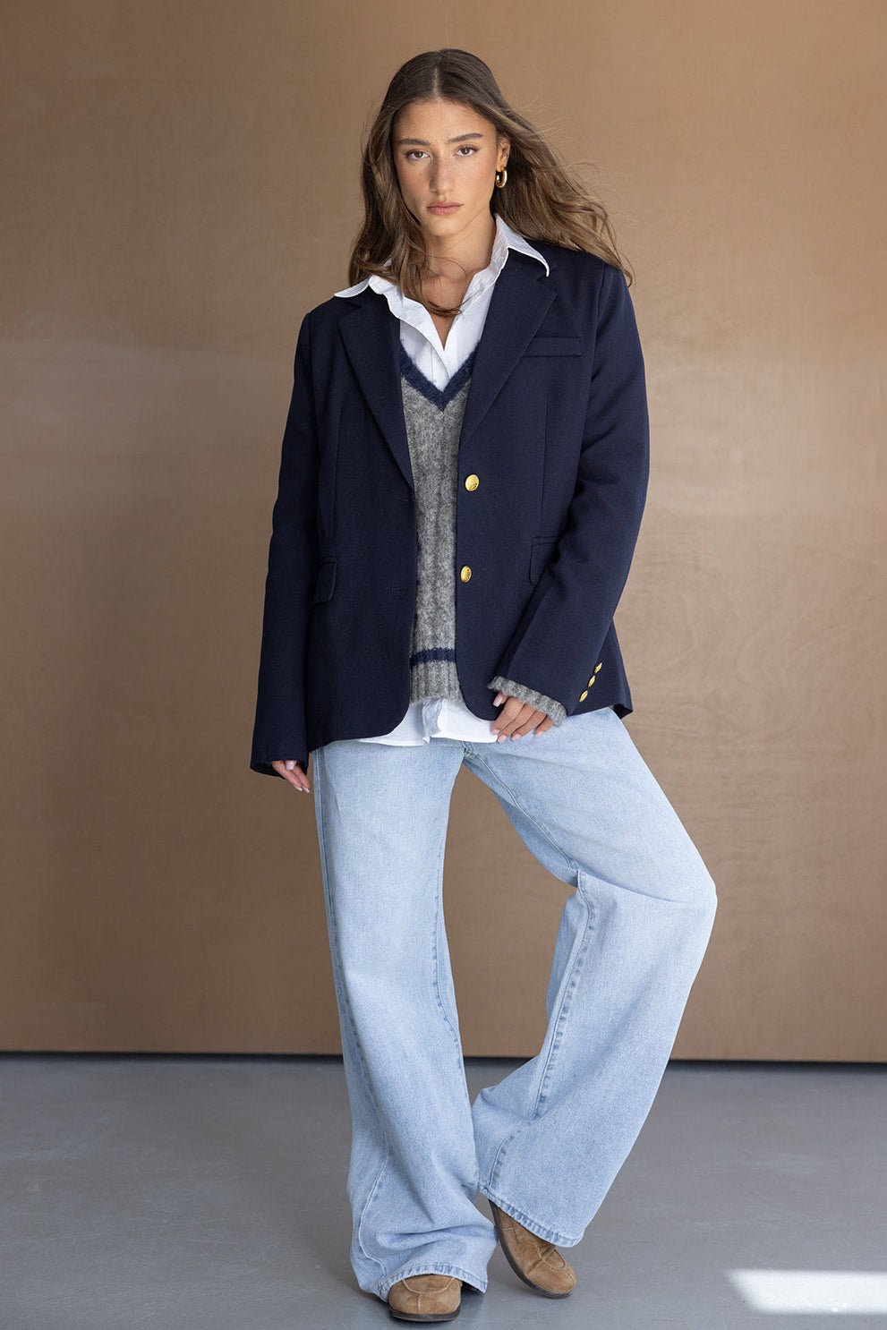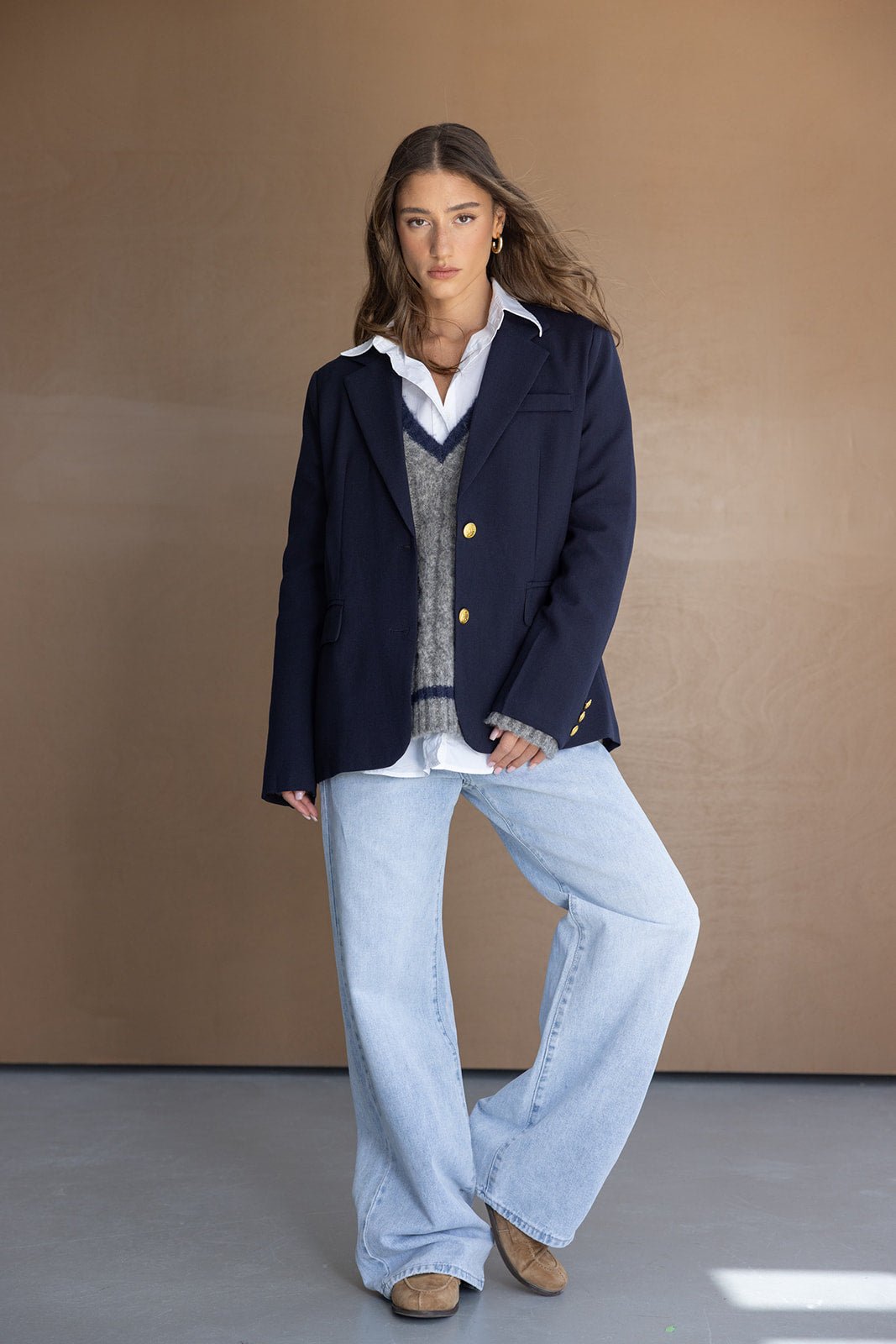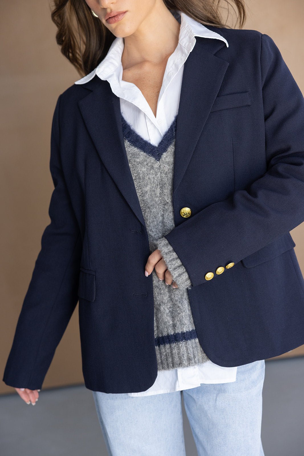 ג'קט מחויט במראה קלאסי ואלגנטי, בשילוב כפתורים מוזהבים וכיסים קדמיים.