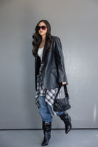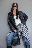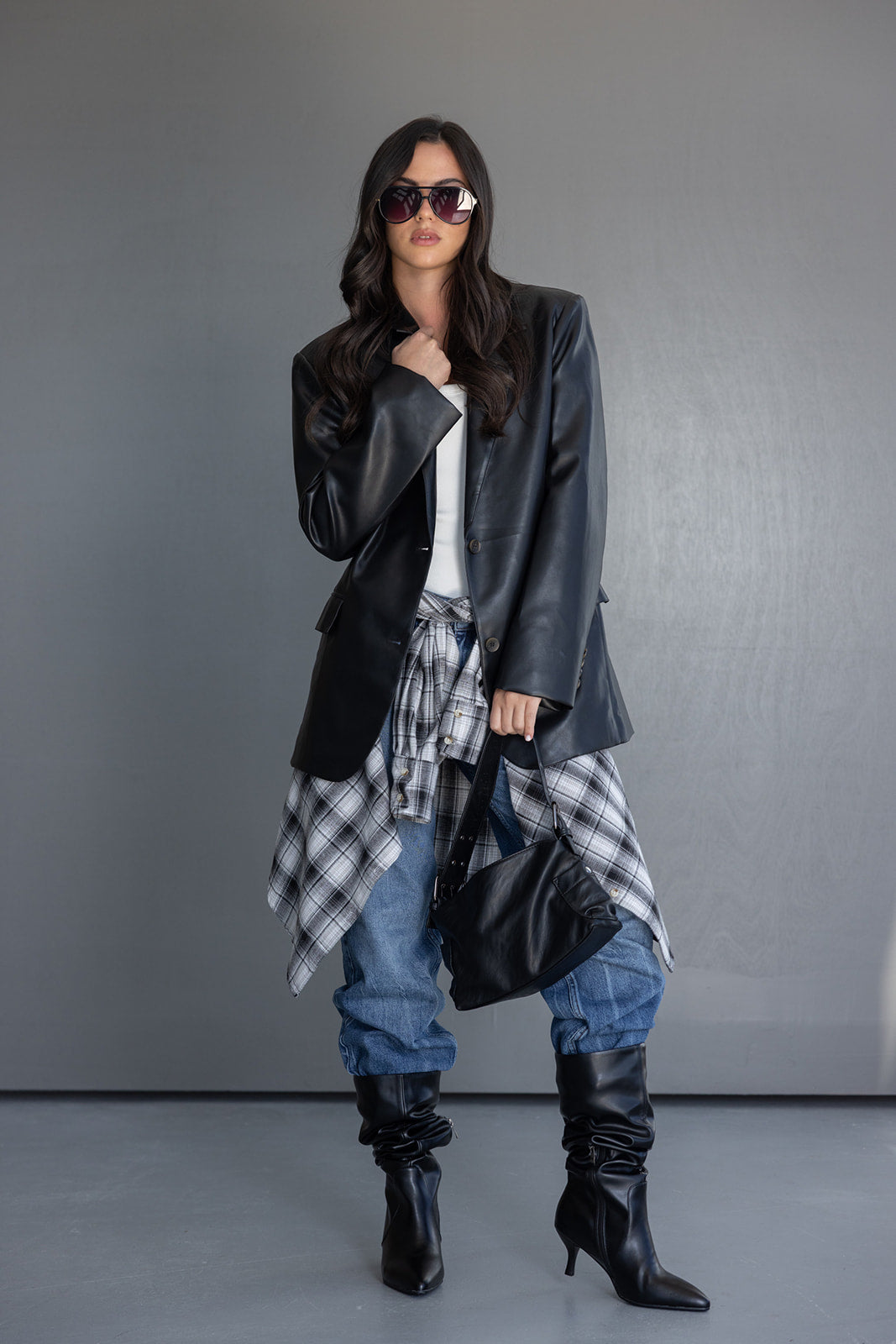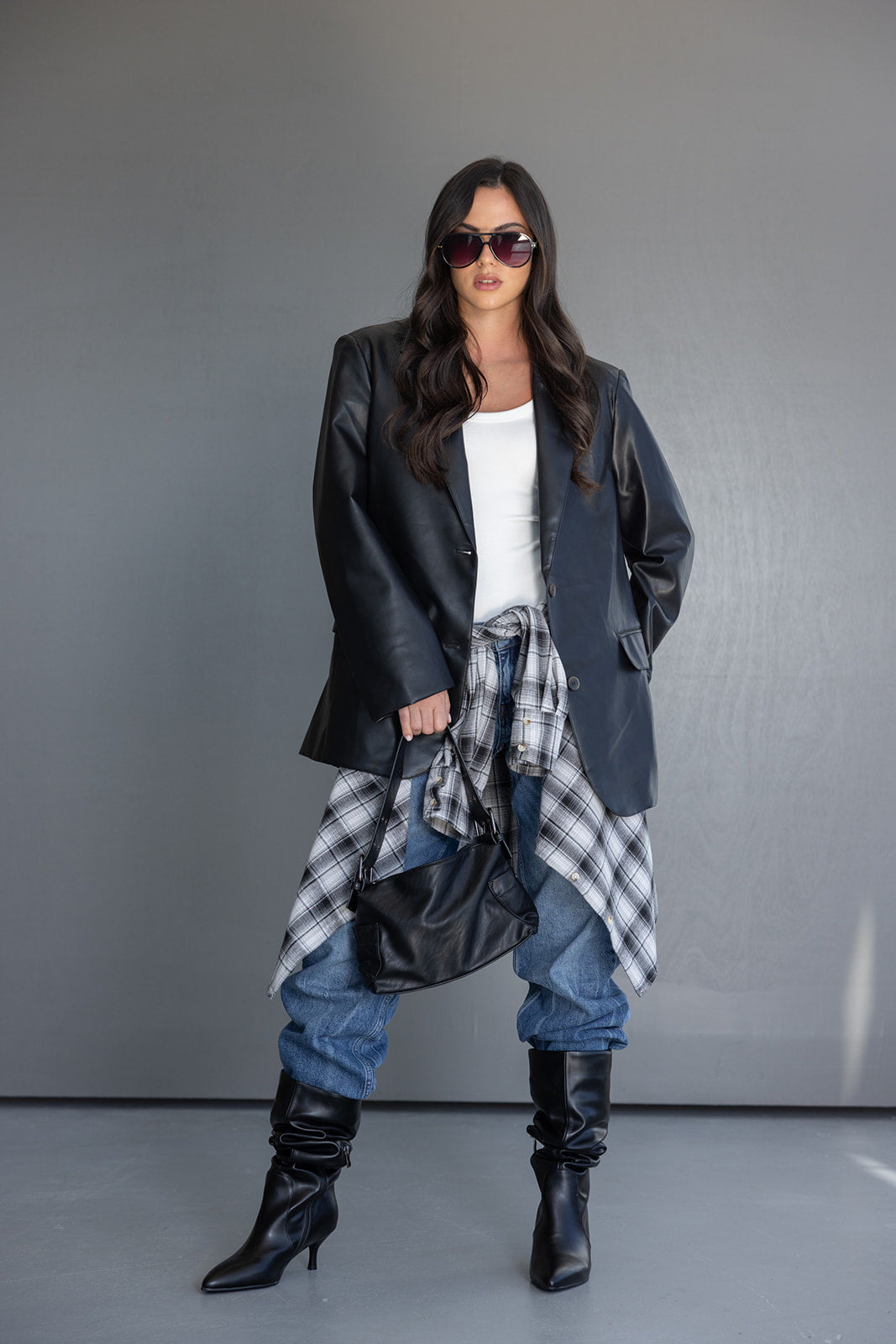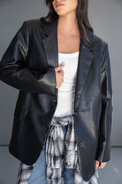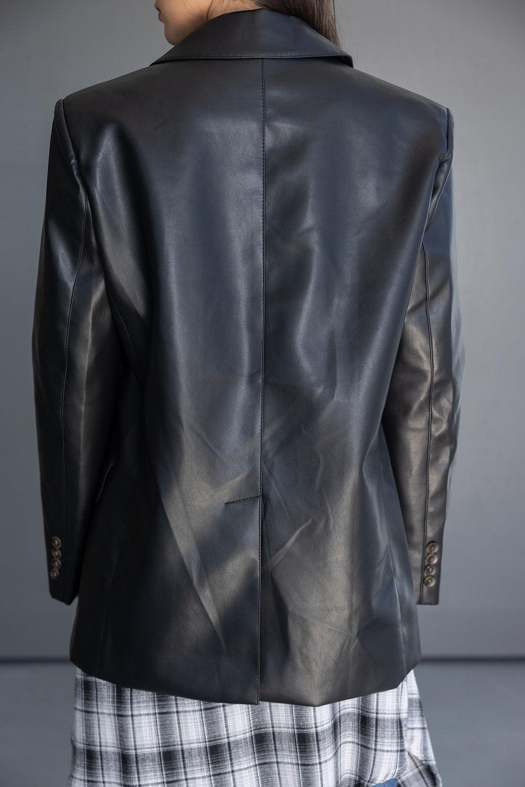 ג'קט דמוי עור מחויט קלאסי בגזרה מדויקת, בשילוב כפתורים ושני כיסי דמה.