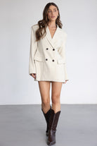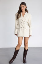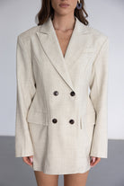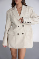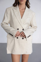 בלייזר בגזרה ארוכה עם מראה מחויט. עשוי בד מחוספס עדין, עם סגירת כפתורים כפולה וכיסים קדמיים. גזרת כתפיים מובנית שמעניקה מראה אלגנטי.