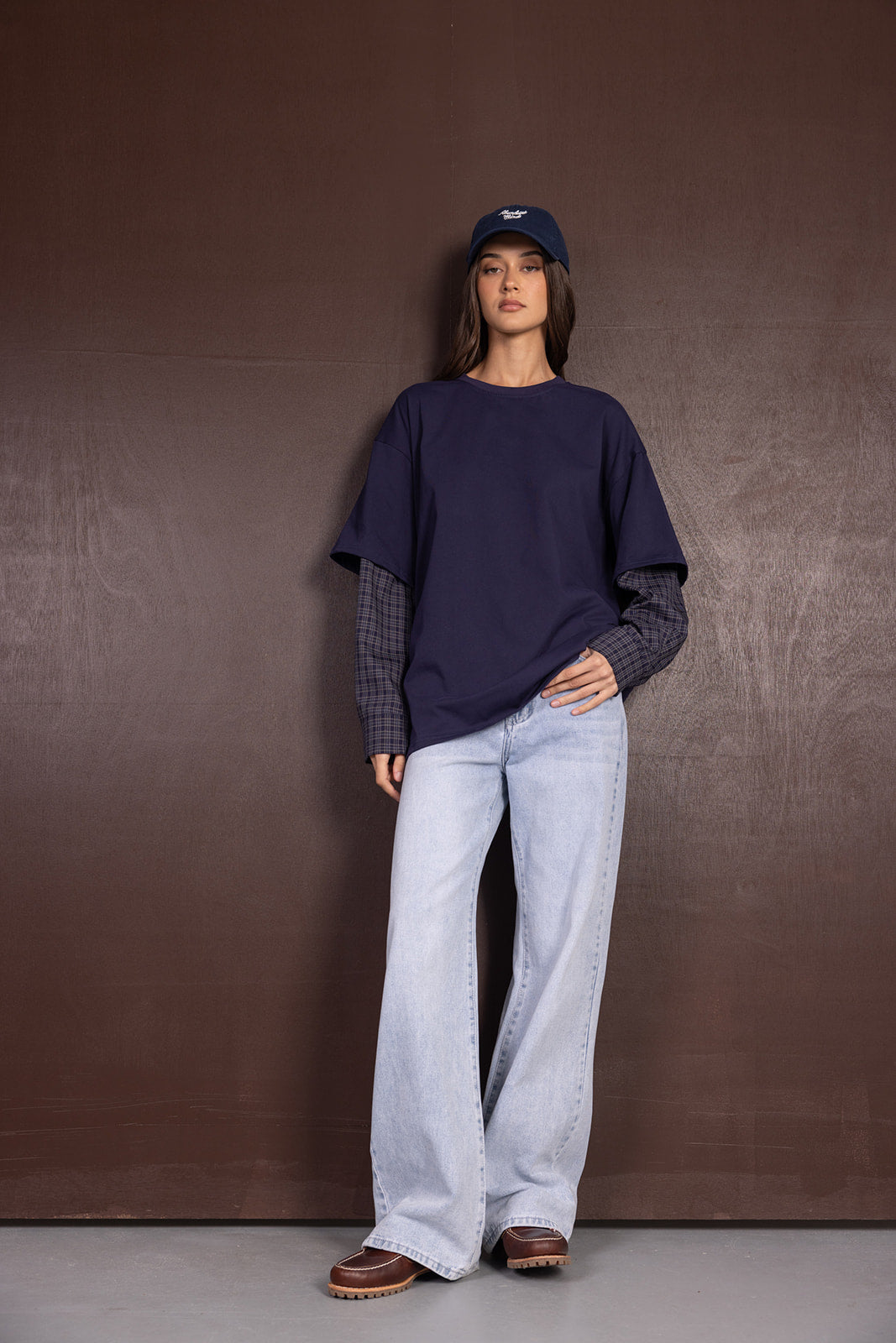 ג'ינס בגזרת מידי משוחררת ומתרחבת מעט. לג'ינס שני כיסים קדמיים ושני כיסים אחוריים, כפתור ורוכסן לסגירה.