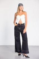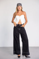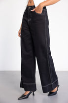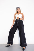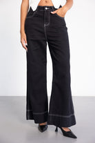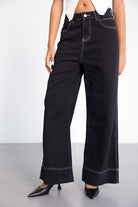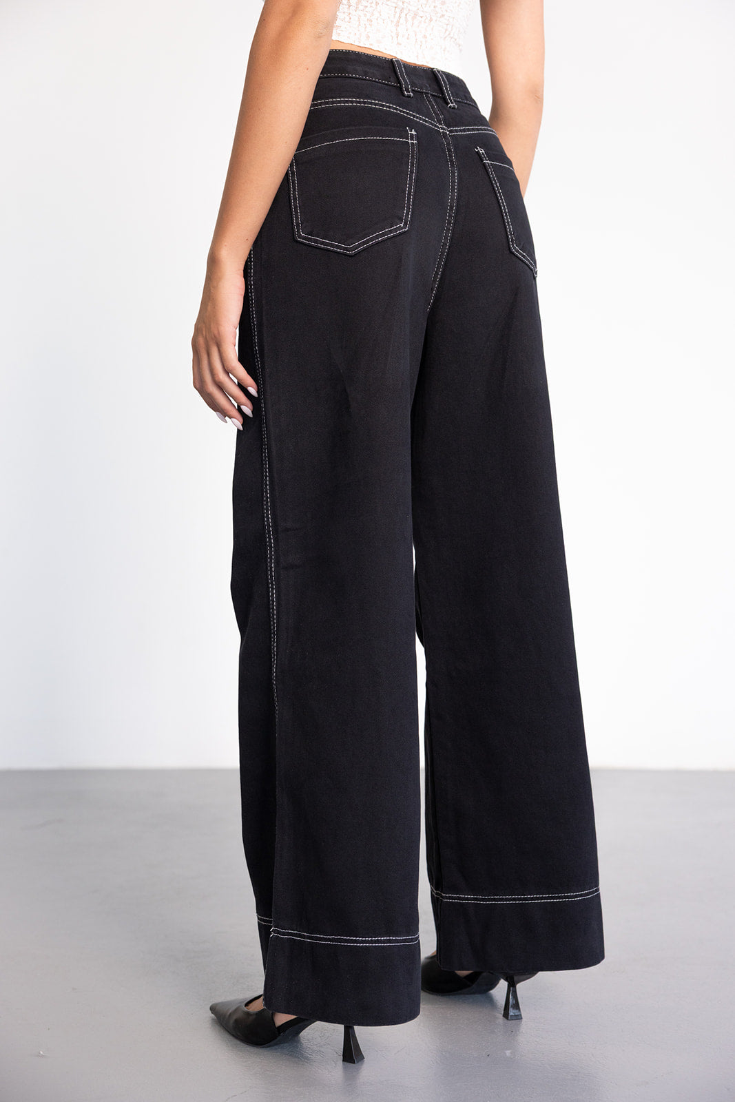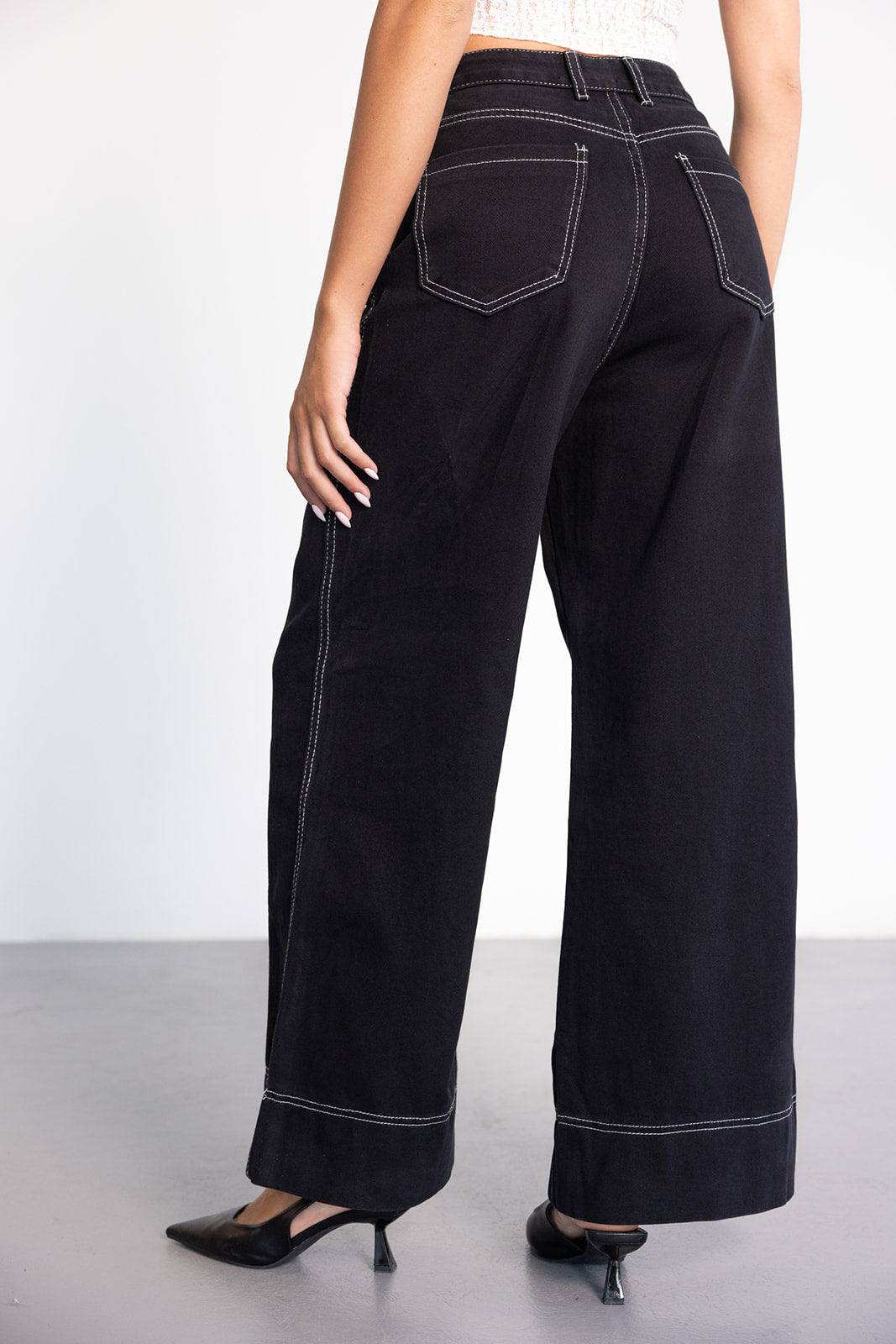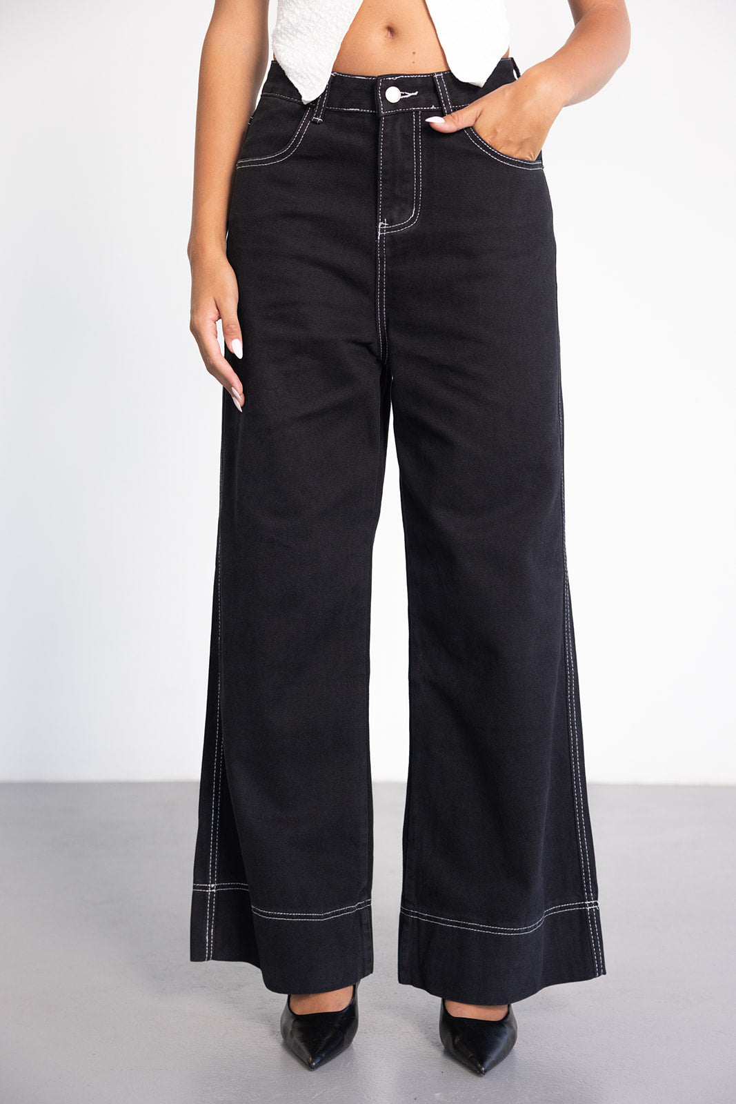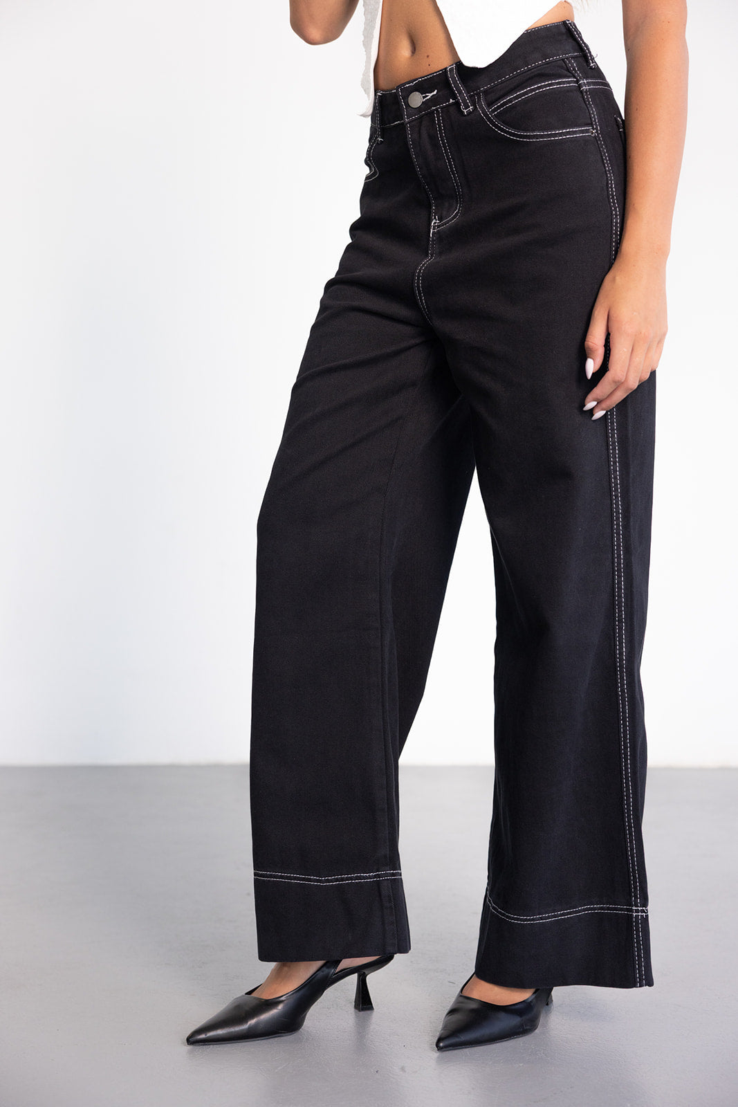 מכנס ג'ינס בגזרה ישרה מחמיאה וסיומת מתרחבת, בשילוב תפרים לבנים. לג'ינס שני כיסים קדמיים ושני כיסים אחוריים.