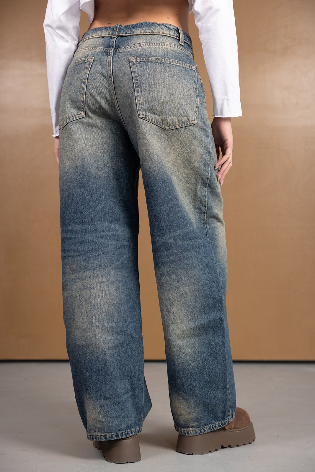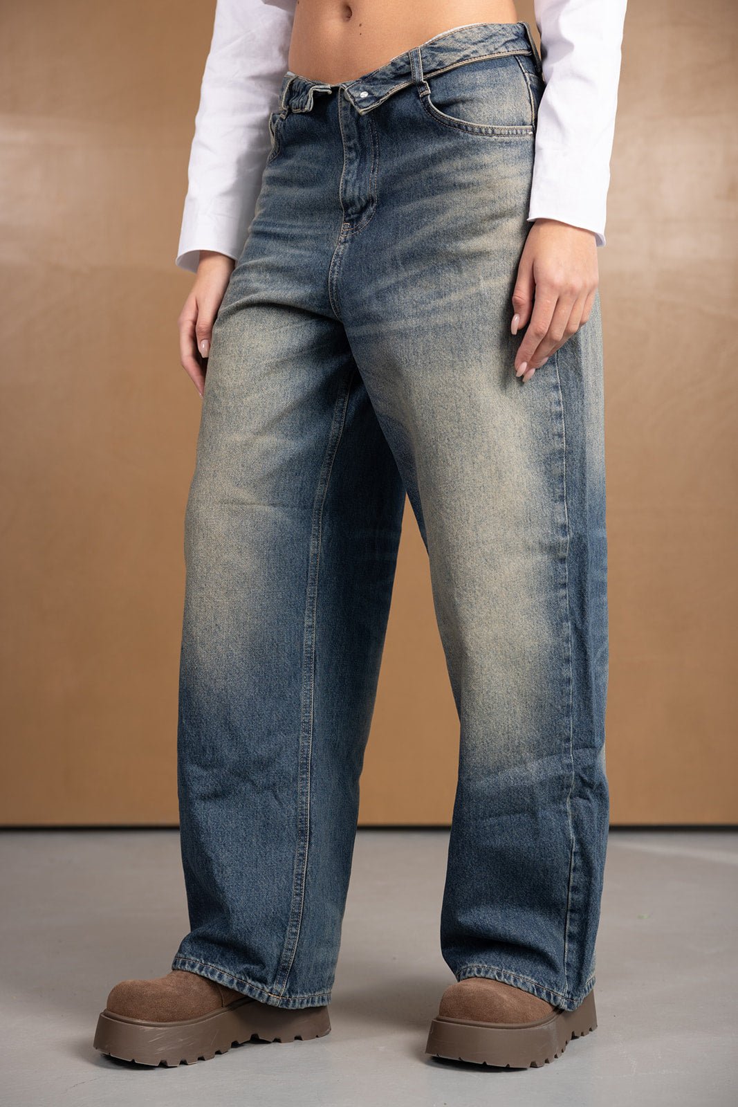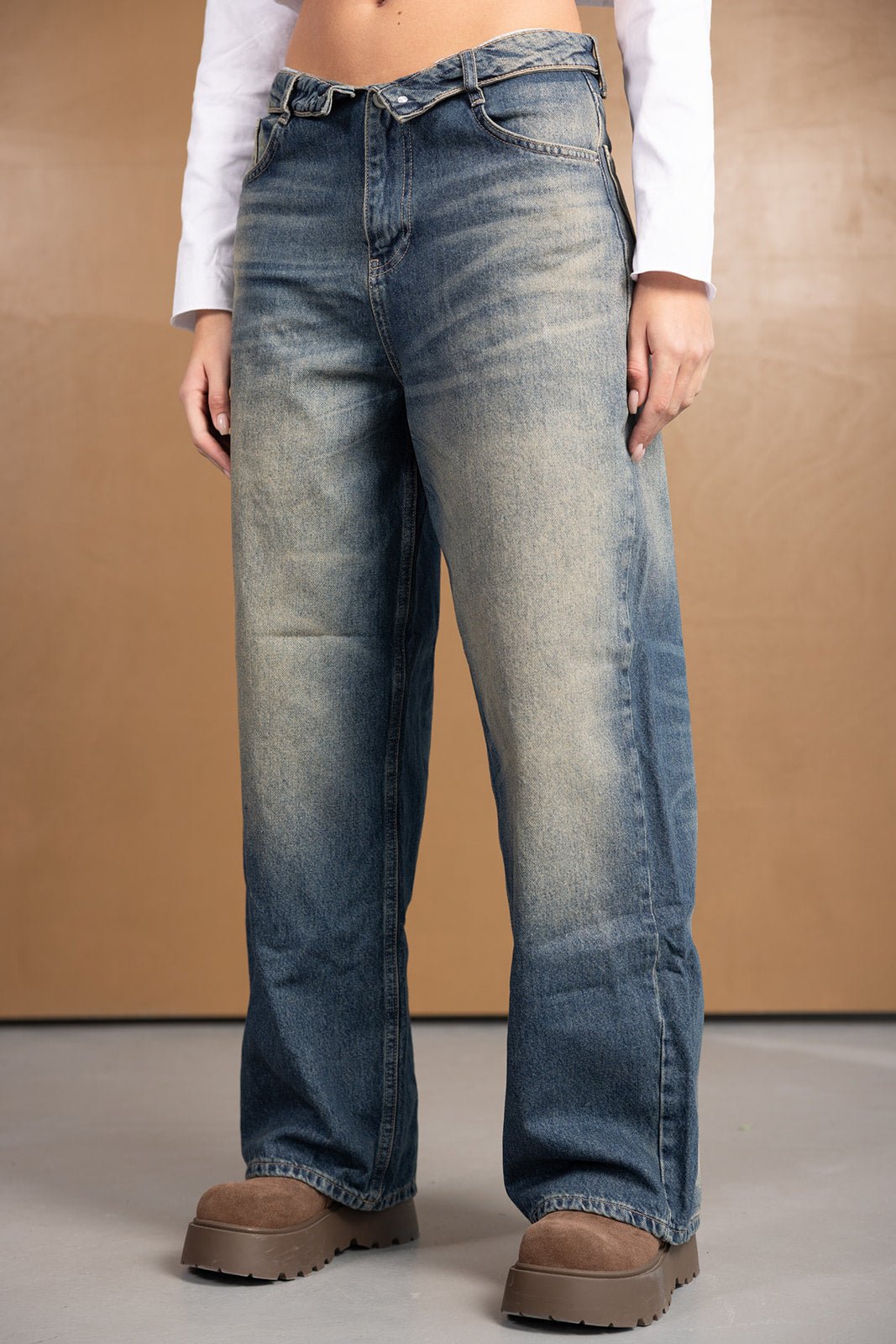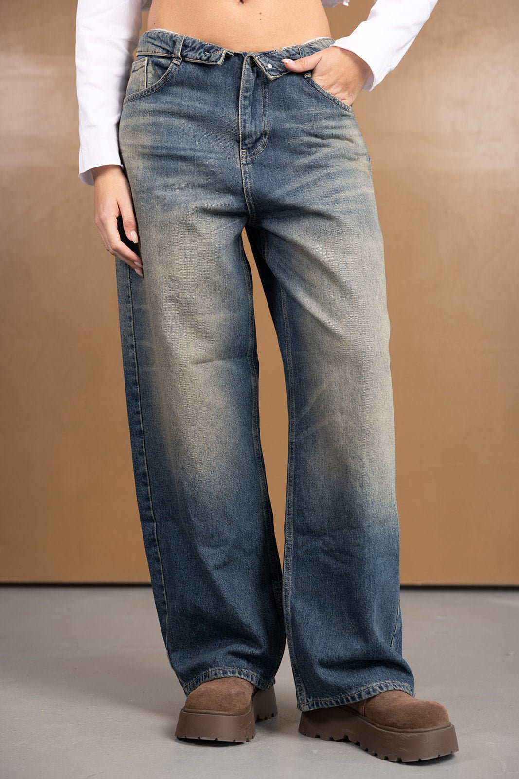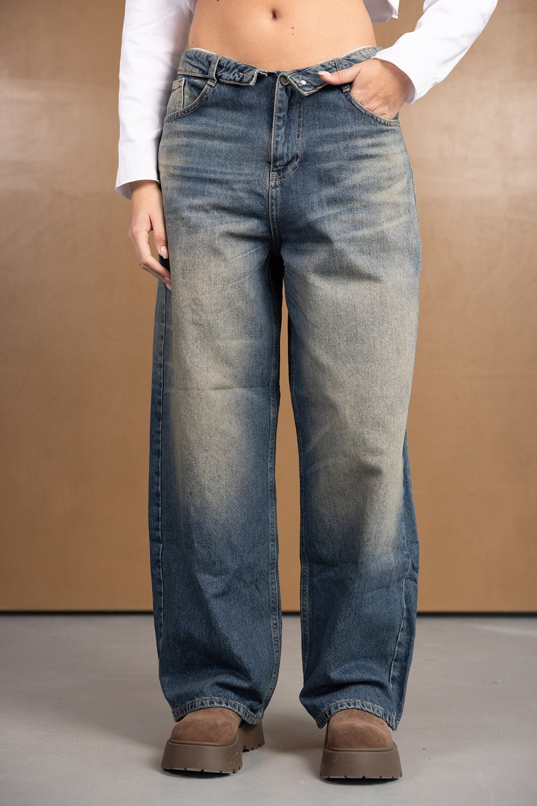 ג'ינס במראה טרנדי בגזרה רחבה ונמוכה, בשילוב כיפול בחלק העליון של הג'ינס. לג'ינס שני כיסים קדמיים ושני כיסים אחוריים, כפתור ורוכסן לסגירה.