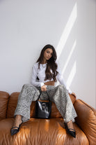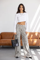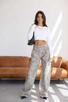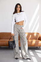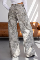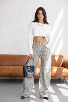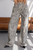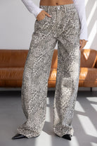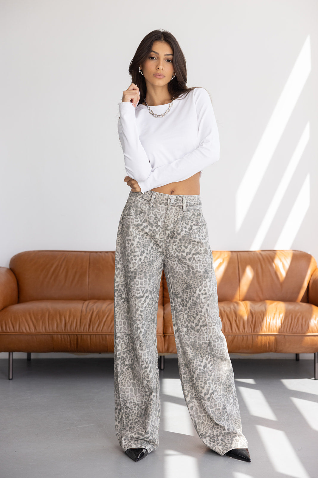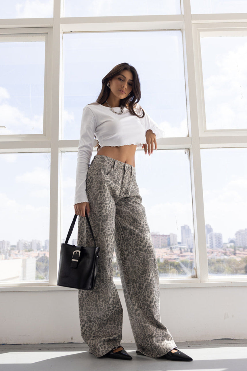 מכנס ג'ינס בגזרה מעט רחבה ומחמיאה ביותר, בשילוב דוגמה מנומרת טרנדית. לג'ינס שני כיסים קדמיים ושני כיסים אחוריים.