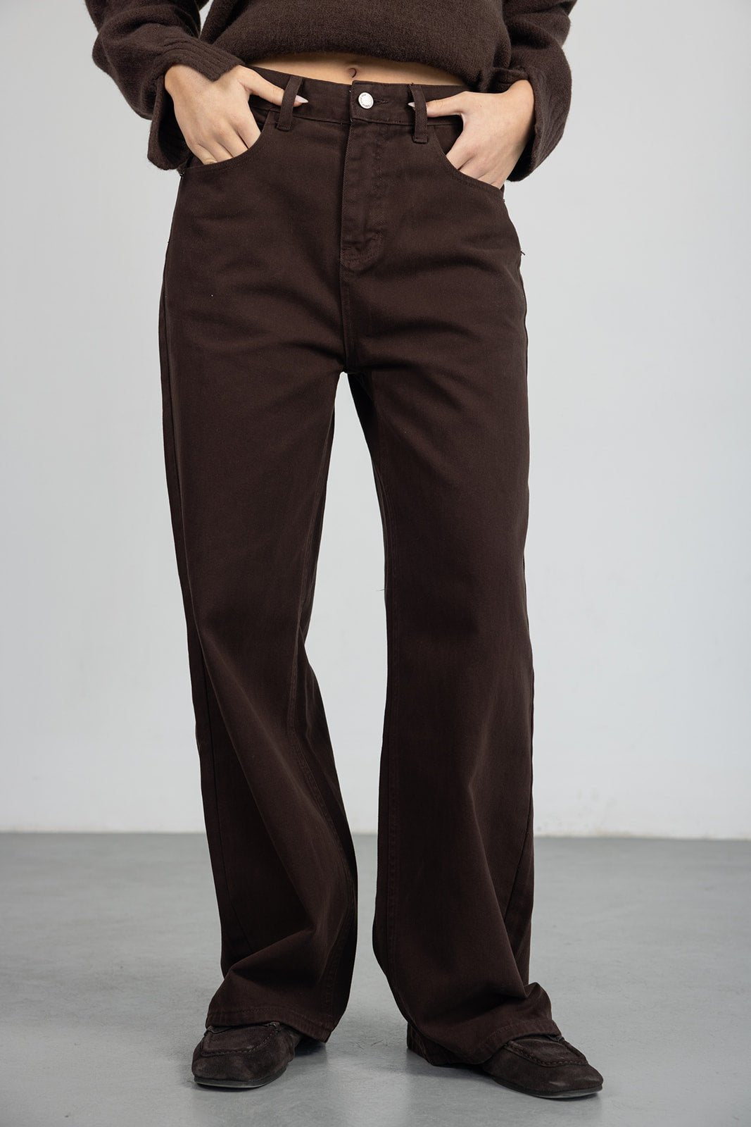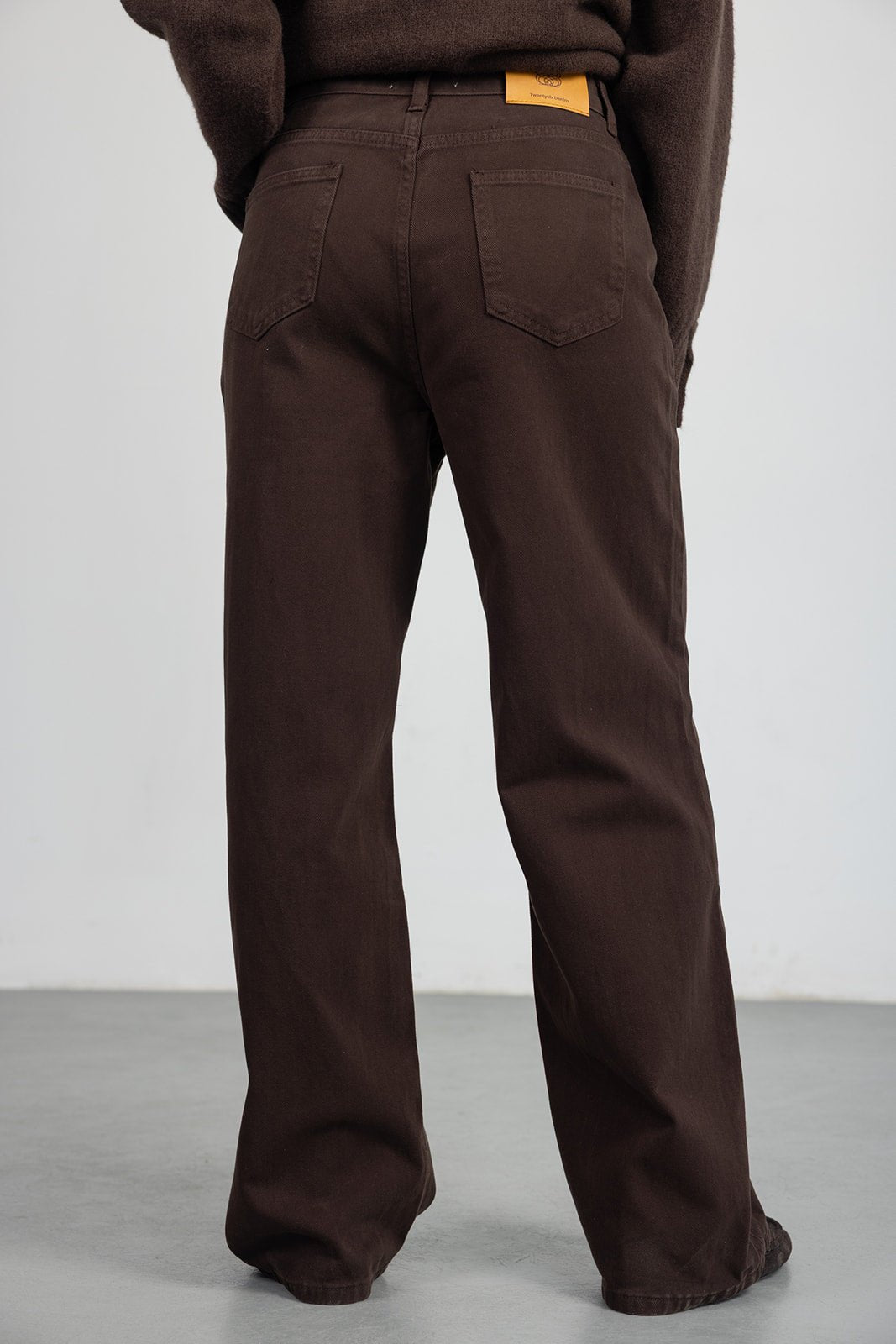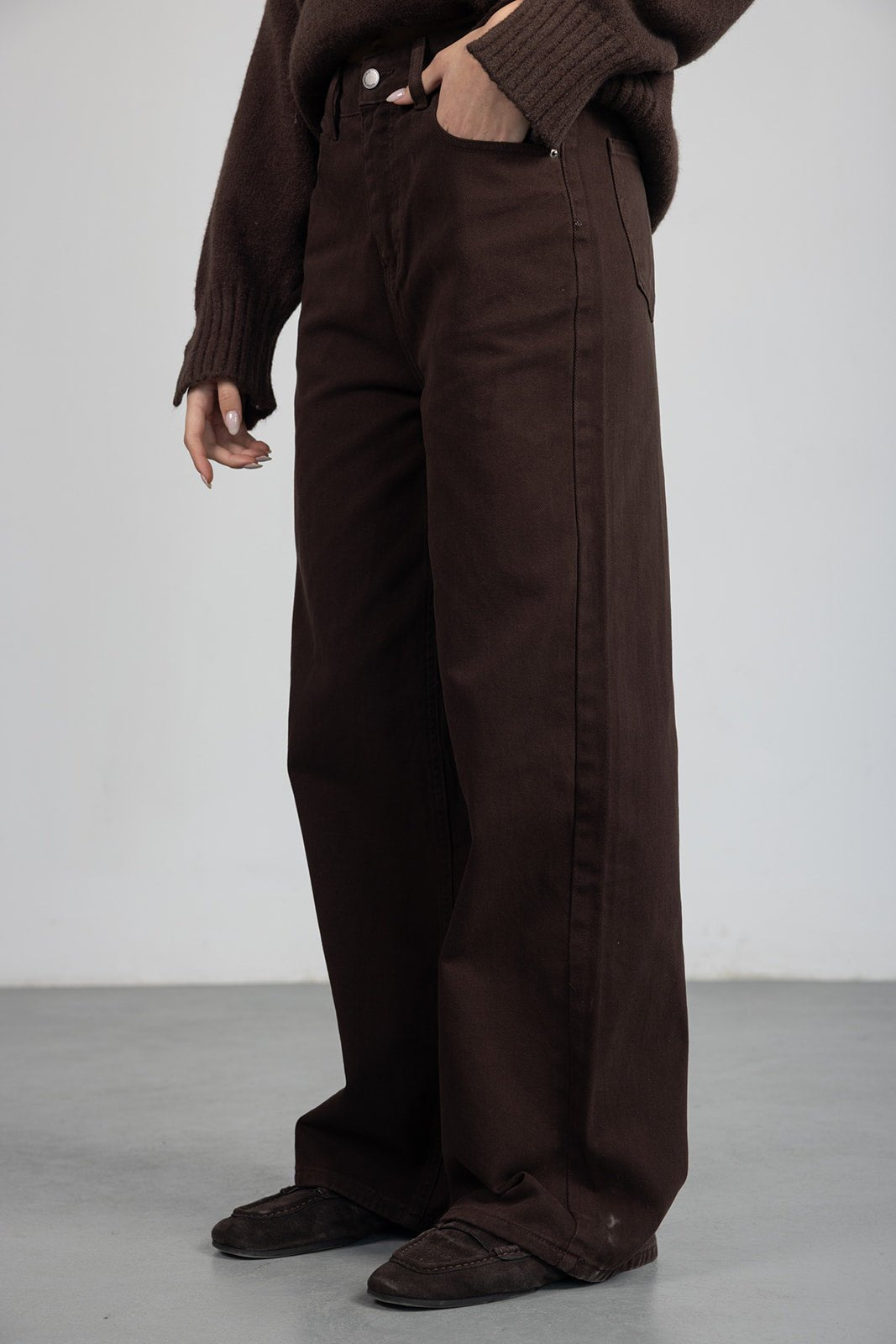 ג'ינס בצבע חום החם לעונה הקרובה, בגזרת מידי משוחררת ומתרחבת מעט. לג'ינס שני כיסים קדמיים ושני כיסים אחוריים, כפתור ורוכסן לסגירה.