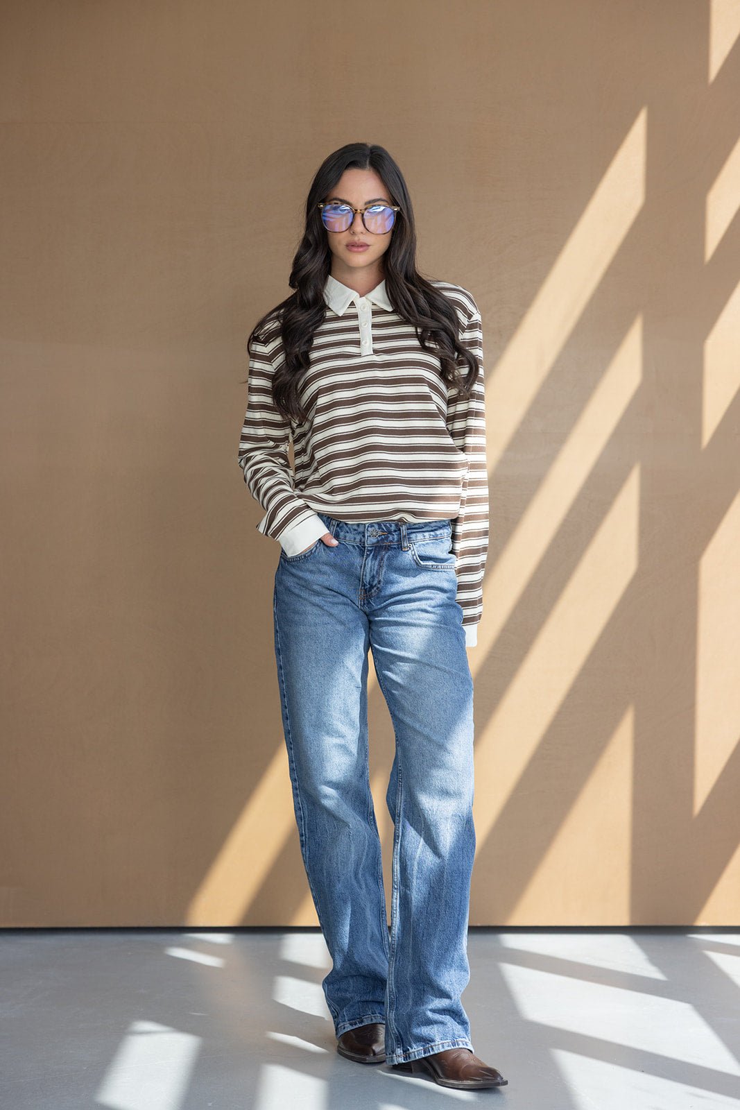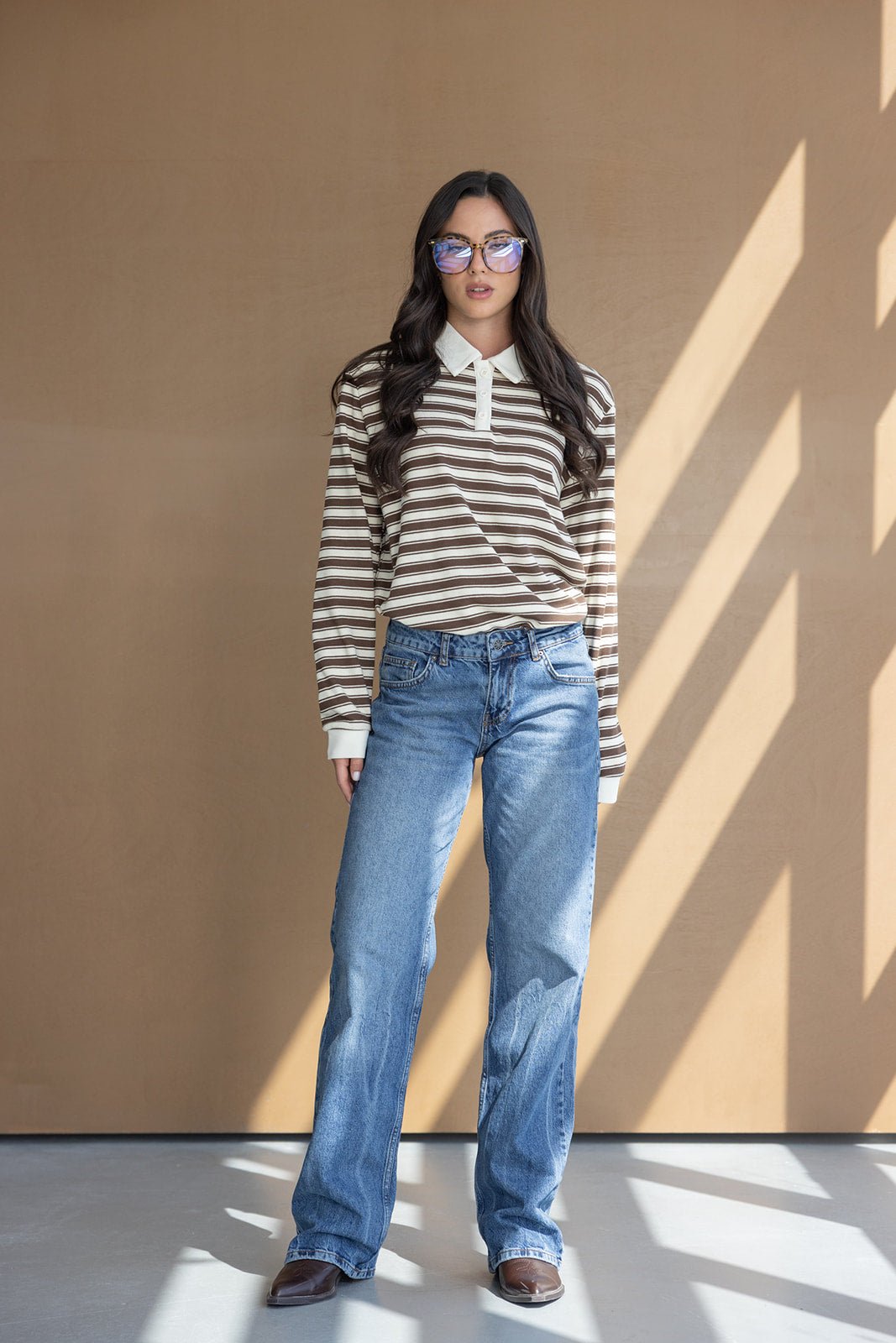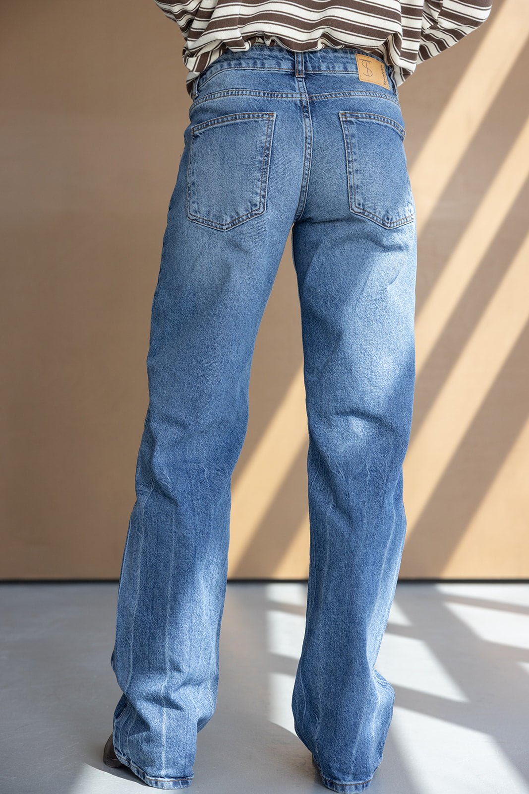מכנס ג'ינס בגזרה נמוכה וישרה. לג'ינס שני כיסים קדמיים ושני כיסים אחוריים.