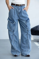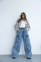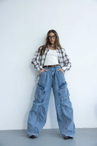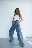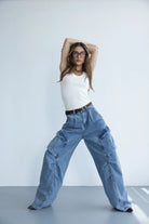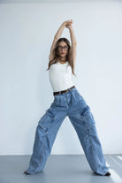 מכנס דגמ"ח ג'ינס בגזרה משוחררת עם מותן גבוהה בשילוב רוכסן, כפתור וכיסים קדמיים ואחוריים.