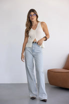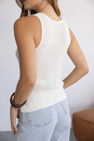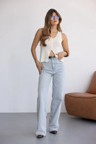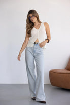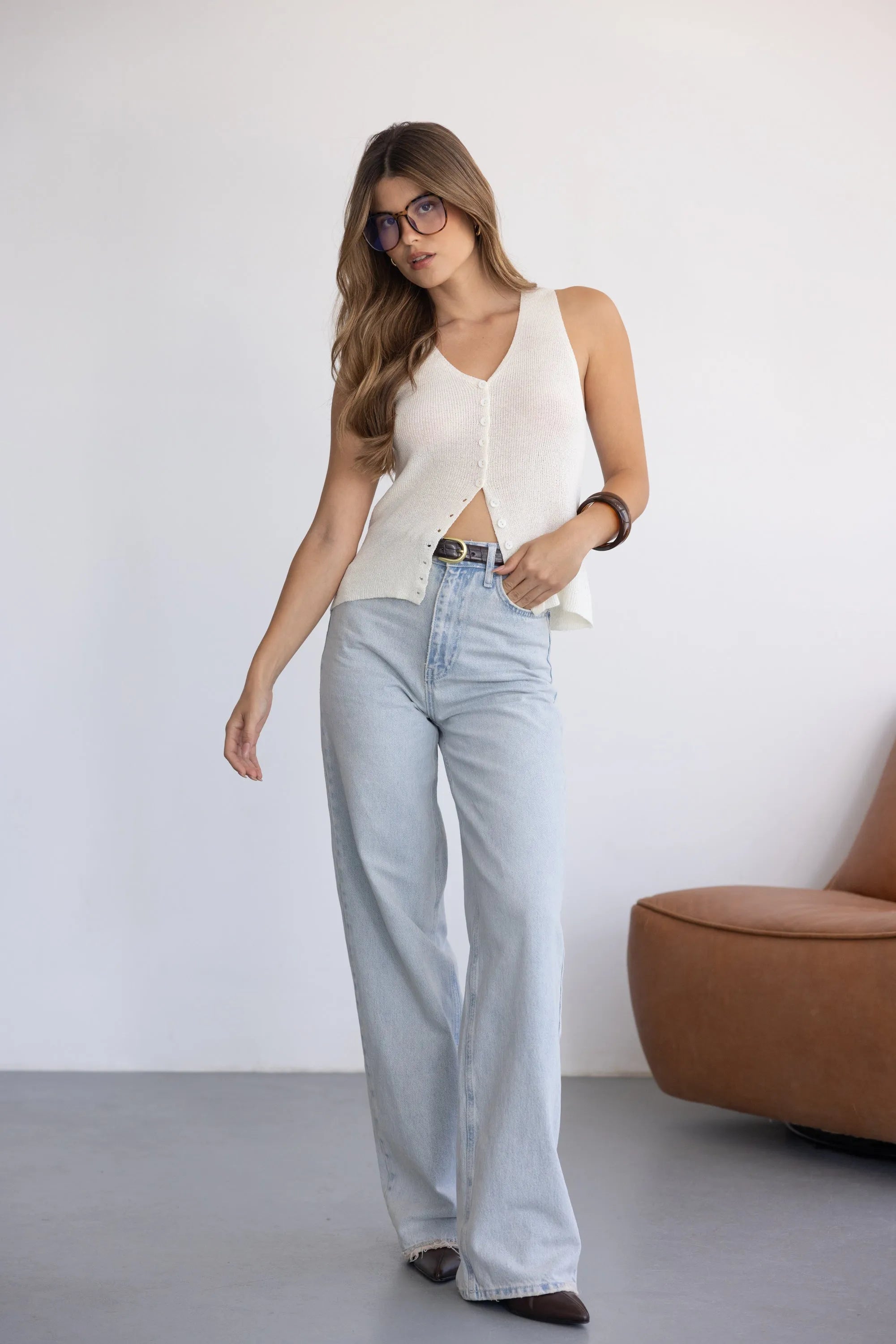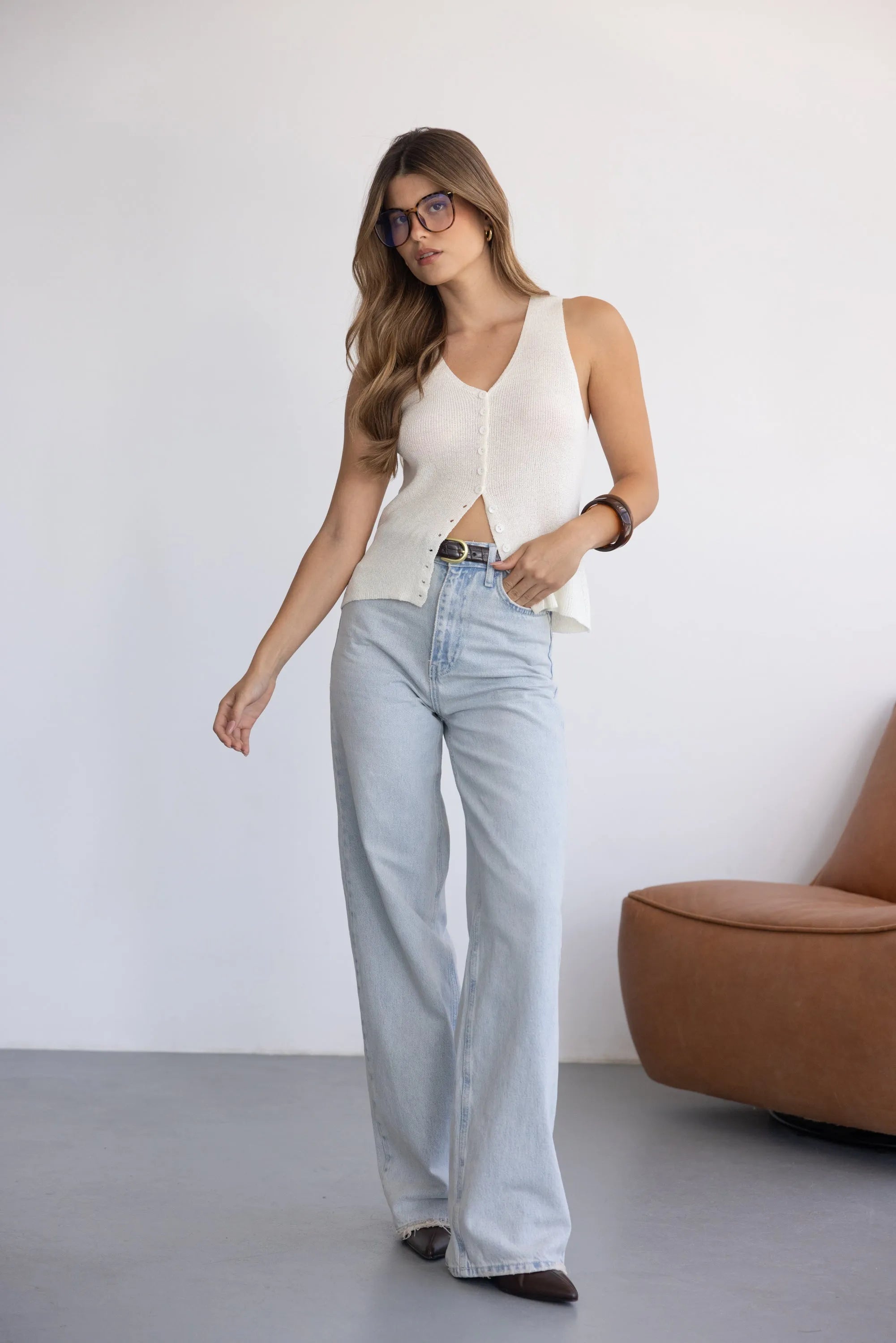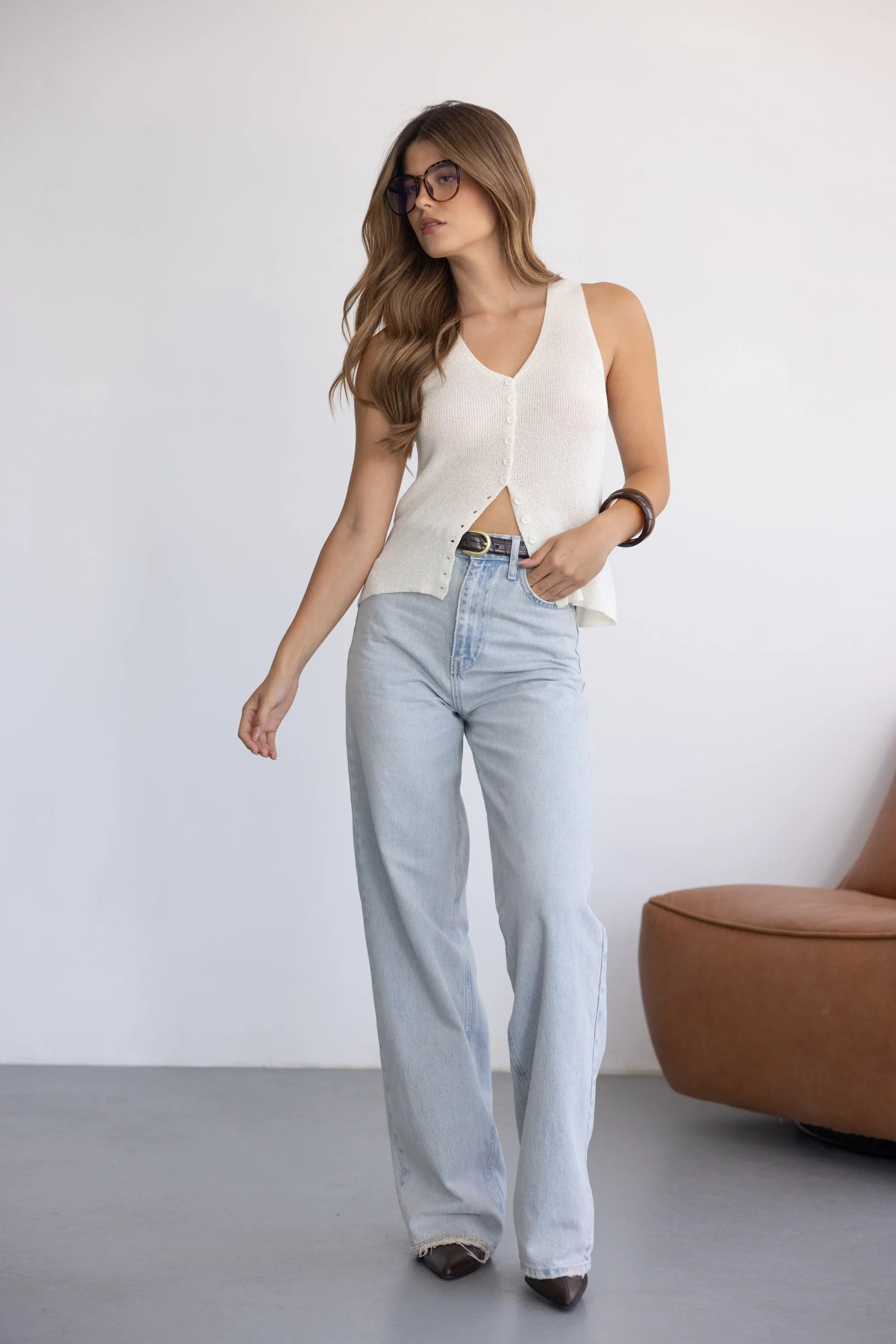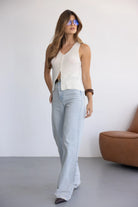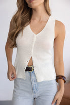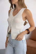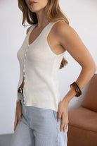 גופיית סריג בגזרה מחמיאה וקלילה בשילוב מפתח וי וכפתורים לכל אורך הגופייה.