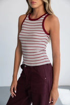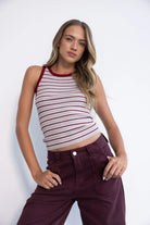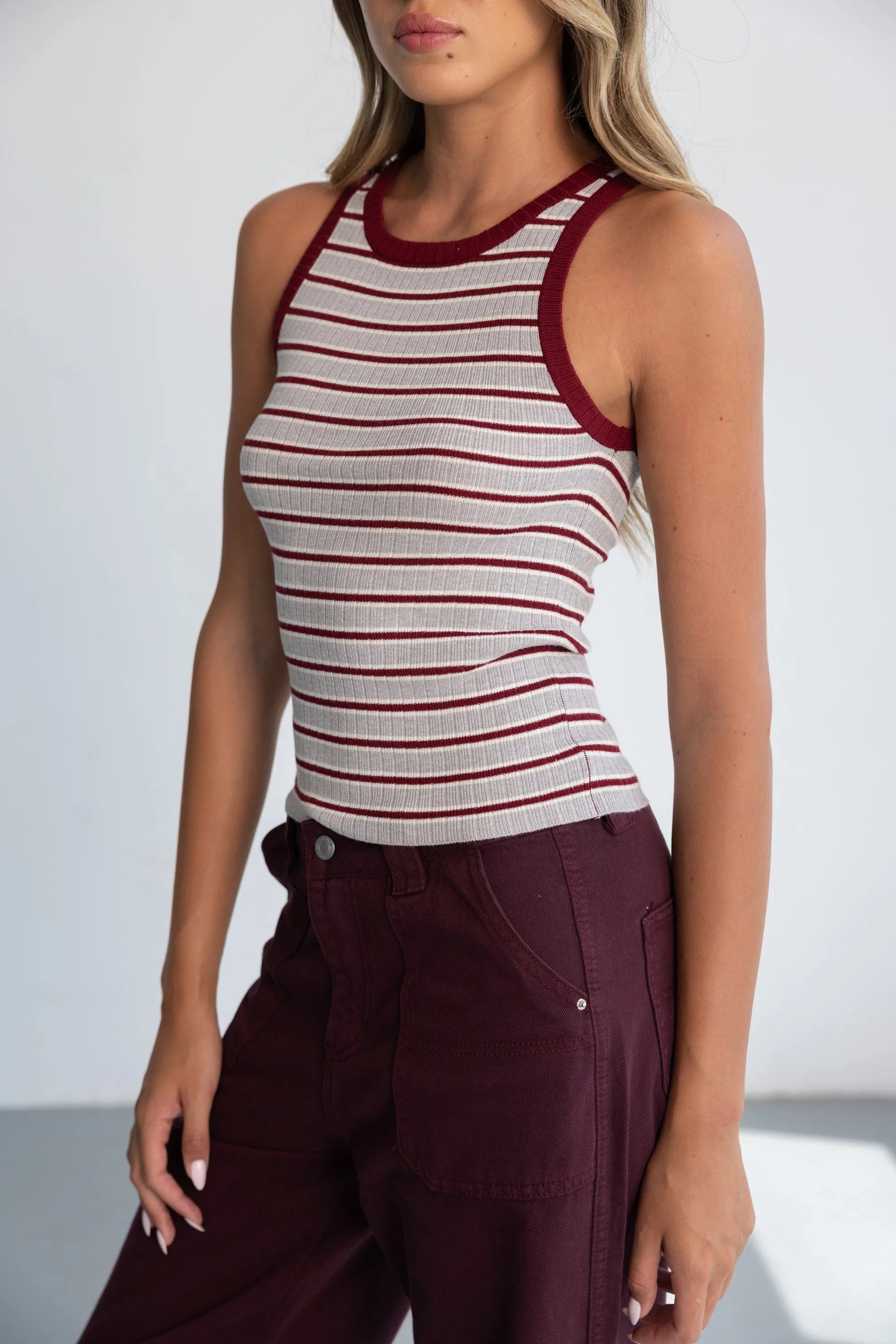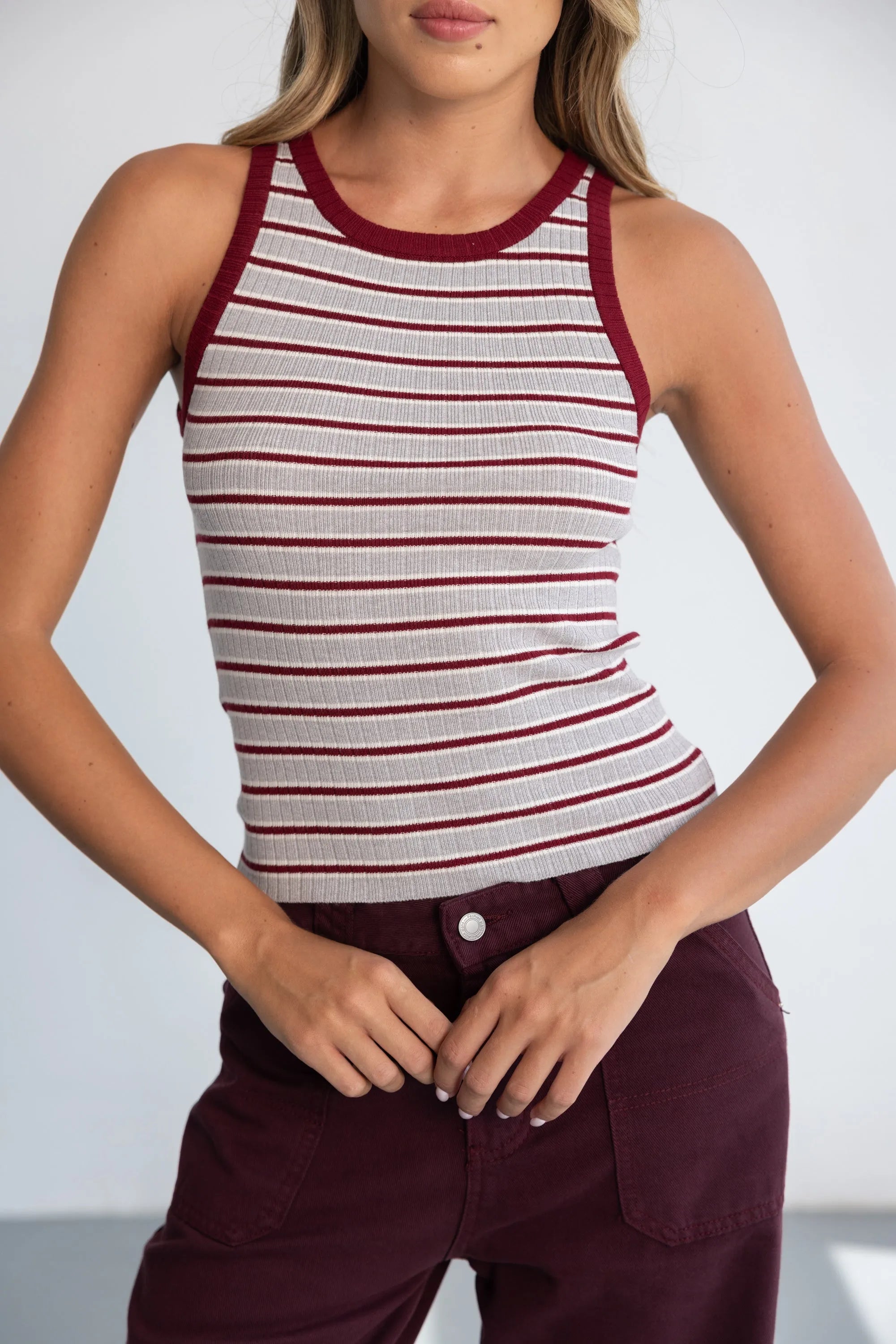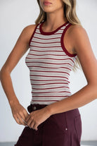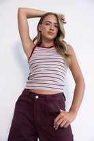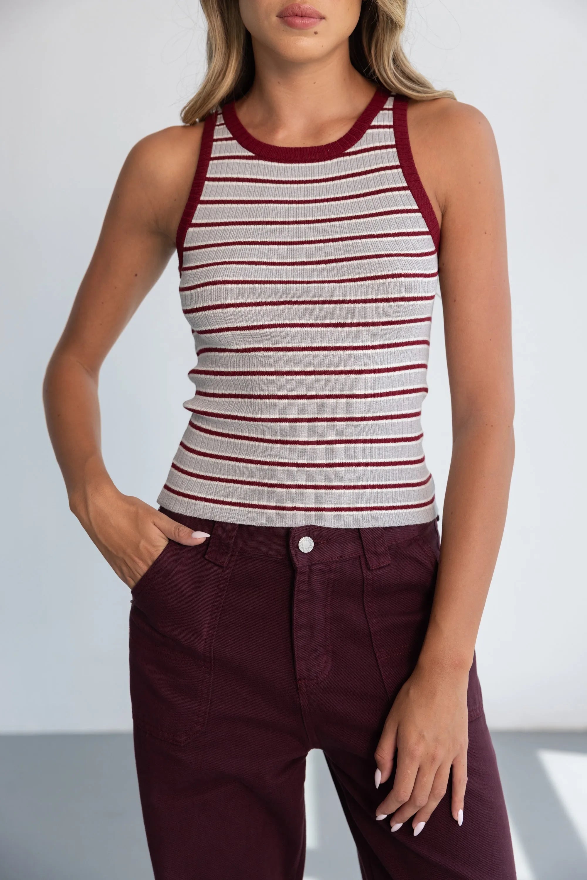 גופיית סריג עם מפתח צוואר עגול, בשילוב דוגמת פסים לרוחב הגופייה. גזרה צמודה ונוחה שמחמיאה לגוף.