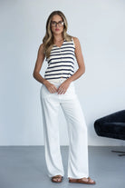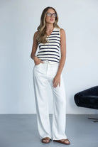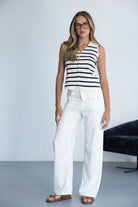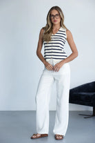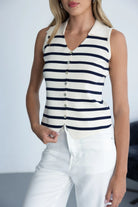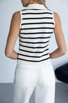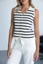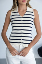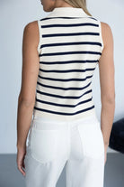 גופיית סריג במראה קלאסי מבד איכותי ובגזרה צמודה ומחמיאה. בשילוב צווארון פולו, הדפס פסים לרוחב הגופייה וכפתורים לאורכה.