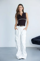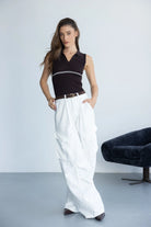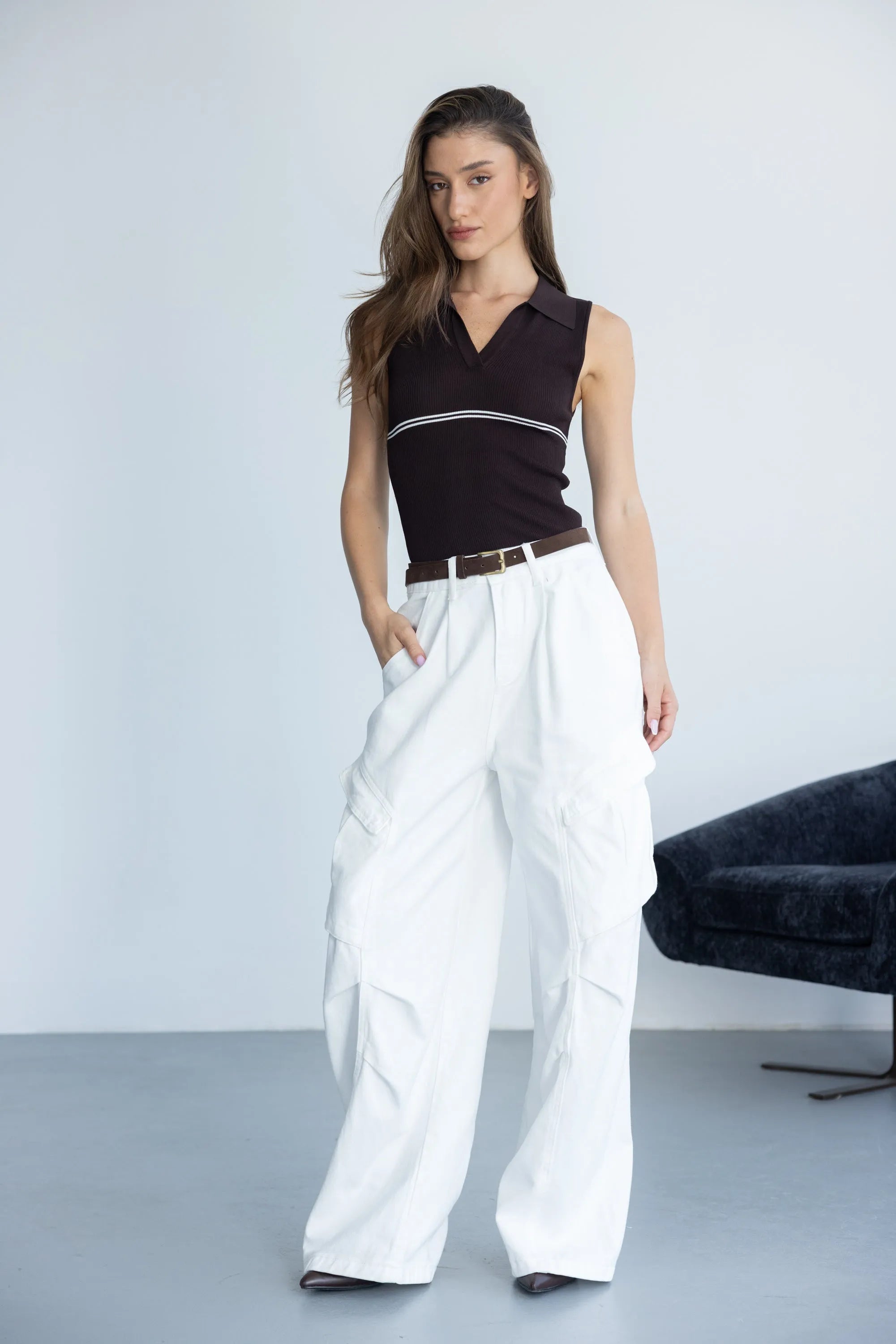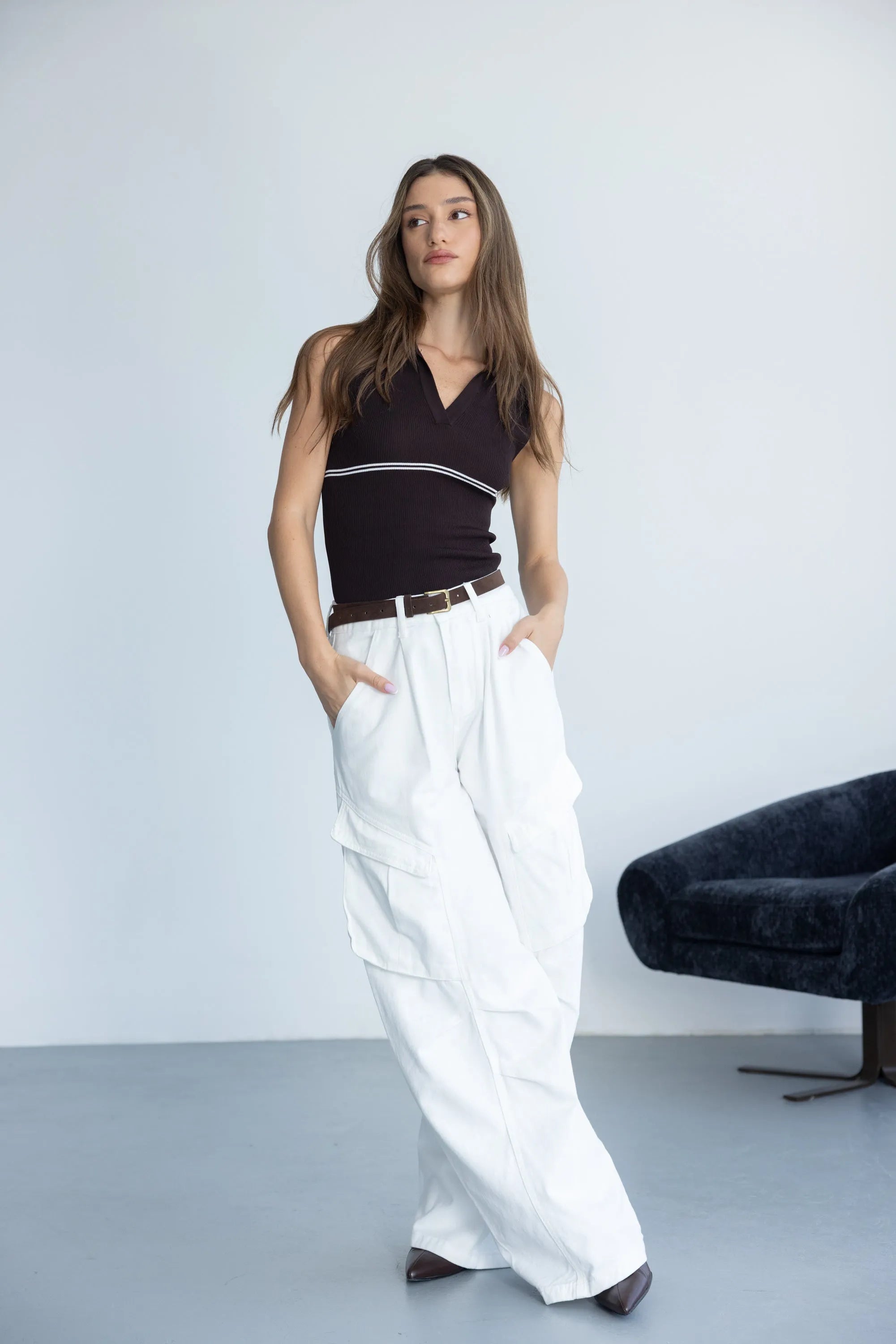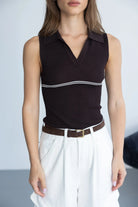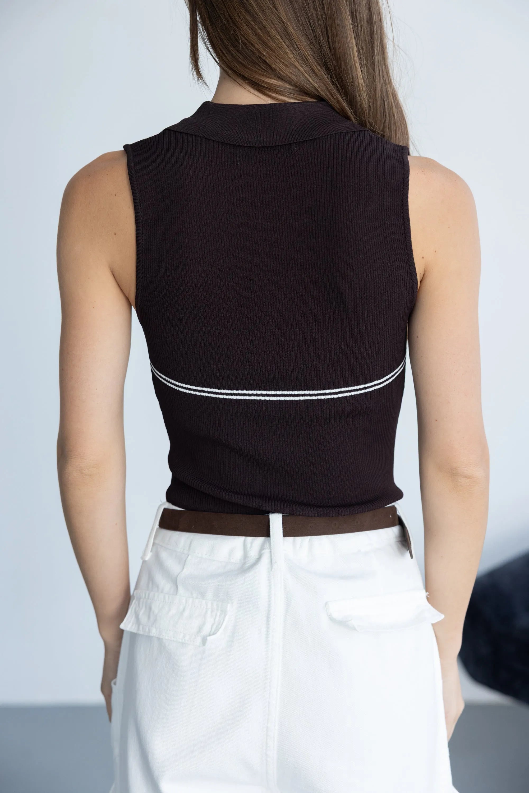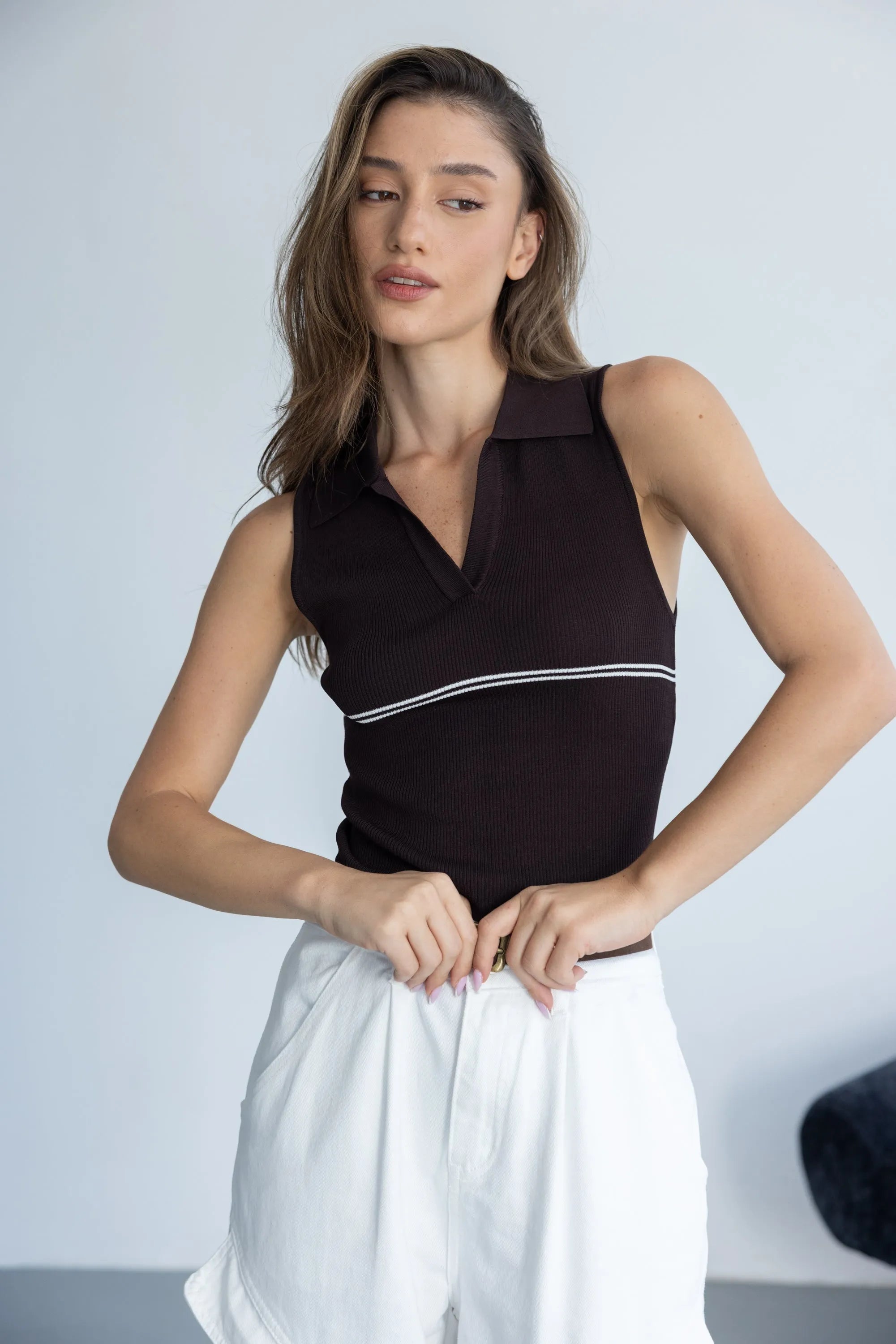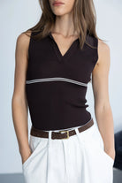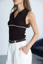 גופיית סריג בגזרה צמודה ומחמיאה, בשילוב מפתח צוואר וי, צווארון פולו קלאסי ודוגמת פסים עדינה.