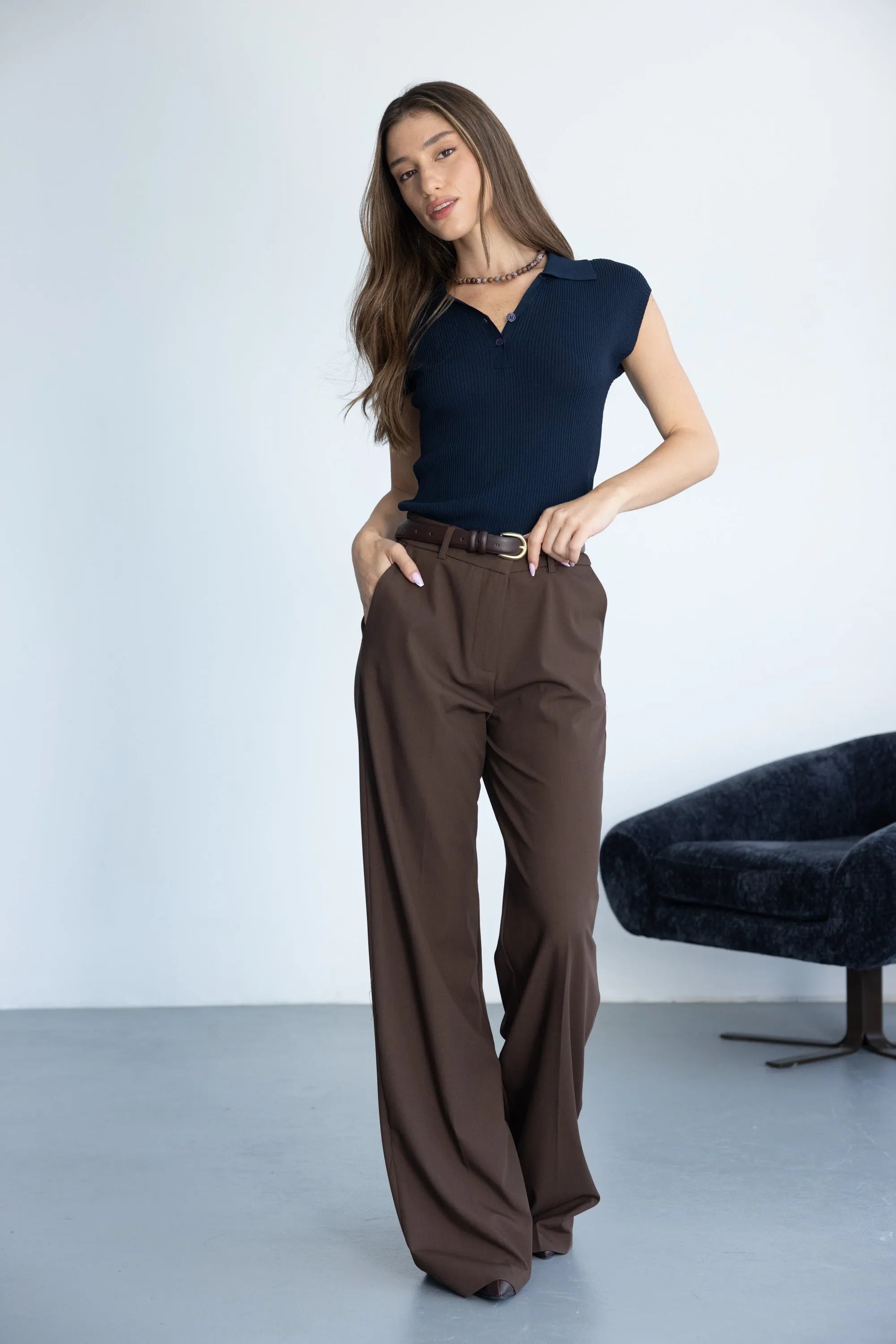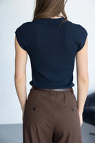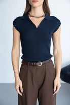 חולצת סריג מבד נעים ביותר וגזרה צמודה מחמיאה, בשילוב צווארון פולו קלאסי וזוג כפתורים.