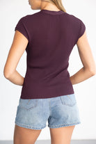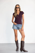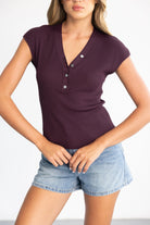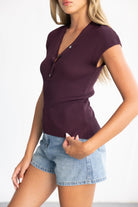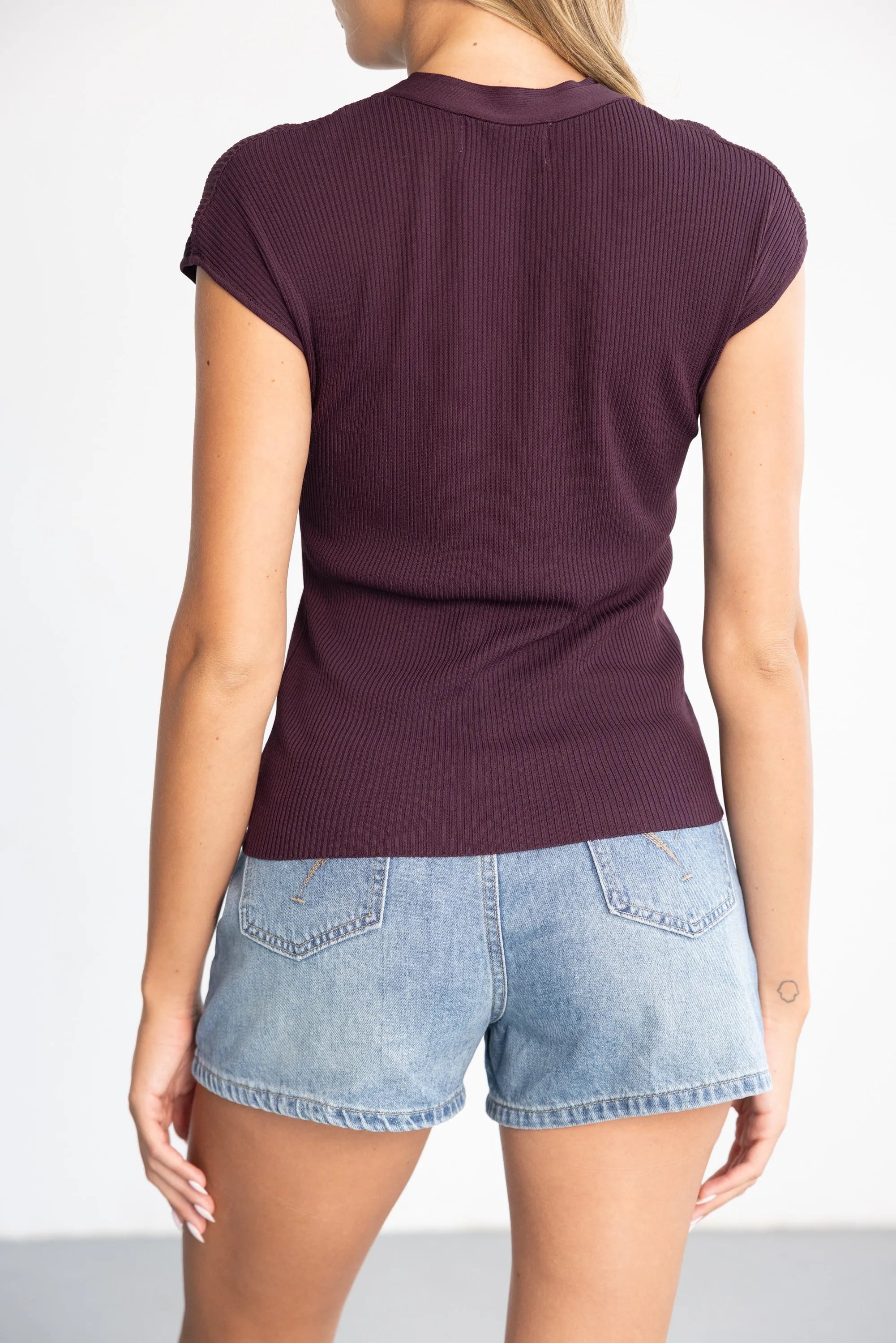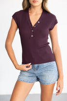 חולצת סריג בגזרה צמודה ומחמיאה, בשילוב מפתח צוואר וי וכפתורים לקישוט.