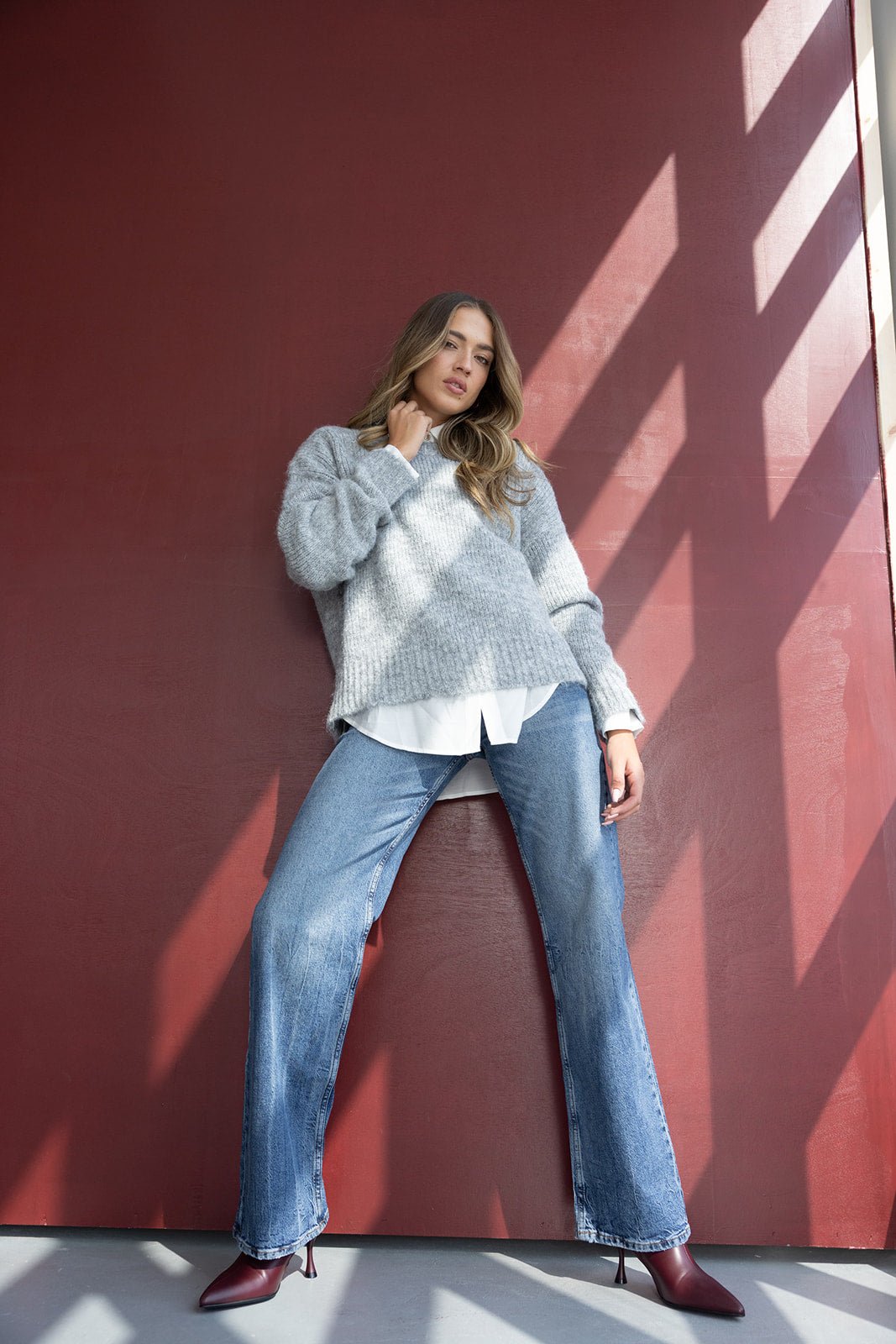 סריג אוברסייז בגזרה משוחררת, עשוי בד פלפי ורך במיוחד. מגיע עם צווארון עגול ושרוולים ארוכים.