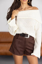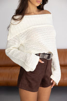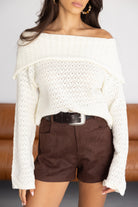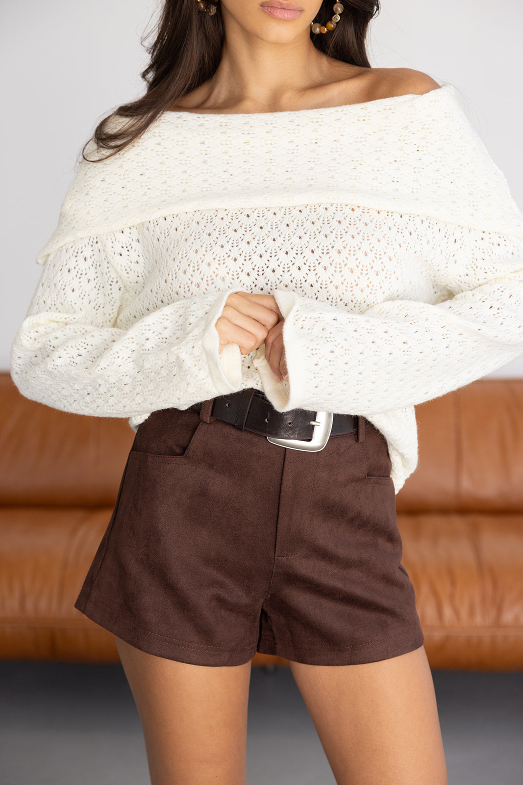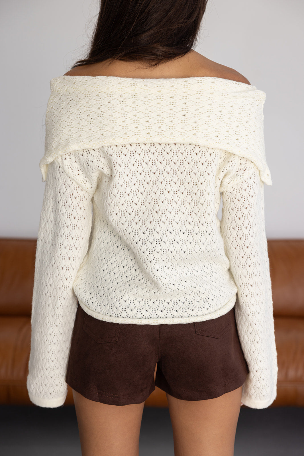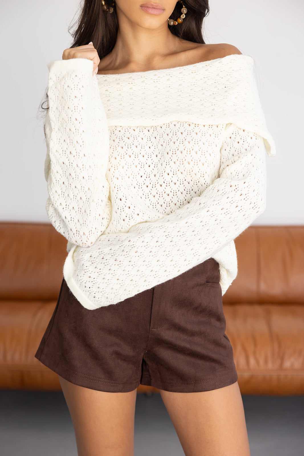 סריג בגזרה צמודה ומחמיאה, בשילוב כתפיים חשופות למראה טרנדי ושרוולים ארוכים מתרחבים מעט.