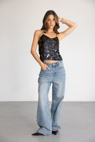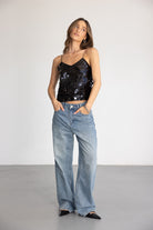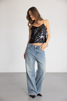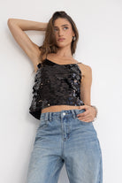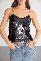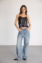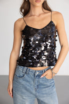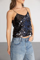 גופייה עם כתפיות דקות בשילוב פאייטים בוהקים. בגזרה ישרה וקצרה, עם מפתח וי עדין שמוסיף מראה אלגנטי וזוהר.