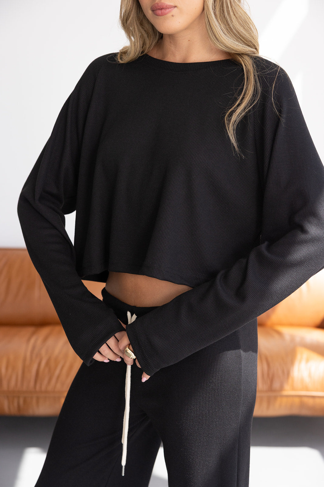 חולצה ארוכה בגזרת קרופ, נוחה ביותר מבד וופל נעים למגע, בגזרה ישרה ומשוחררת. לחולצה .שרוולים ארוכים המתאימים לעונה, צווארון עגול קלאסי וחור בשרוולים לכפפה