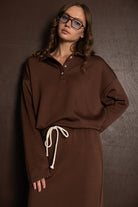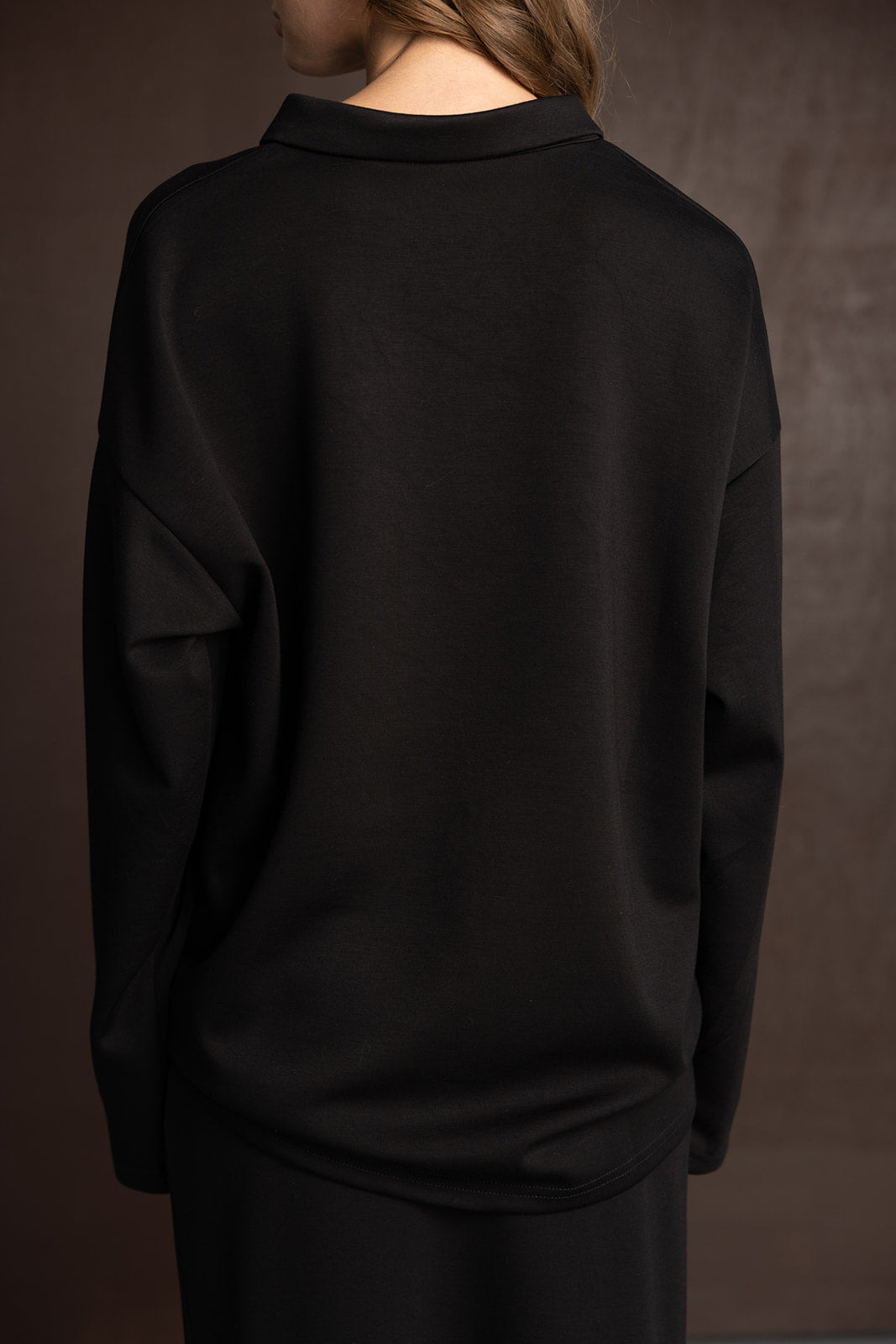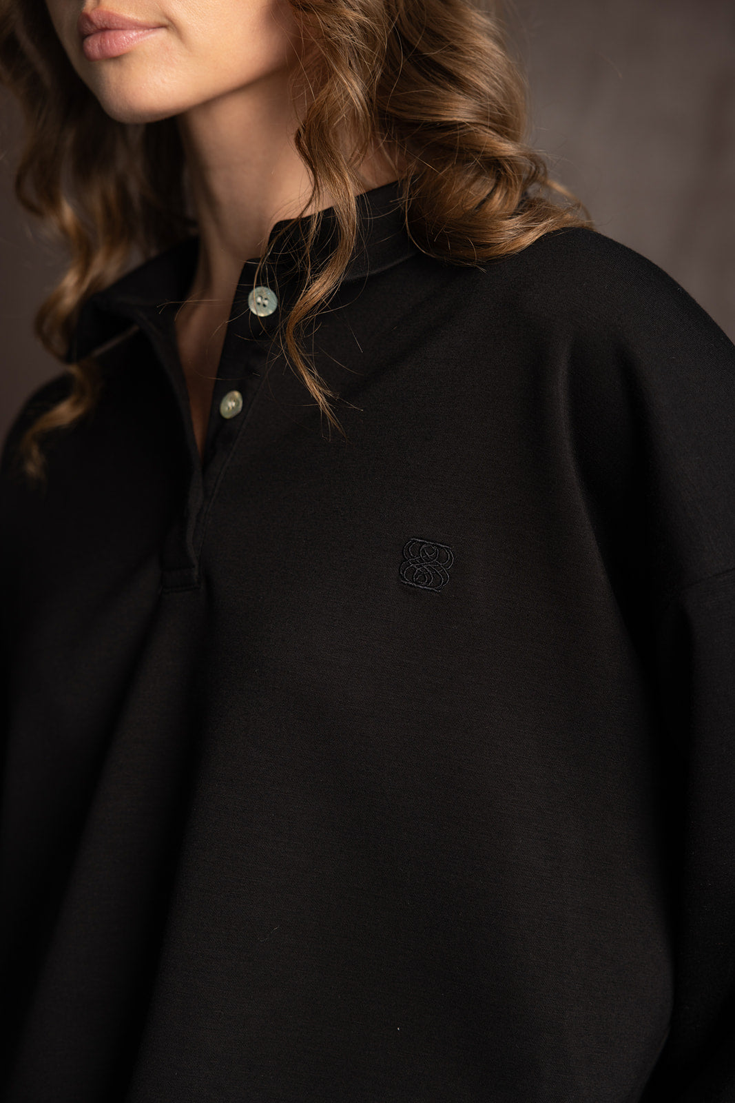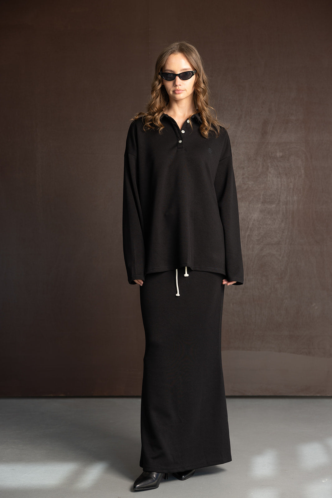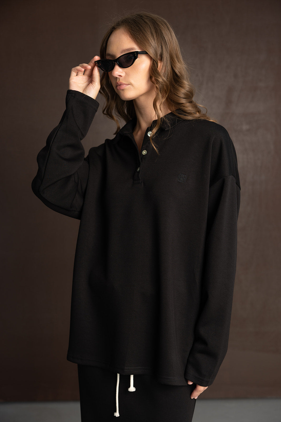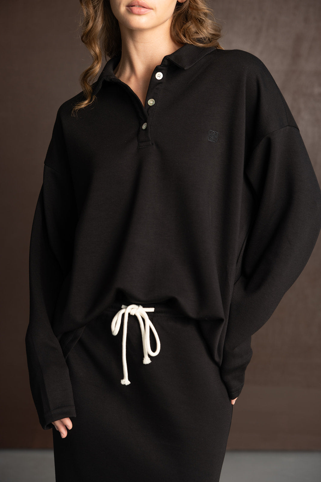חולצת פולו ארוכת שרוולים בגזרה מעט אוברסייז, עשויה מבד נעים ובגוון תואם לחצאית. הדגם כולל מפתח צווארון פולו עם כפתורים עדינים ושרוולים רחבים ליצירת מראה אלגנטי אך נינוח.