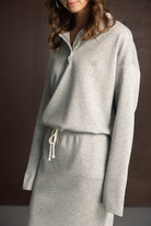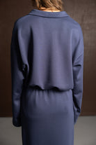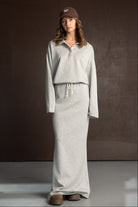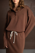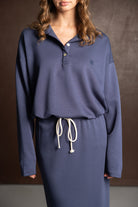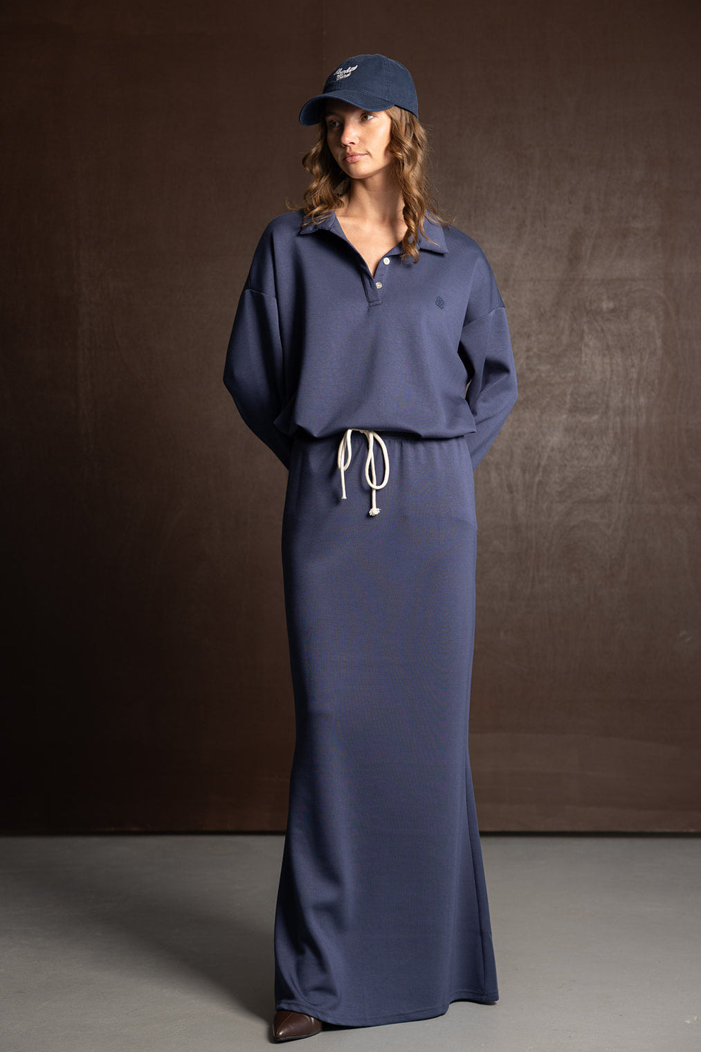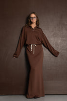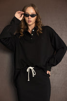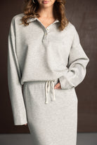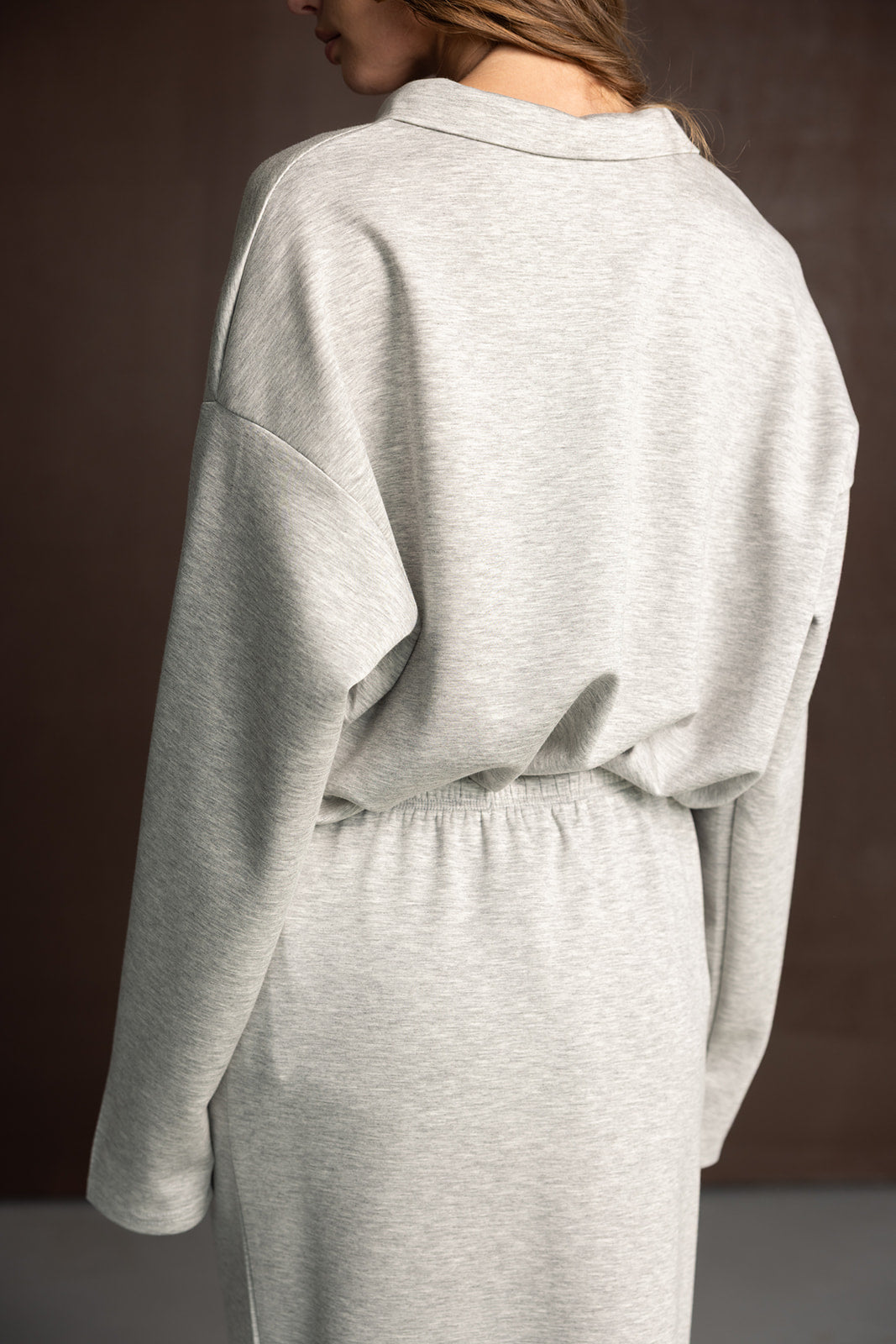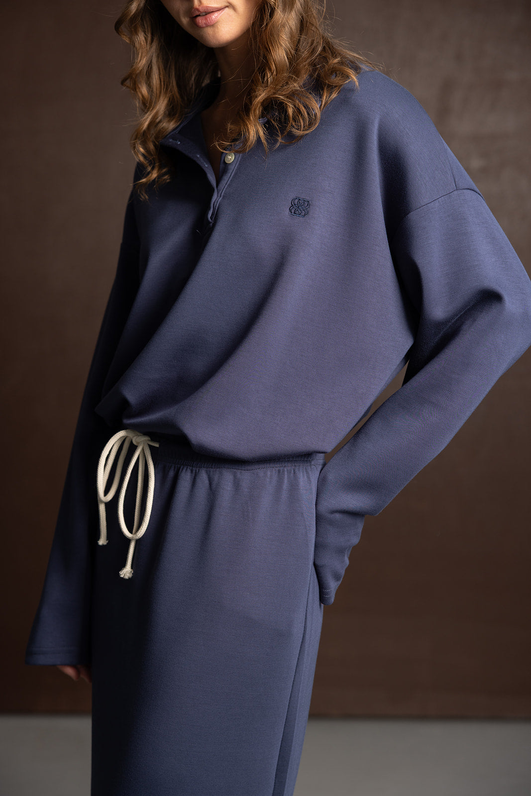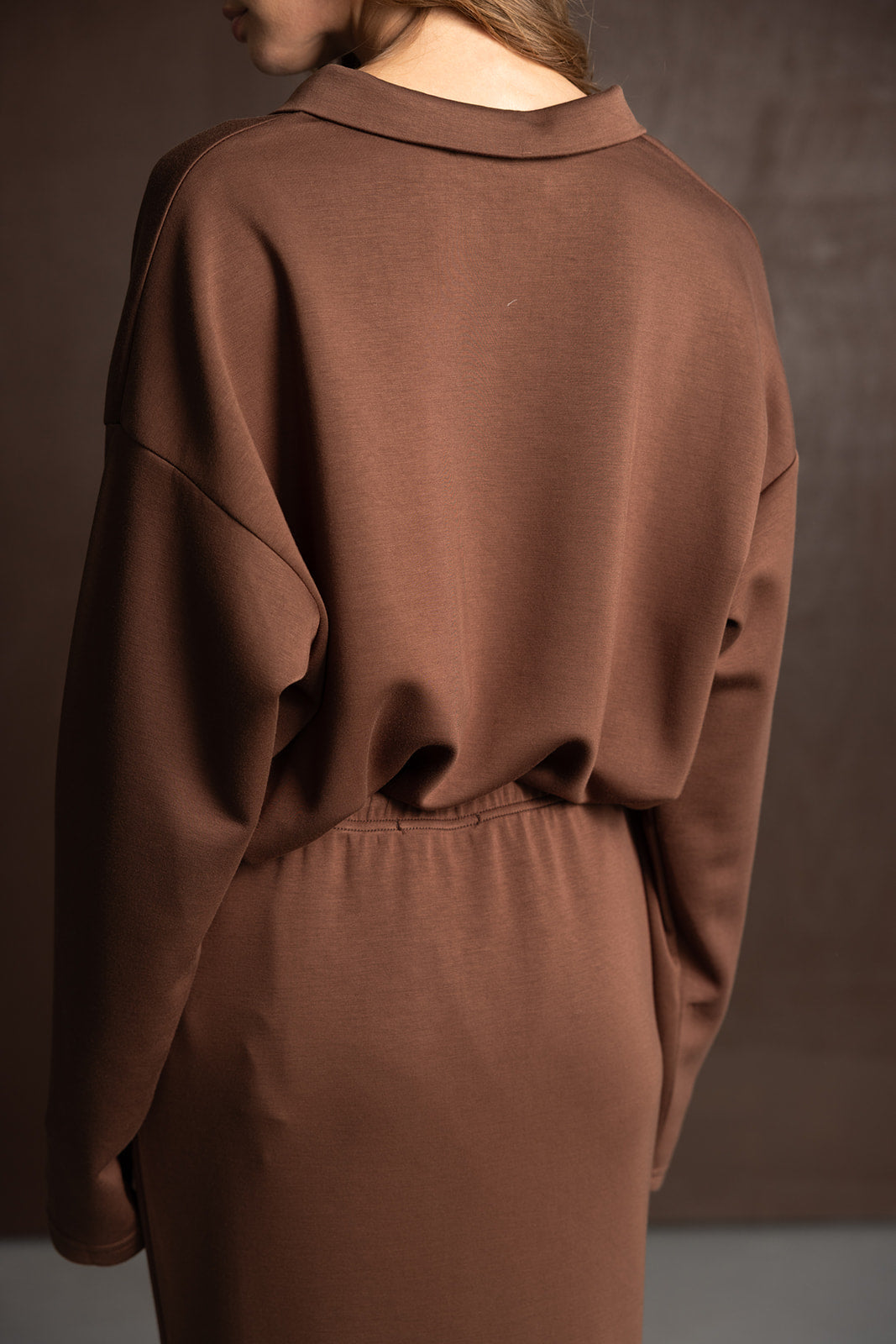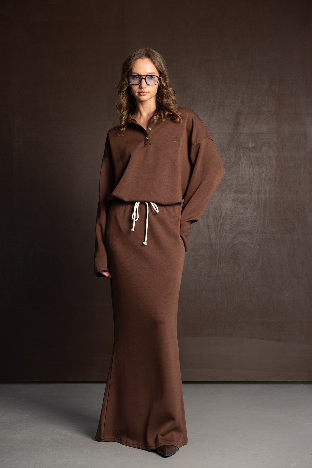 חולצת פולו ארוכת שרוולים בגזרה מעט אוברסייז, עשויה מבד נעים ובגוון תואם לחצאית. הדגם כולל מפתח צווארון פולו עם כפתורים עדינים ושרוולים רחבים ליצירת מראה אלגנטי אך נינוח.