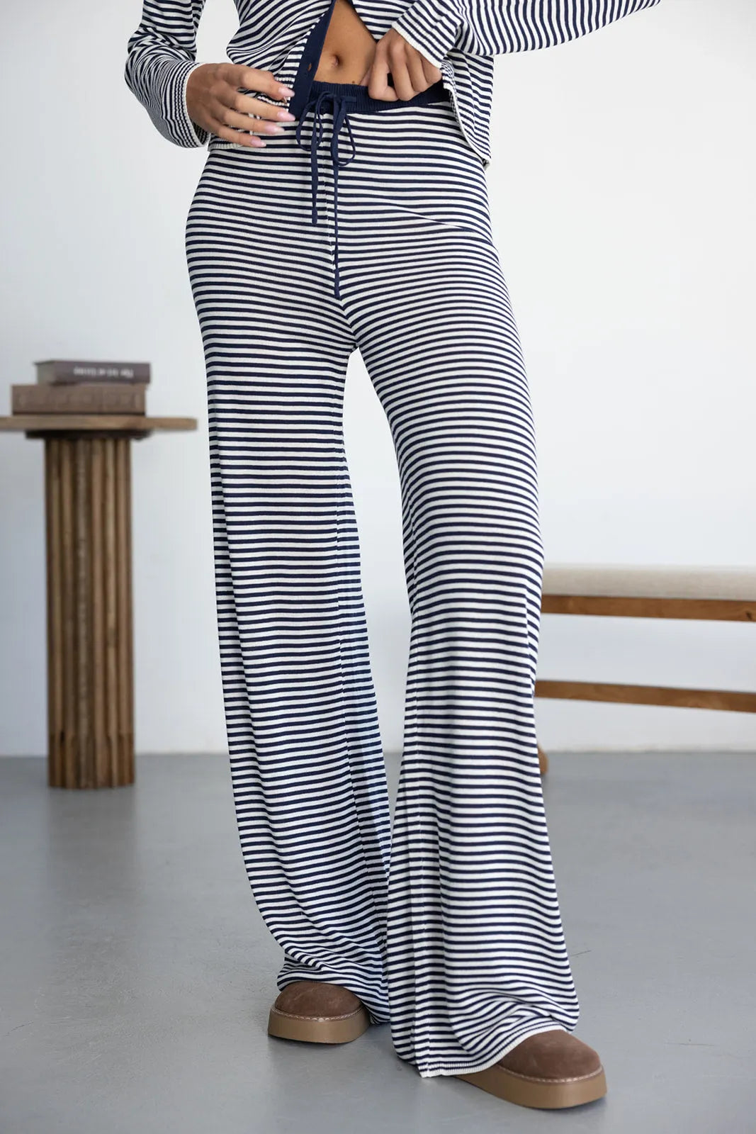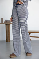 מכנס ארוך בגזרה ישרה, נוח ונעים ביותר לעונה. בשילוב הדפס פסים טרנדי, גומי במותן וקשירה לנוחות מקסימאלית.