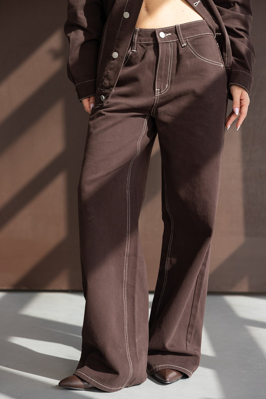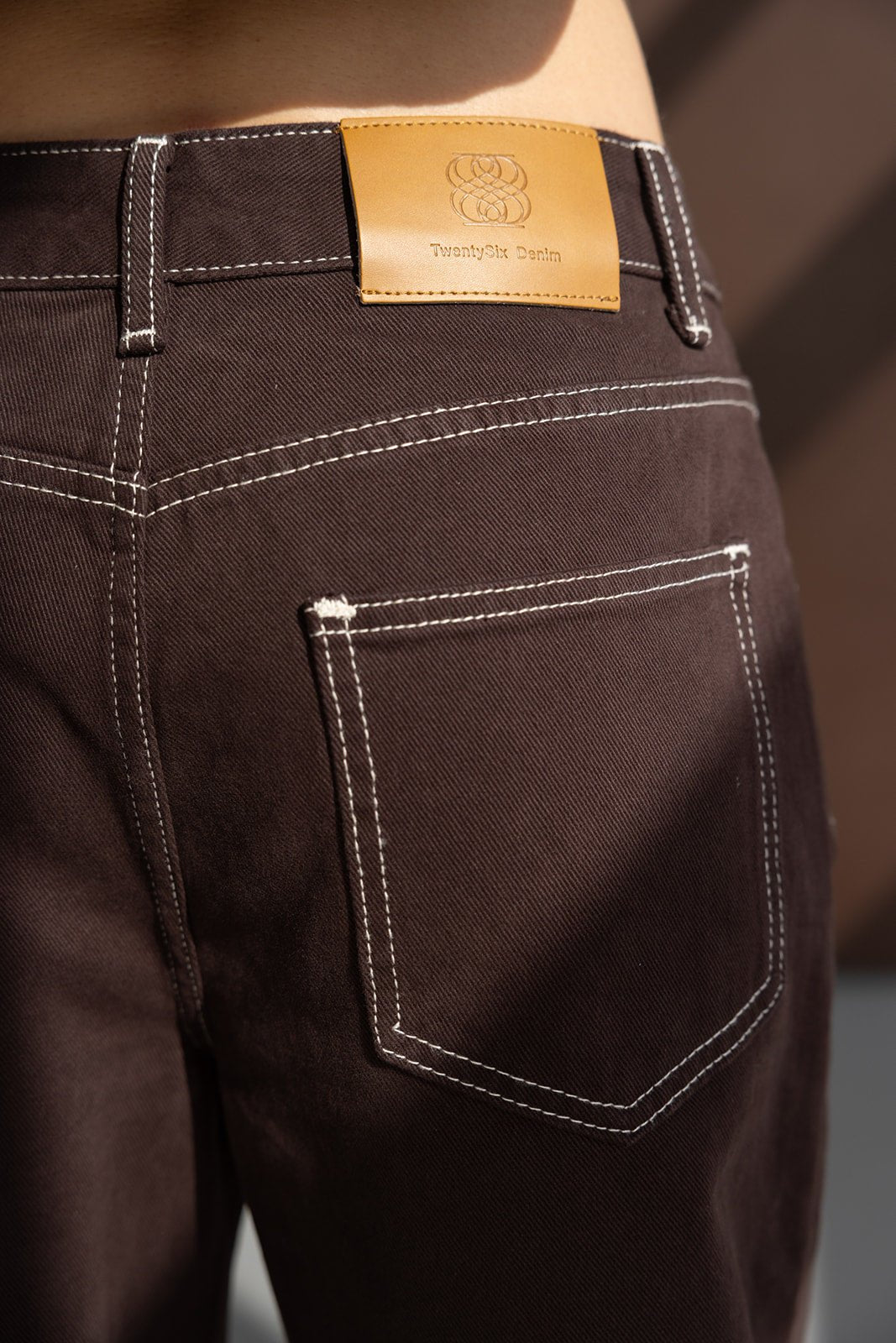 מכנס בגזרה ישרה מחמיאה וסיומת מתרחבת, בשילוב תפרים לבנים. למכנס שני כיסים קדמיים ושני כיסים אחוריים.