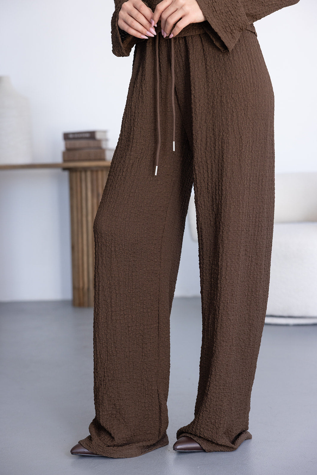 מכנס בגזרה מעט רחבה ומחמיאה ביותר, מבד מכווץ טרנדי. למכנס גומי במותן וקשירה.