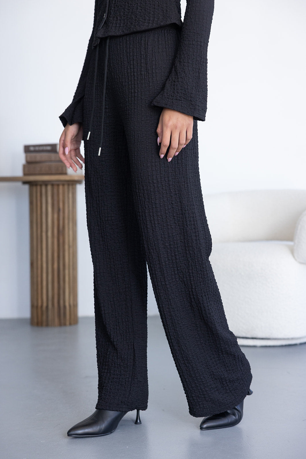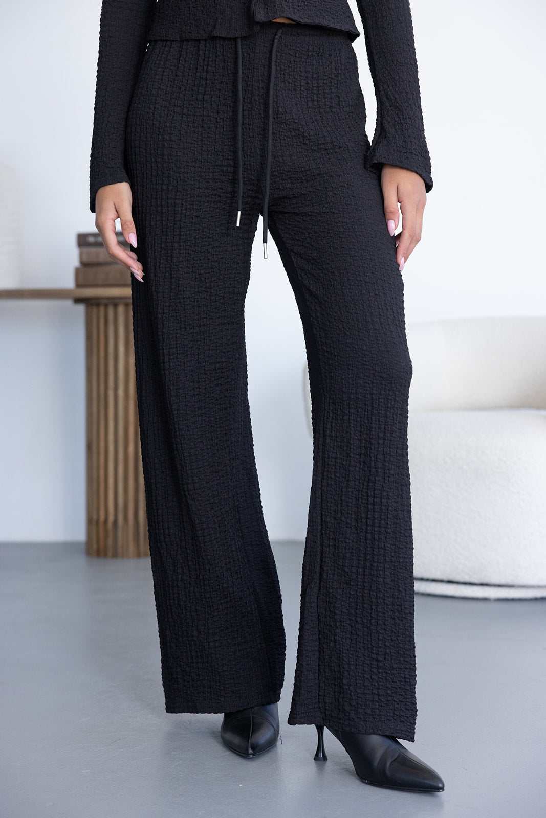 מכנס בגזרה מעט רחבה ומחמיאה ביותר, מבד מכווץ טרנדי. למכנס גומי במותן וקשירה.