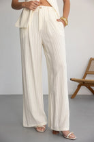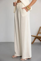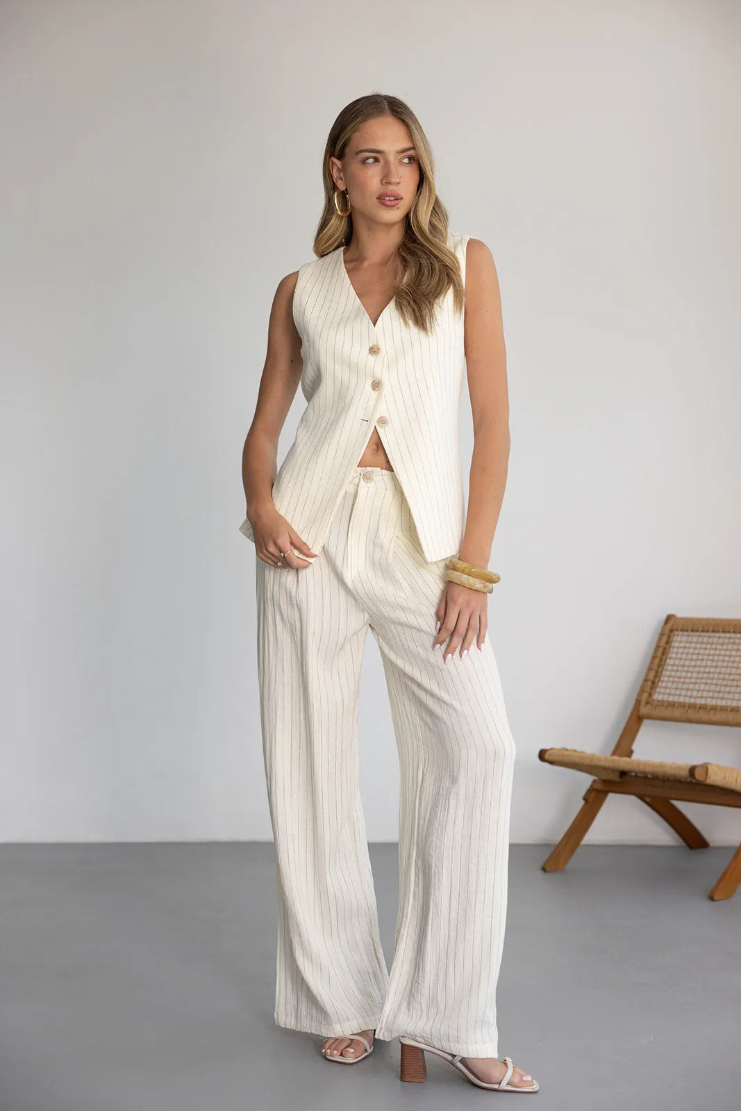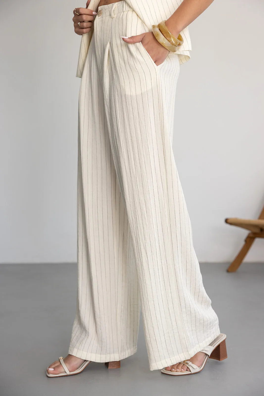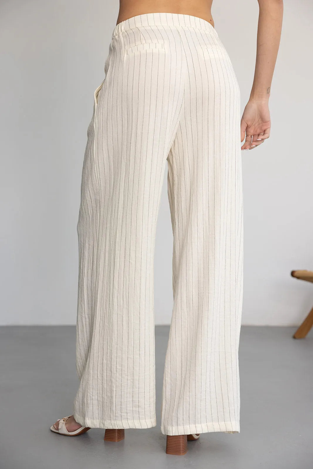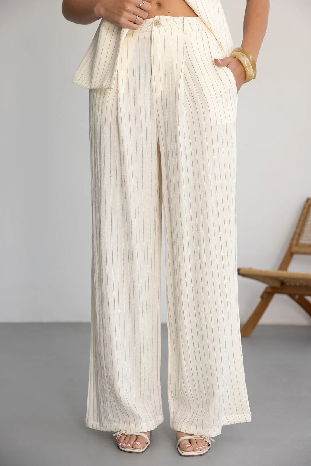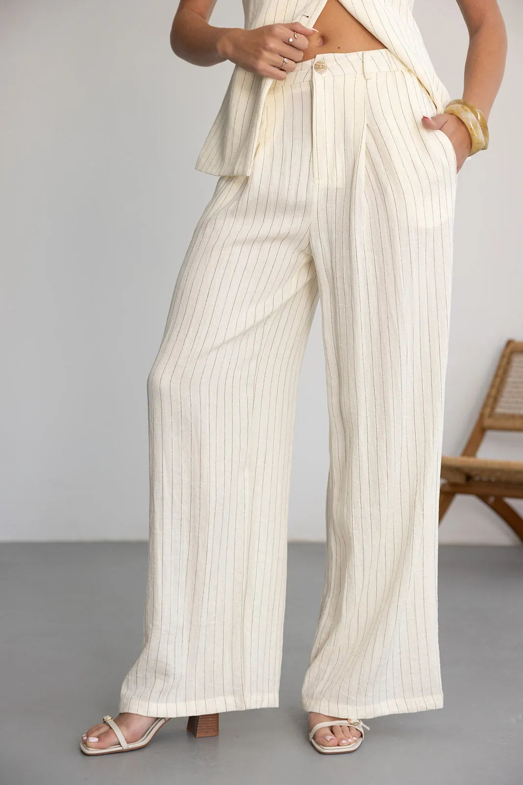 מכנס פשתן מחויט בגזרה ישרה, בשילוב זוג כיסים קדמיים, סגירה בכפתור ורוכסן, ודוגמת פסים עדינה לאורך המכנס.