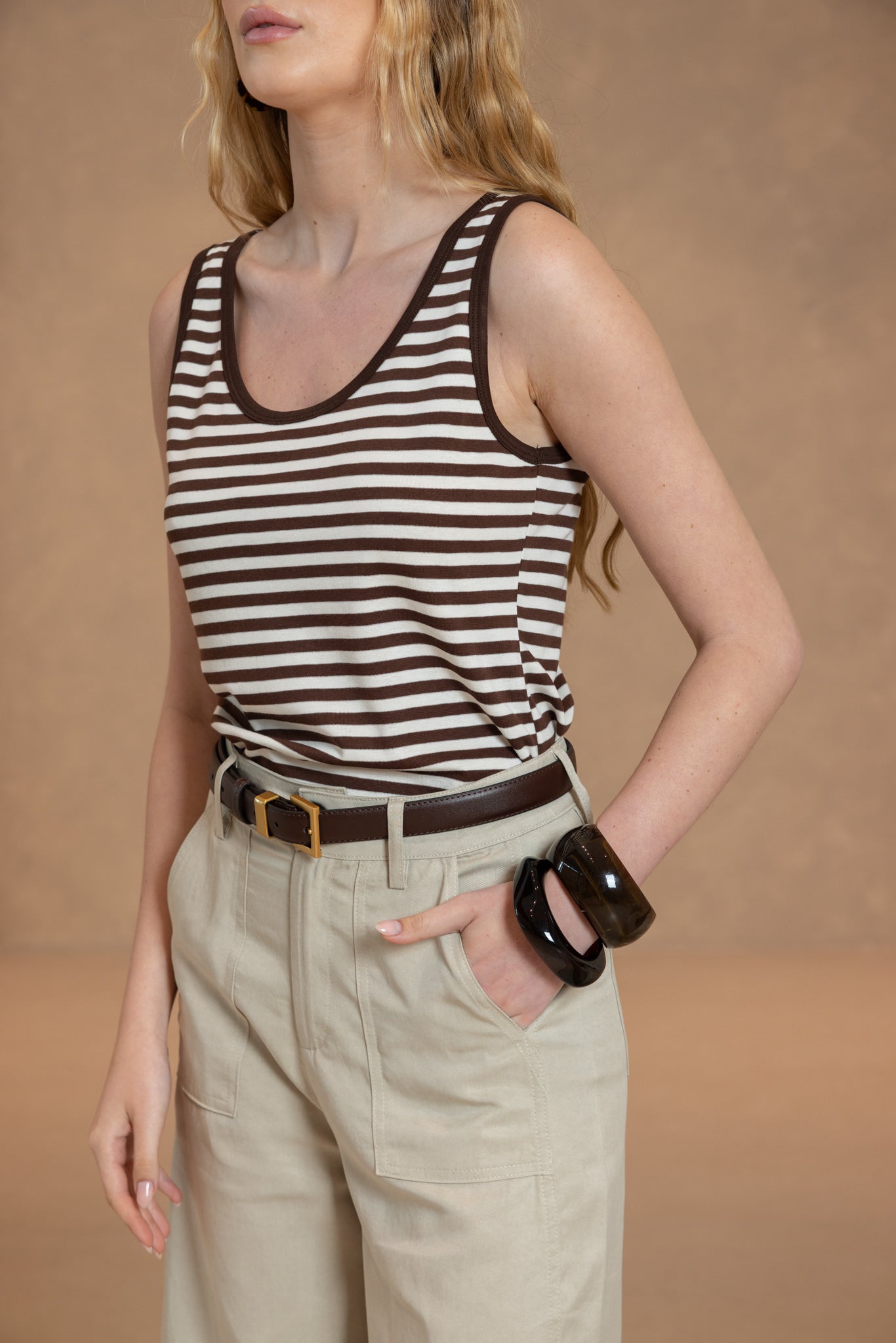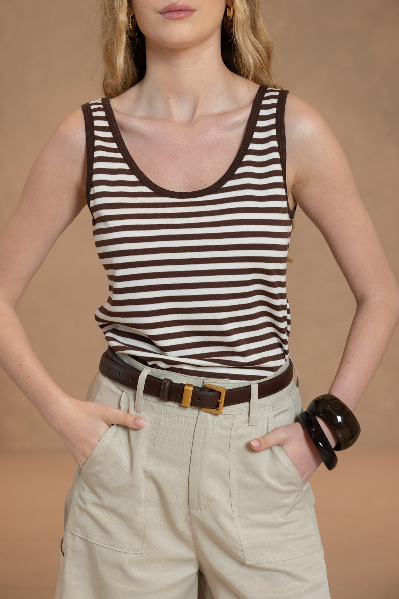 גופייה עם כתפיות רחבות ומפתח עגול, עשויה בד נעים עם דוגמת פסים. גזרה מחמיאה ונוחה למראה קליל.