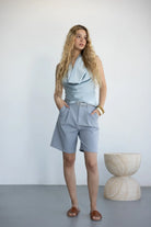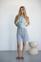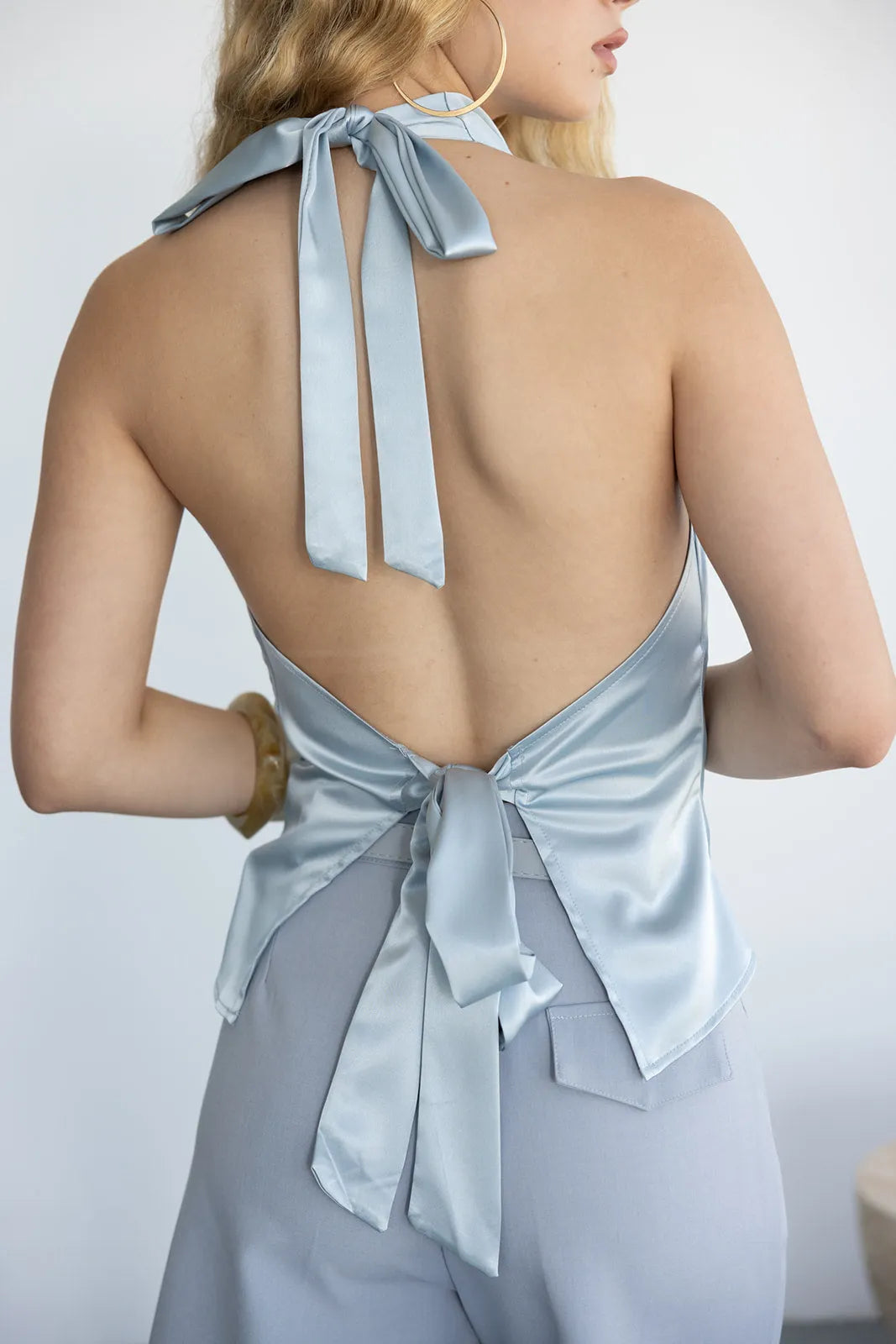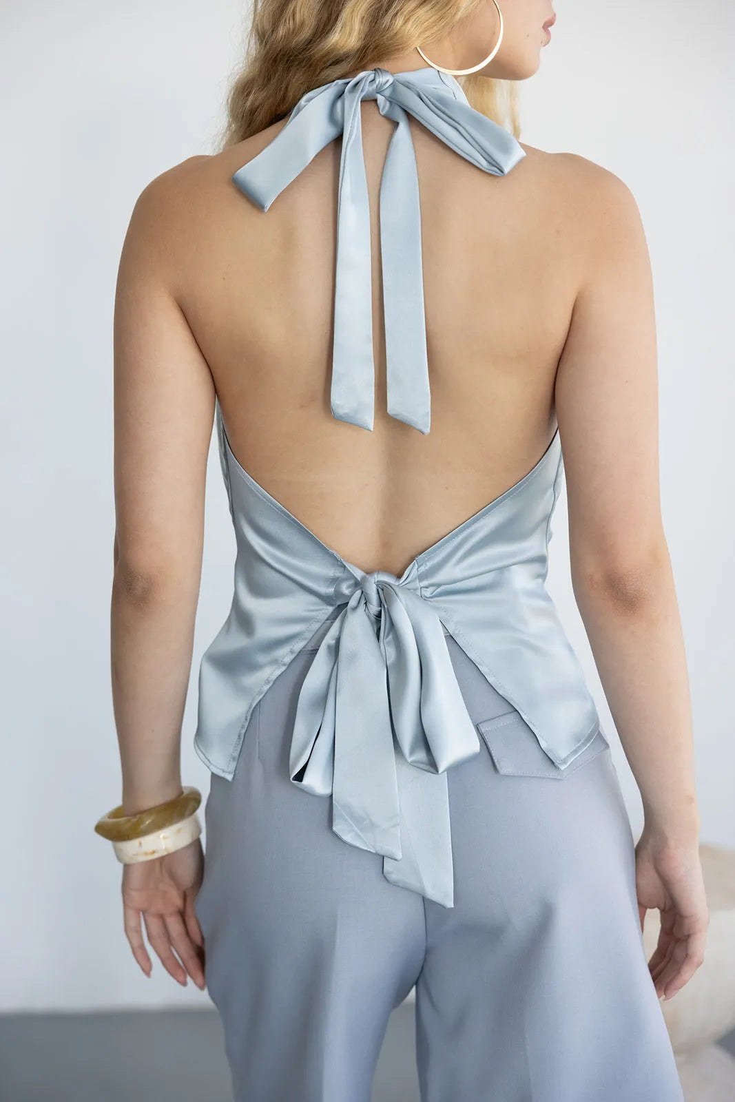 טופ קשירה אלגנטי עם מחשוף נשפך, עשוי בד סאטן קליל ורך למגע.
