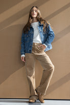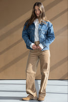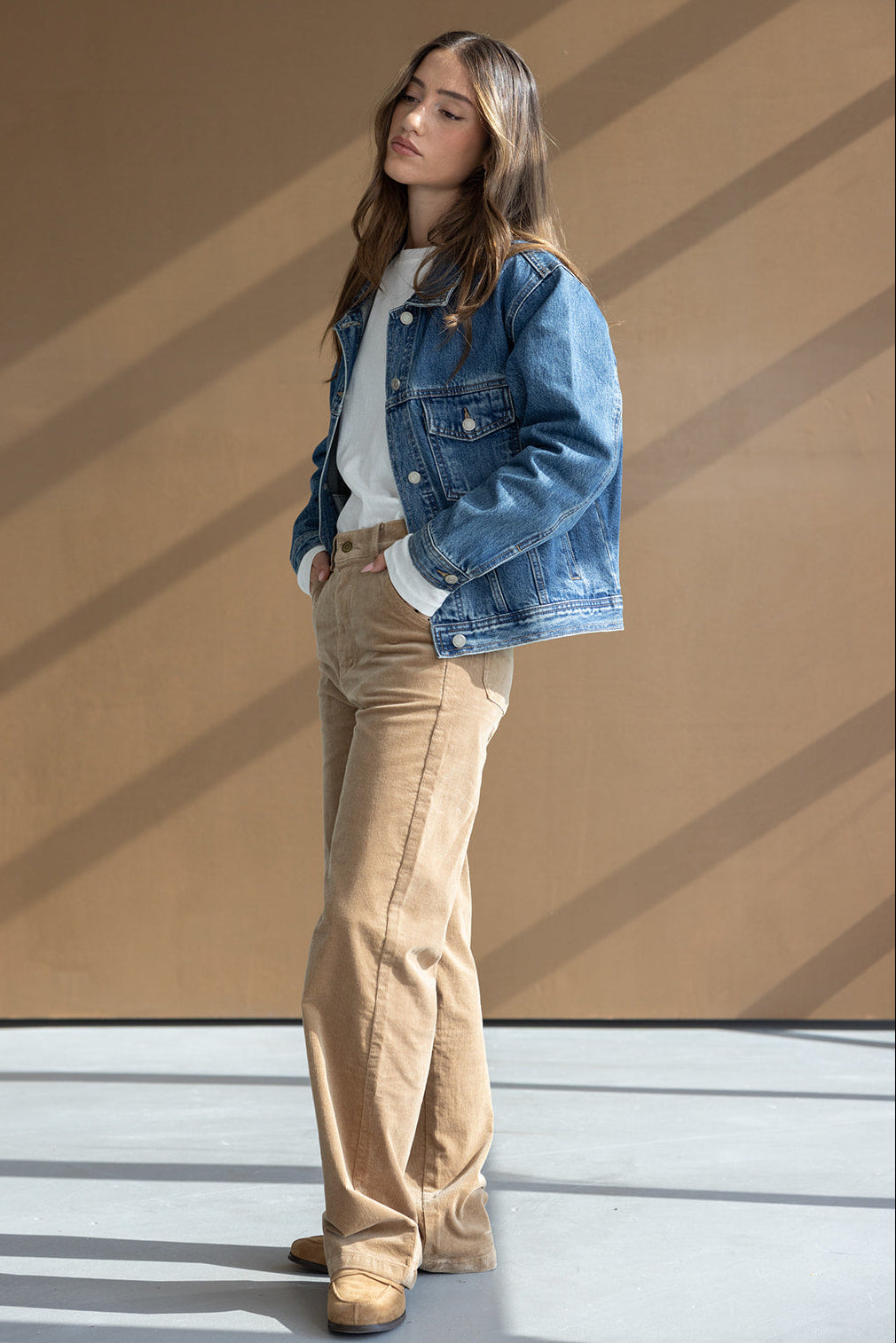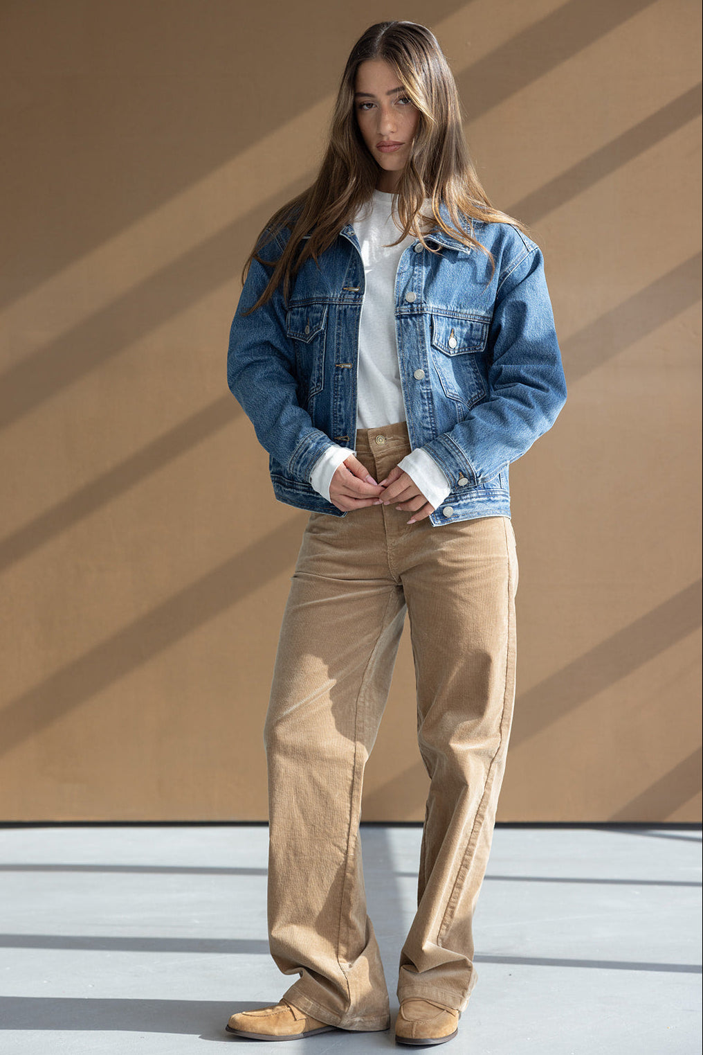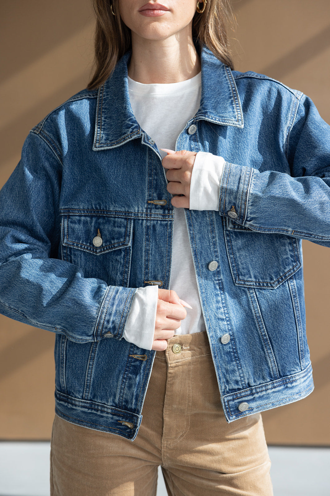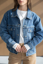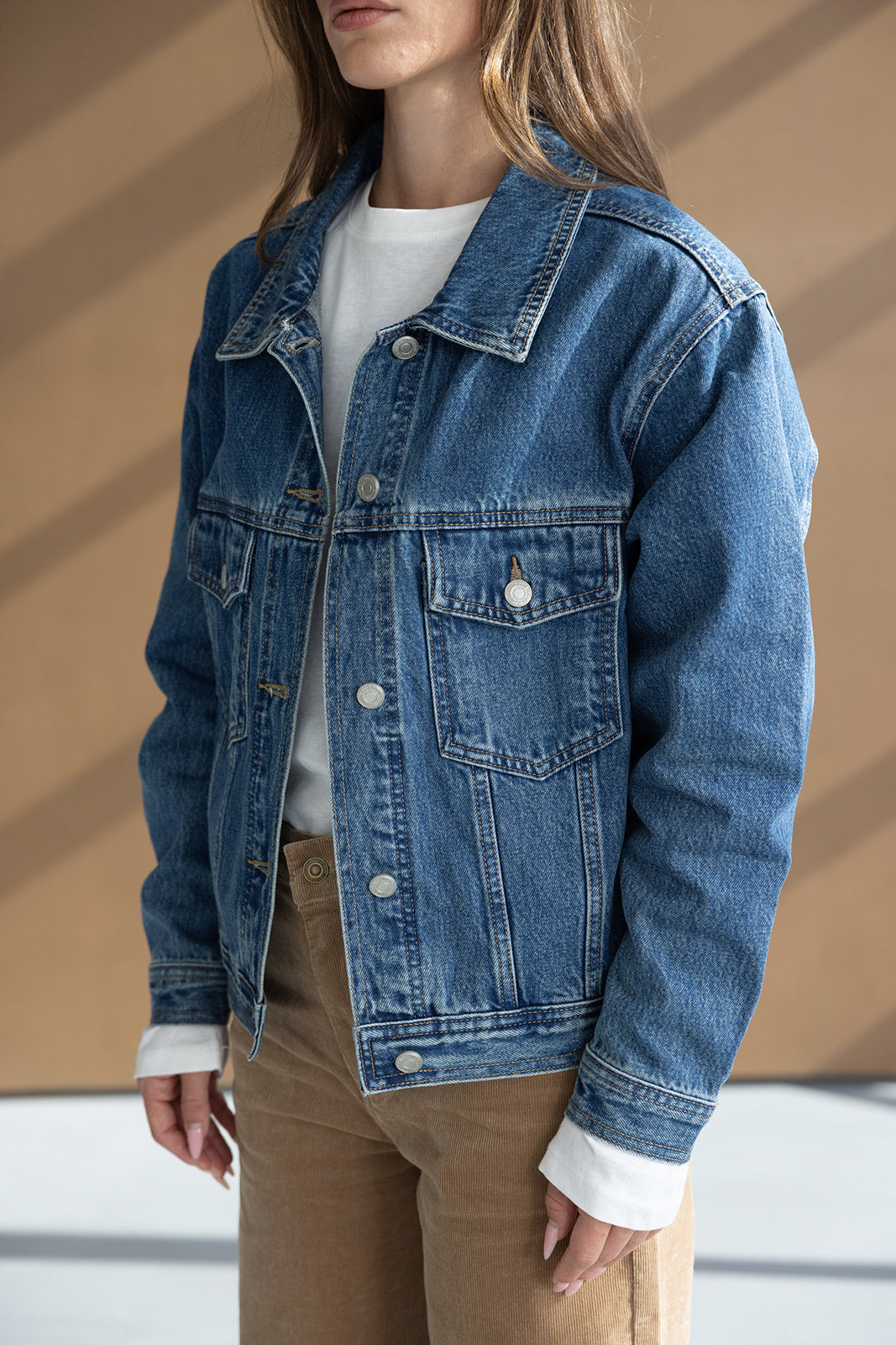 ג'קט ג'ינס במראה קלאסי, בשילוב שני כיסים, כפתורים וצווארון קלאסי.