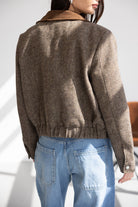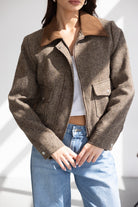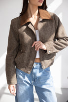 ג'קט בגזרה מעט משוחררת בצבע חום כהה, בשילוב בד איכותי, כיסים קדמיים וצווארון קלאסי מחמיא.