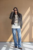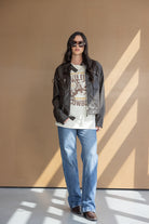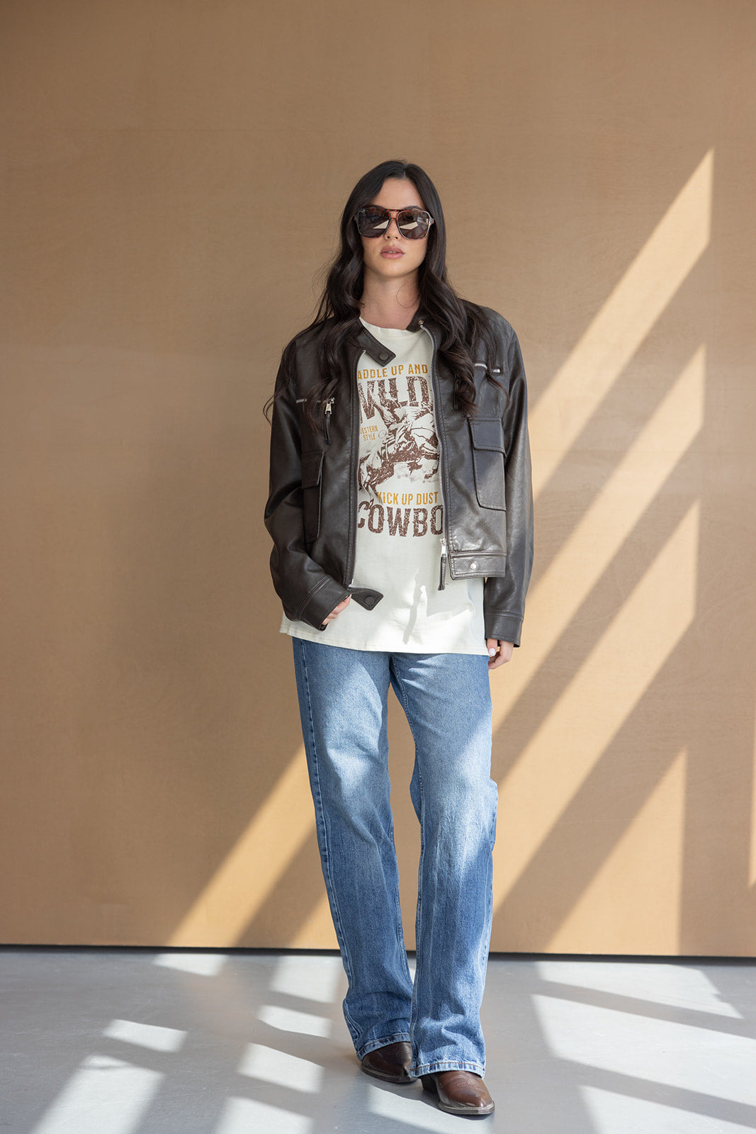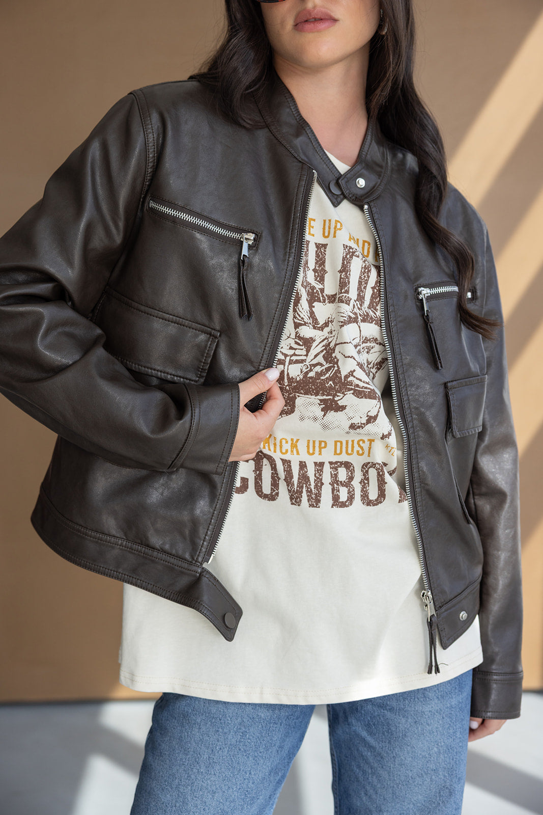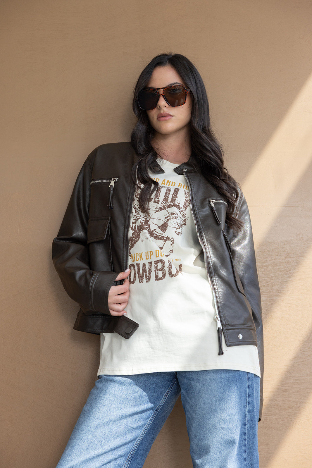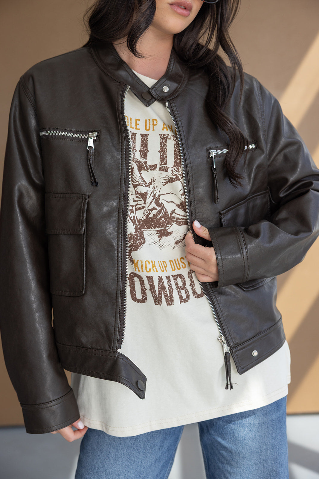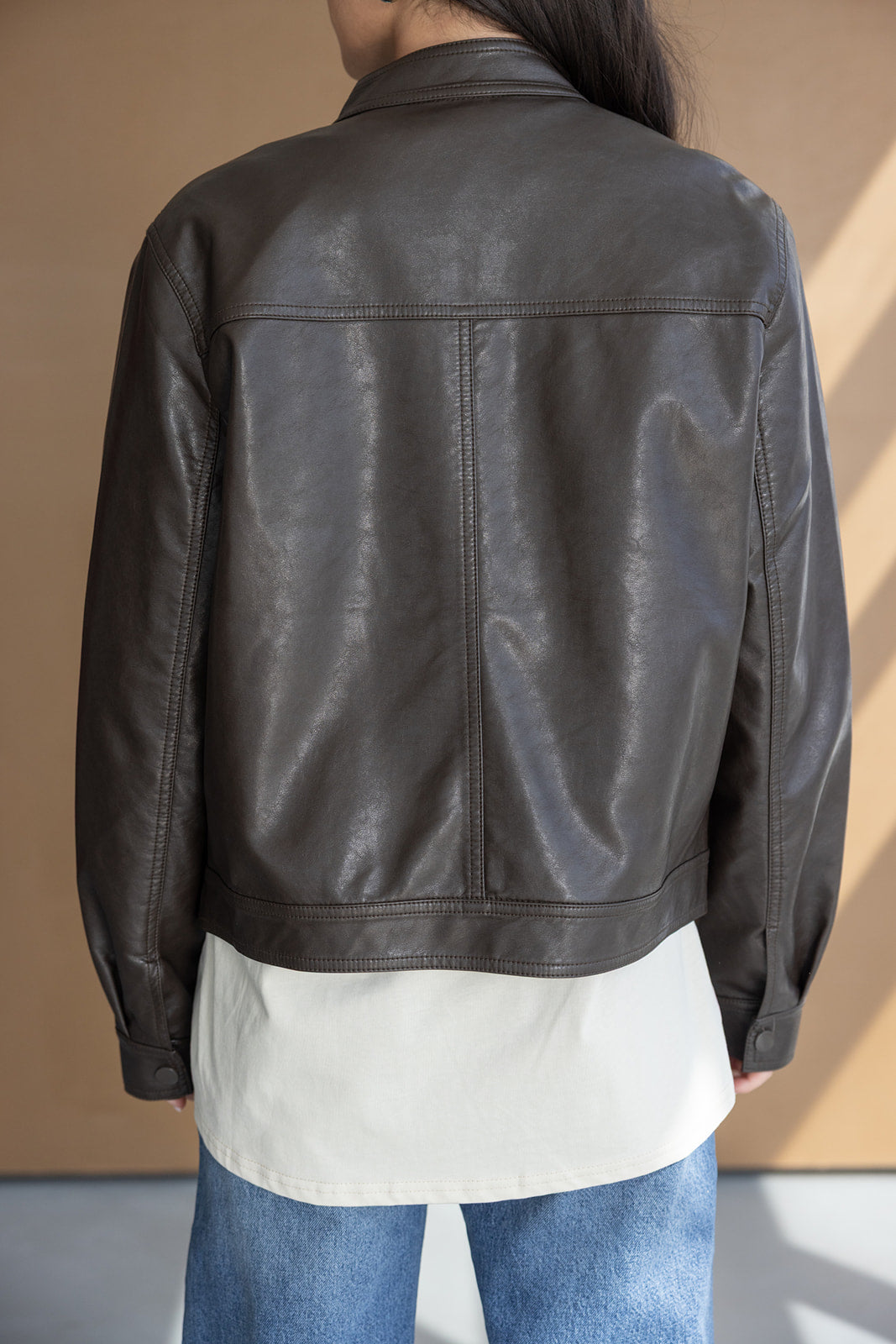 ג'קט עשוי דמוי עור במראה קלאסי, בשילוב ארבעה כיסים, כפתורים ורוכסן.