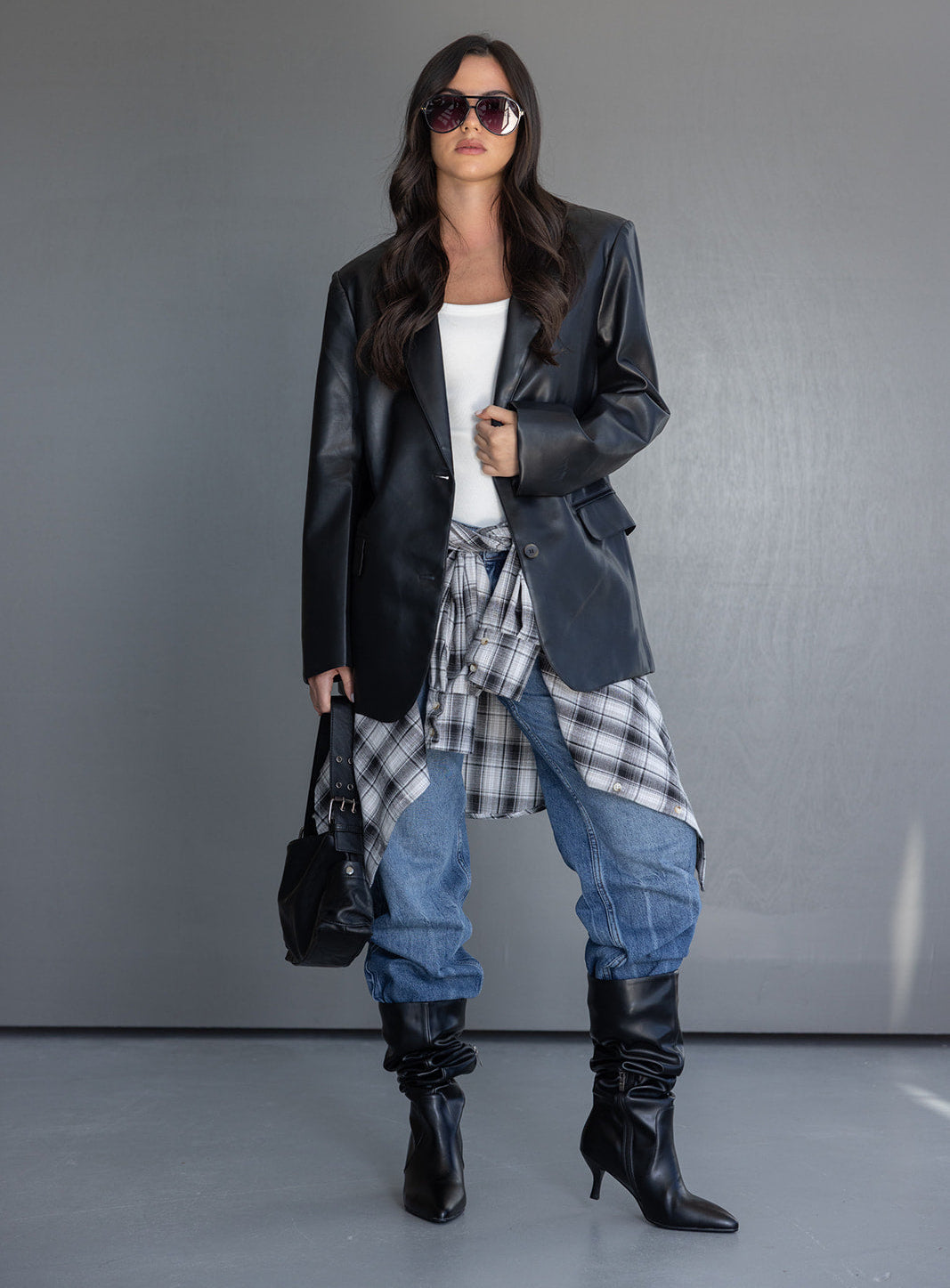 ג'קט דמוי עור מחויט קלאסי בגזרה מדויקת, בשילוב כפתורים ושני כיסי דמה.