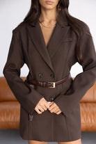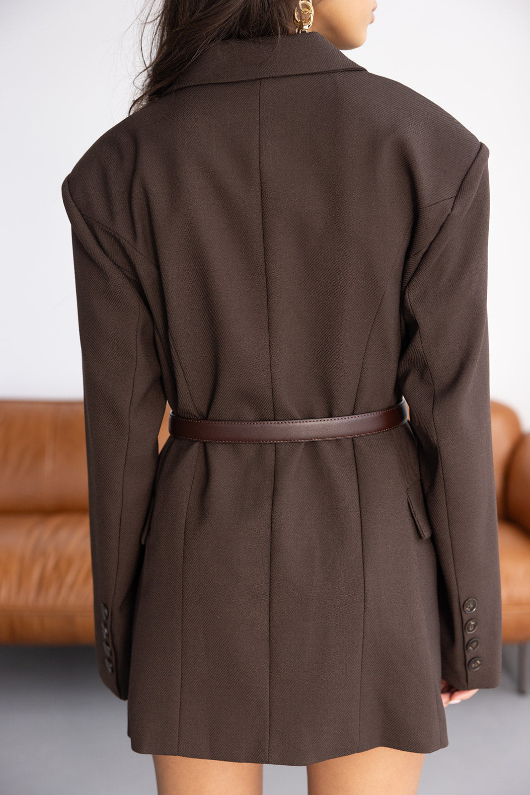 בלייזר בגזרה ארוכה עם מראה מחויט. עשוי בד מחוספס עדין, עם סגירת כפתורים כפולה וכיסים קדמיים. גזרת כתפיים מובנית שמעניקה מראה אלגנטי.