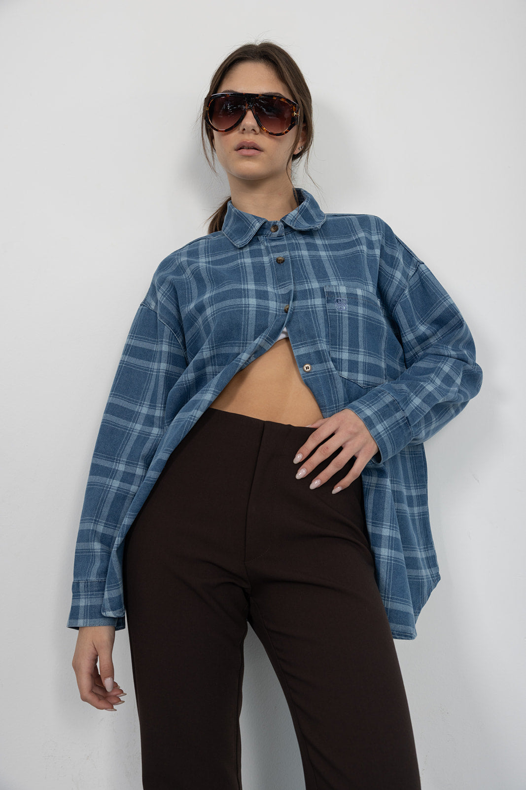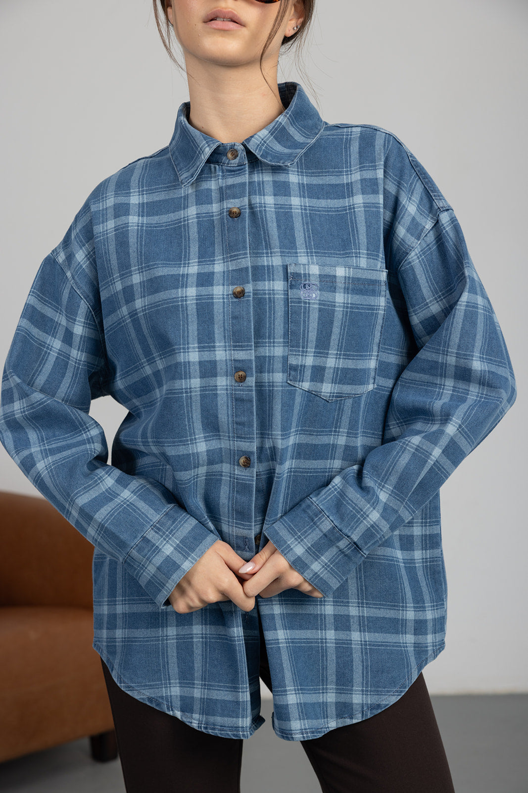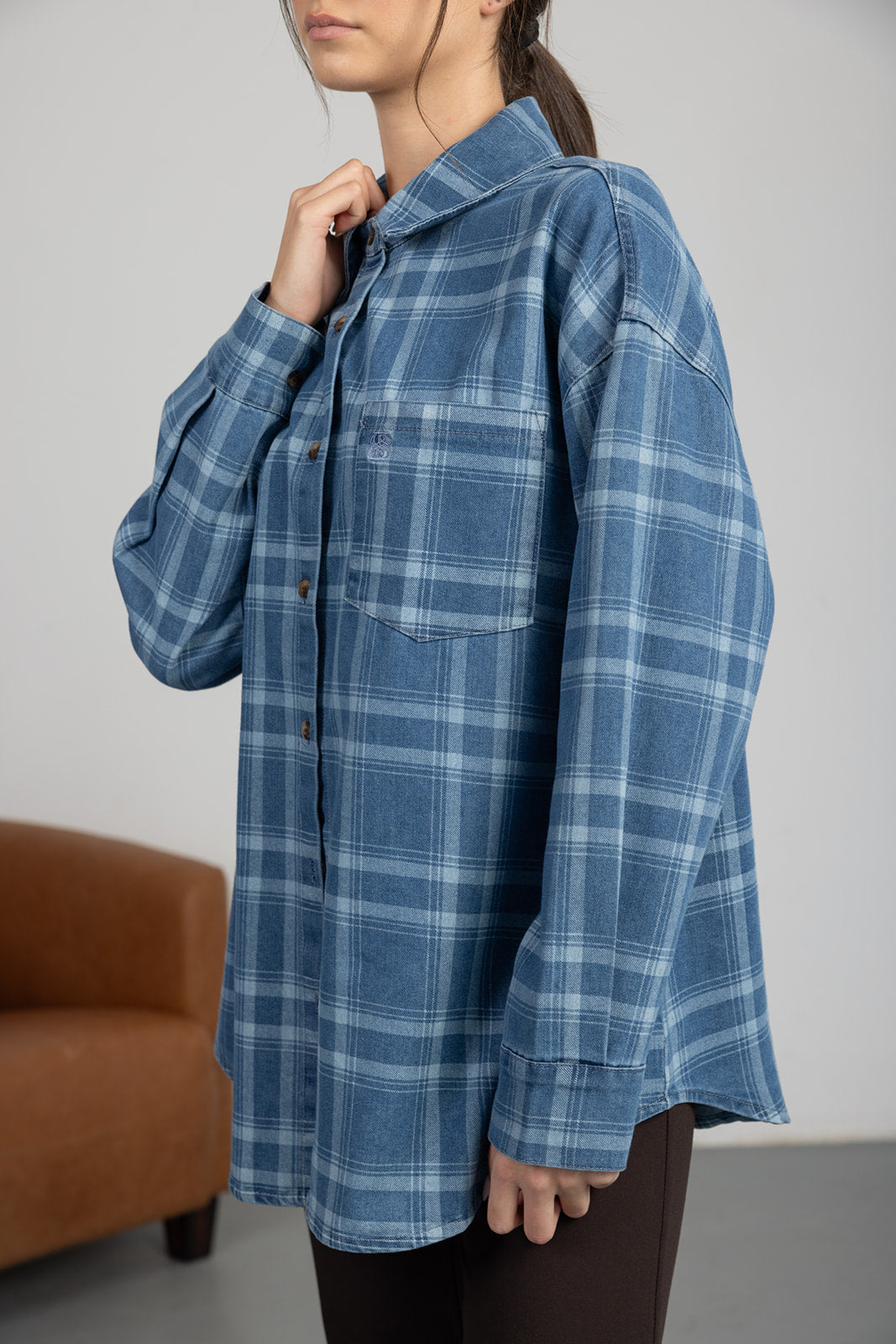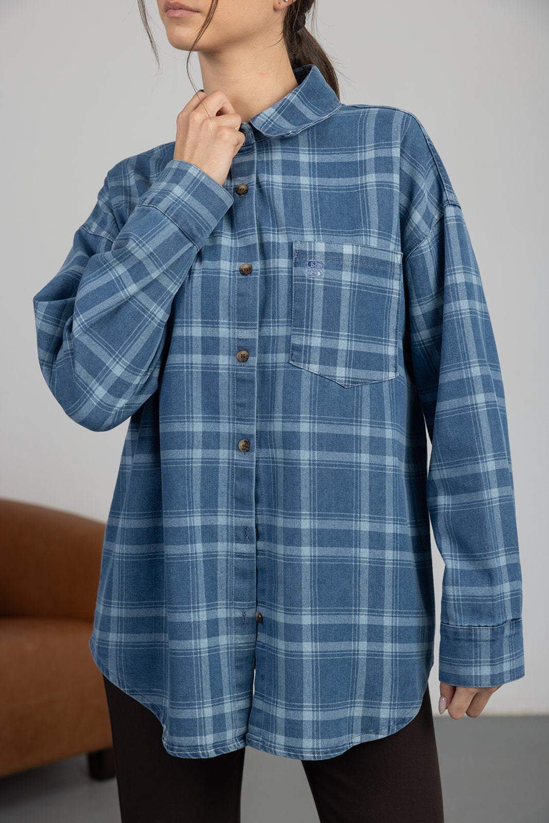 חולצת כפתורים משובצת מבד ג'ינס בגזרה משוחררת. כוללת צווארון קלאסי, סגירת כפתורים קדמית וכיס בצד החולצה.