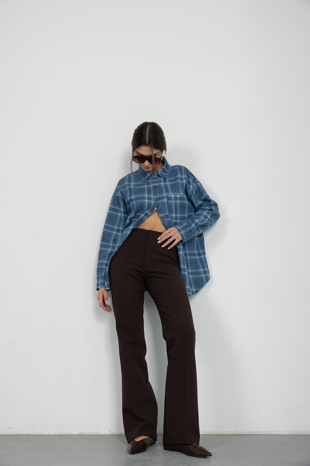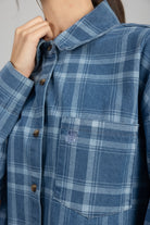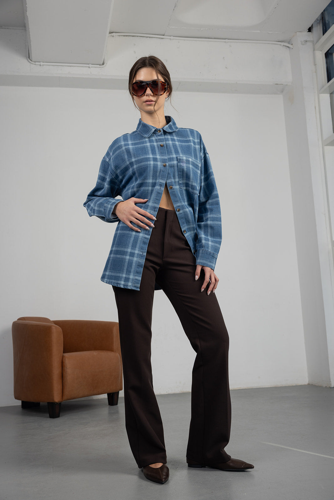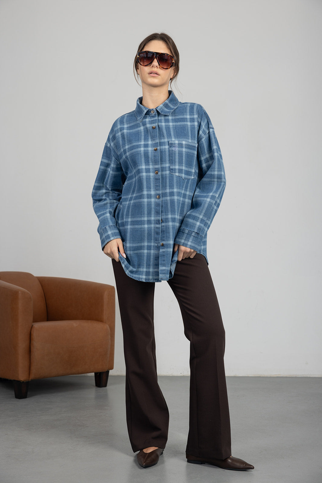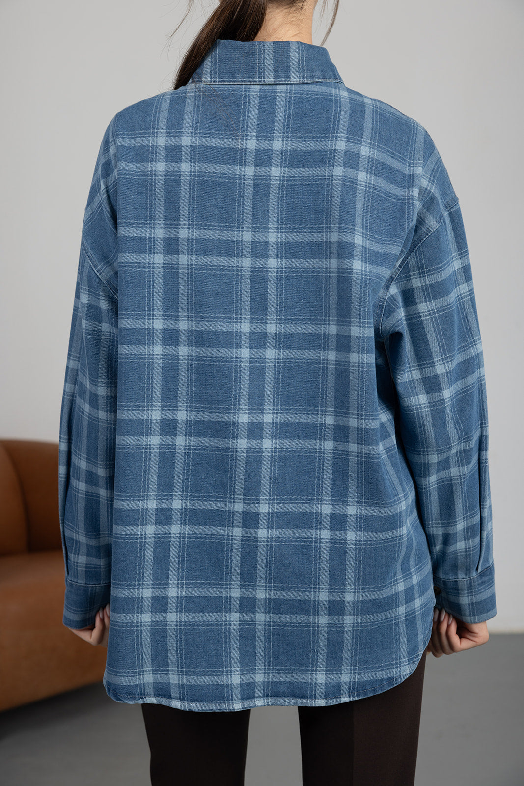 חולצת כפתורים משובצת מבד ג'ינס בגזרה משוחררת. כוללת צווארון קלאסי, סגירת כפתורים קדמית וכיס בצד החולצה.