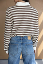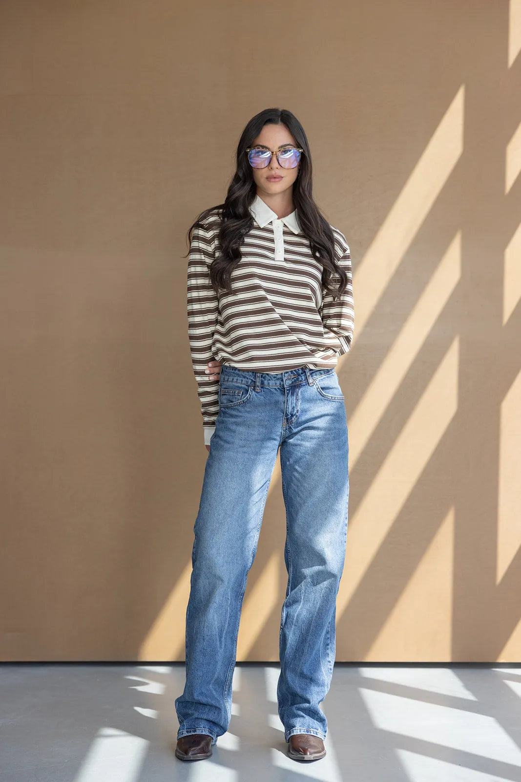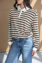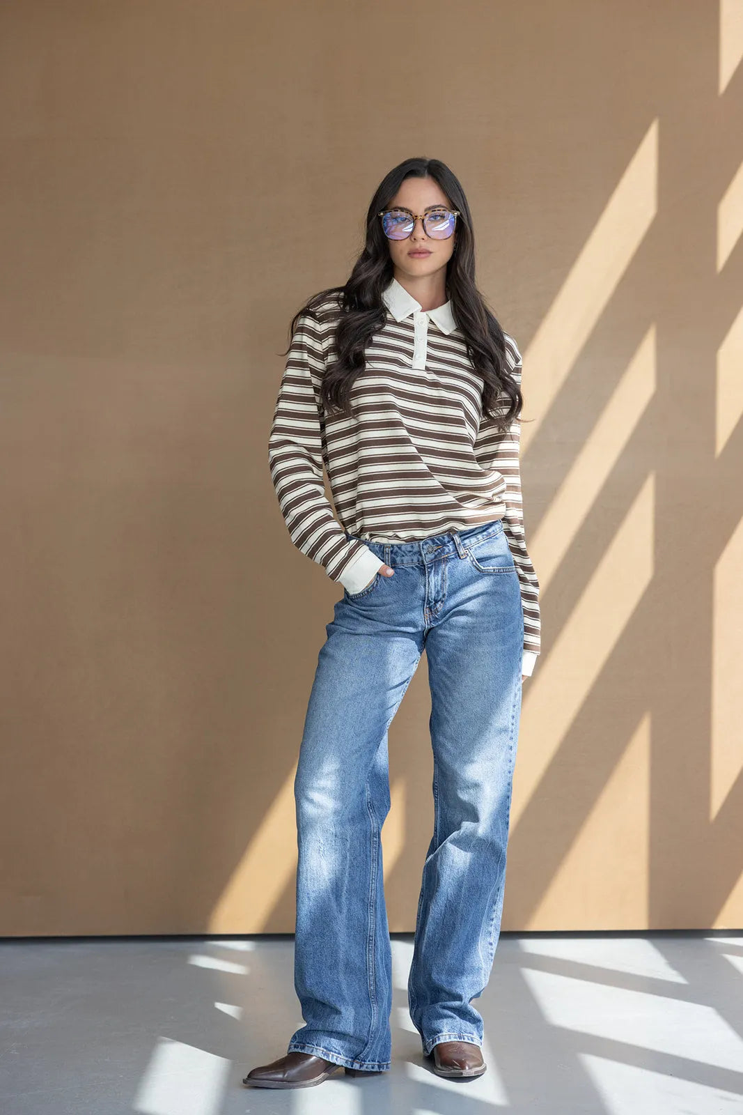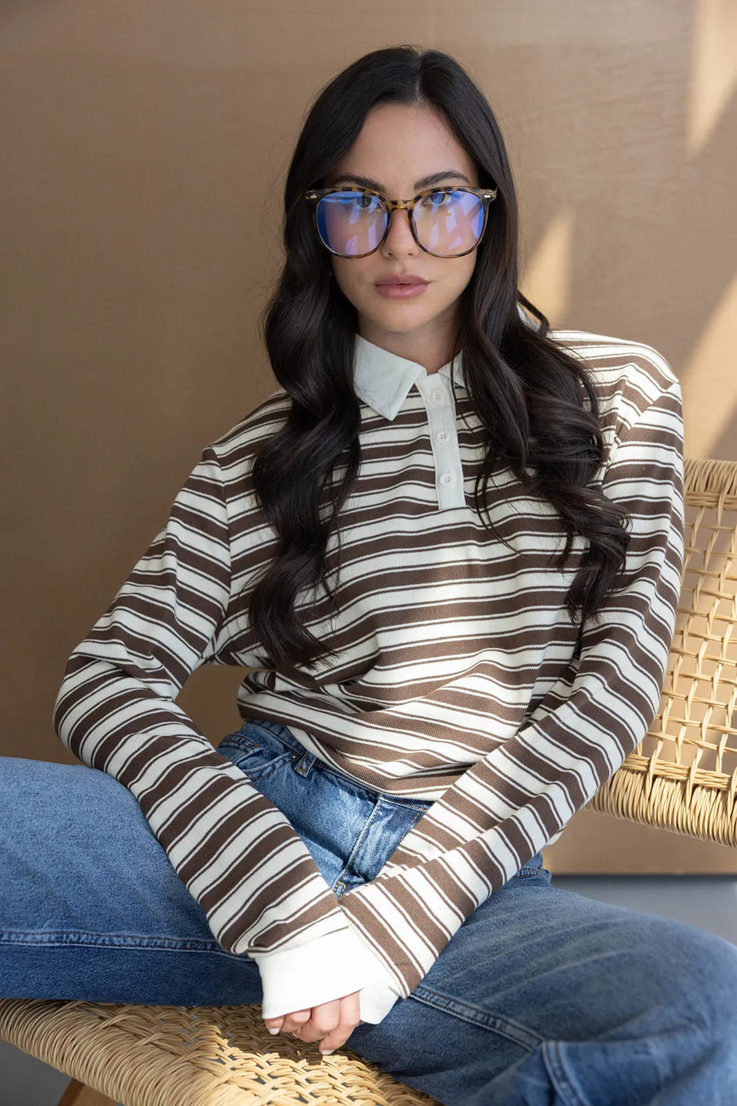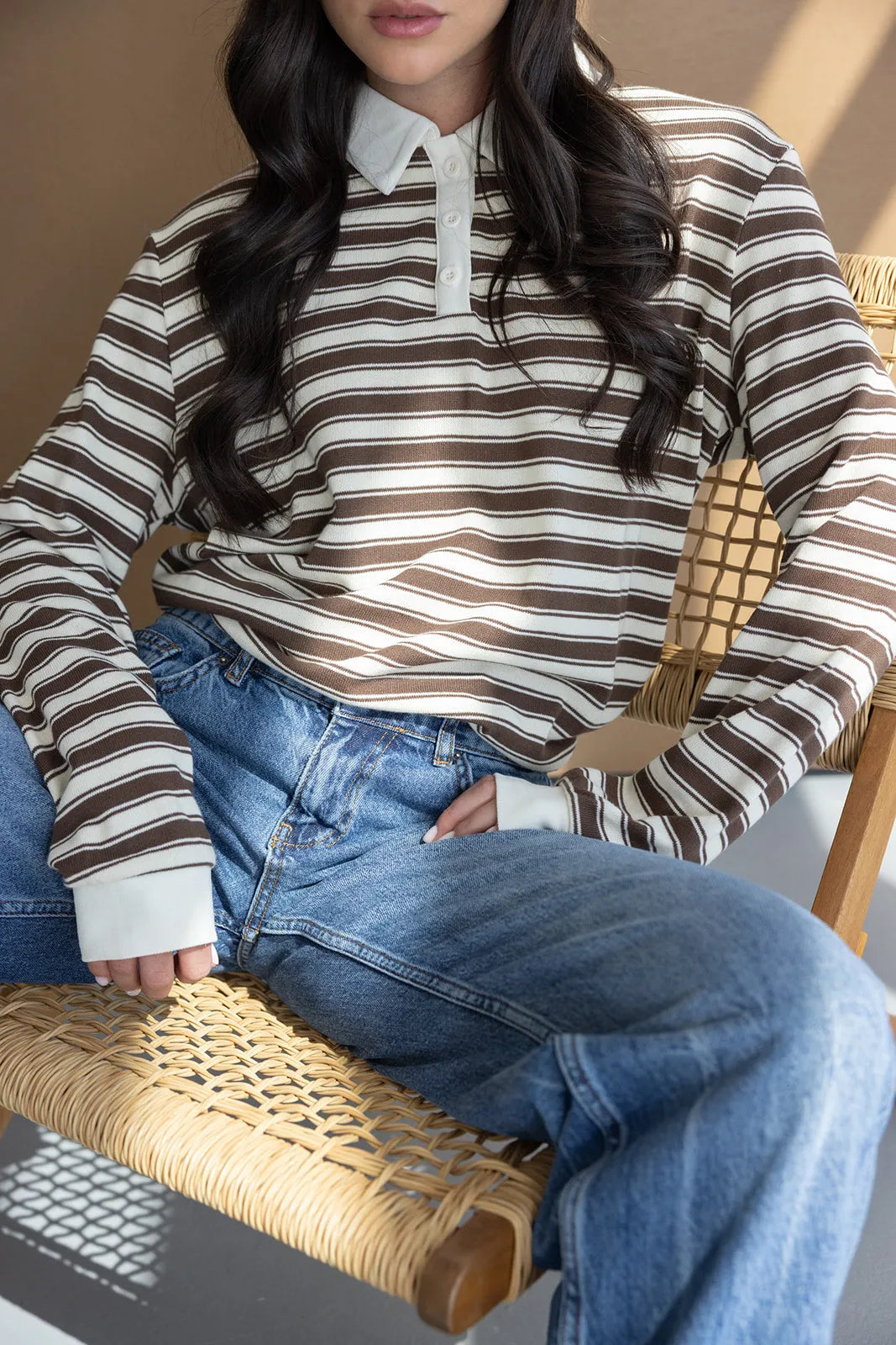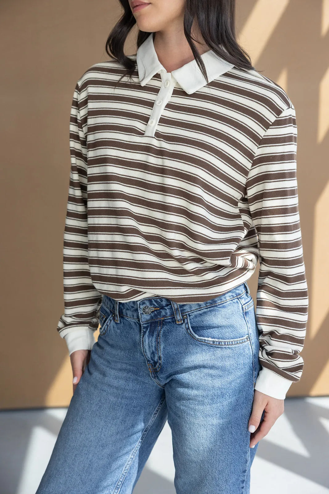 חולצת פולו קלאסית עם שרוול ארוך, עשויה מבד נעים ואיכותי. בשילוב צווארון פולו קלאסי בצבע קרם ודוגמת פסים בצבע חום לרוחב החולצה.
