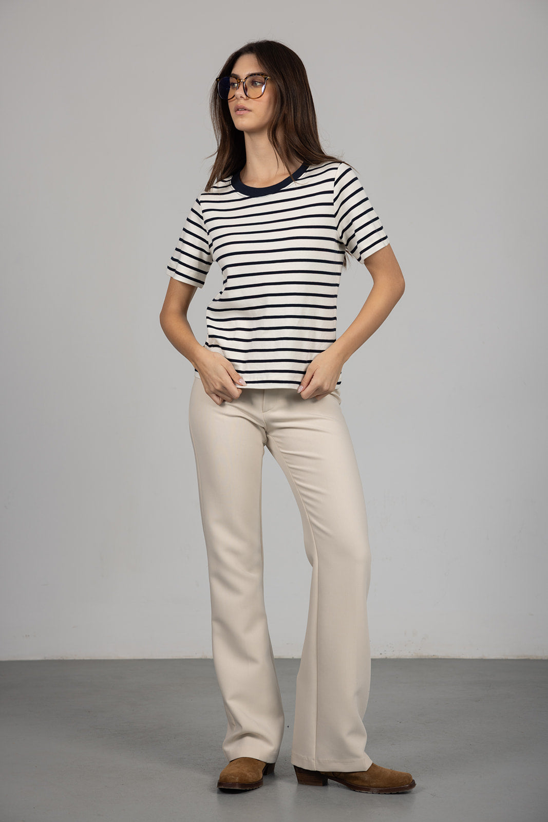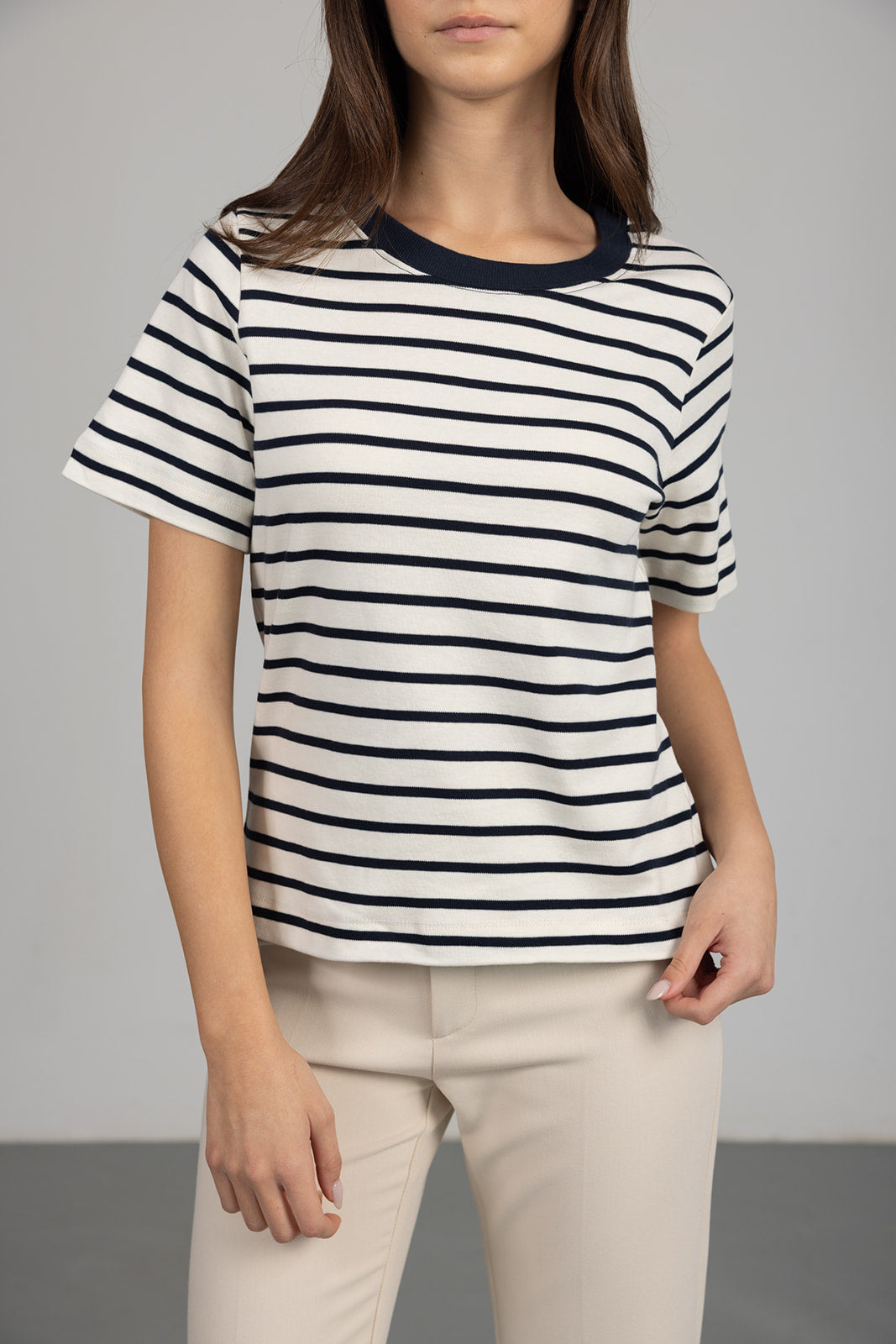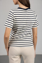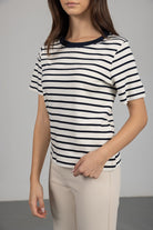 טי שירט פסים בגזרה קלאסית עם שרוולים קצרים וצווארון עגול. בד איכותי ונעים