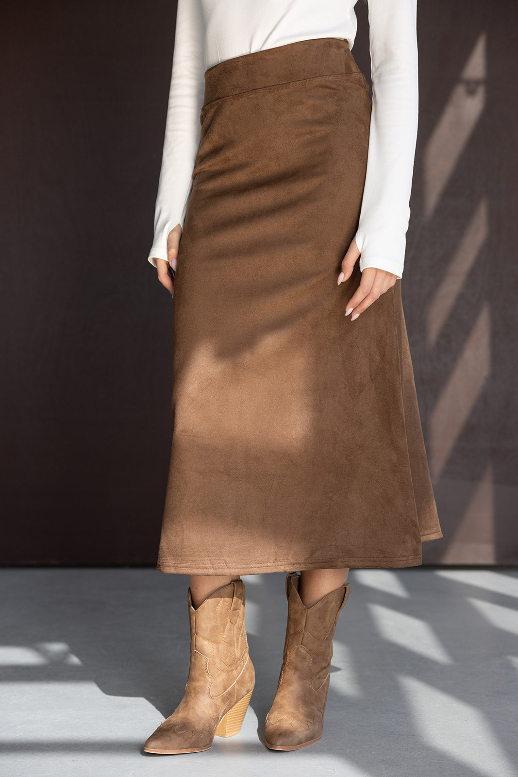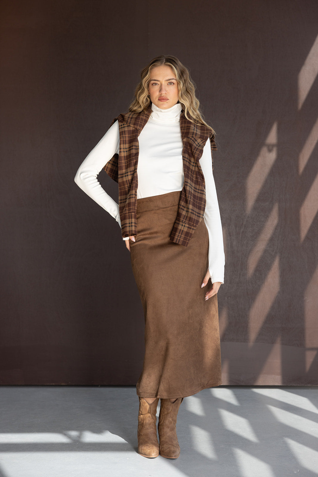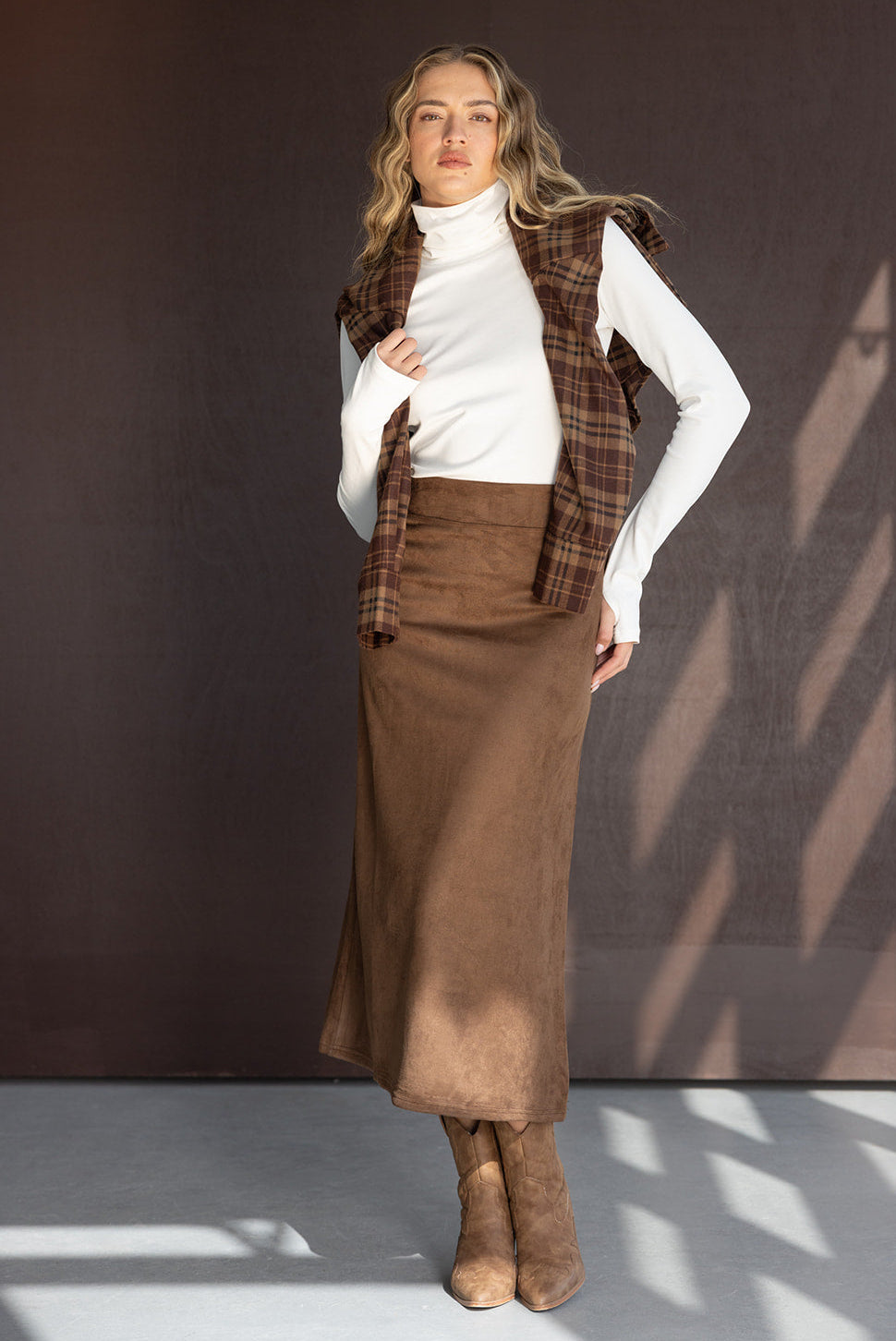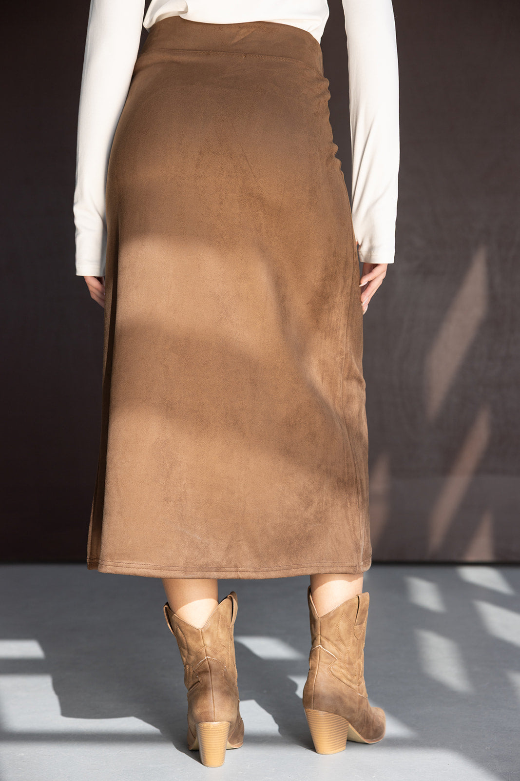 חצאית מקסי בגזרה ישרה ומחמיאה. עשויה בד דמוי זאמש נעים במראה קלאסי והחם של העונה.