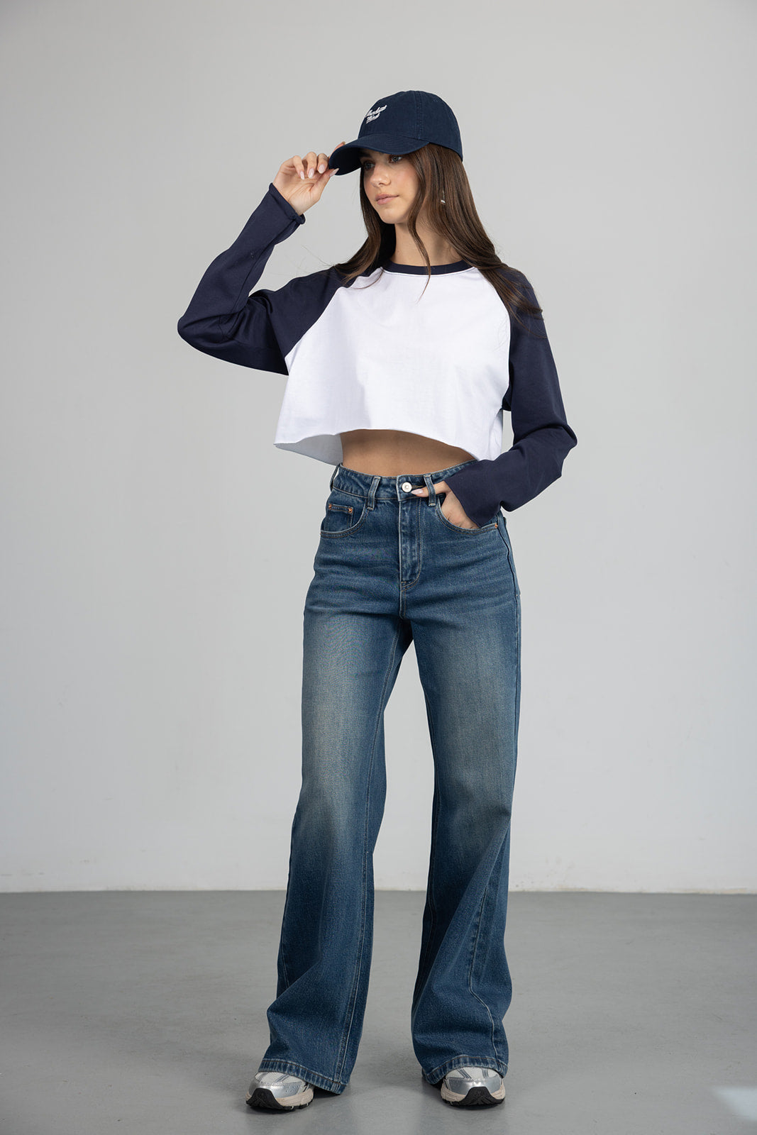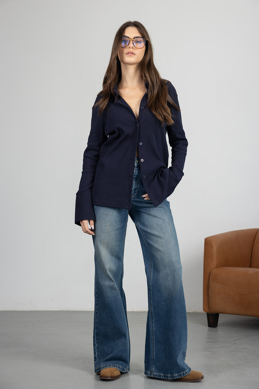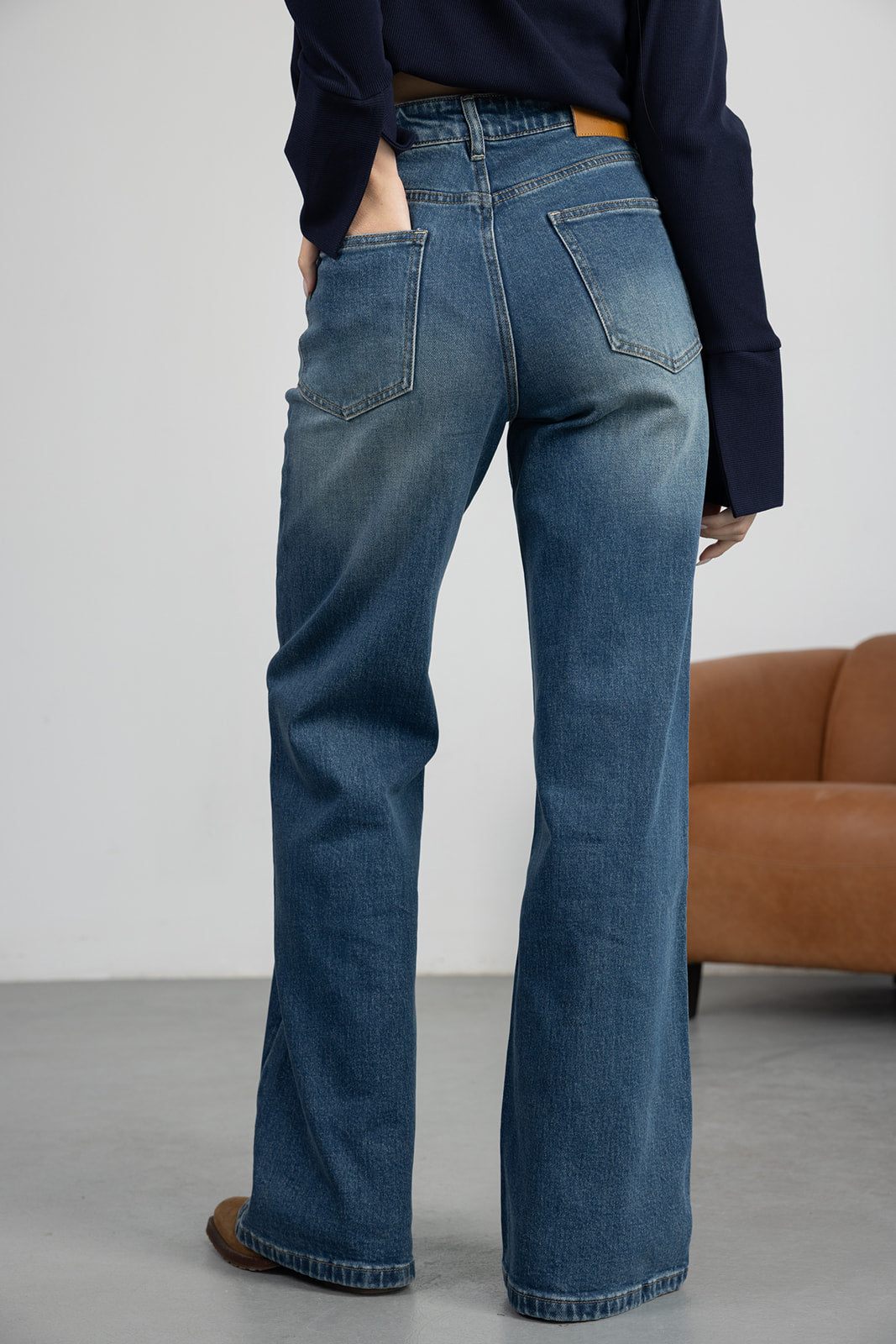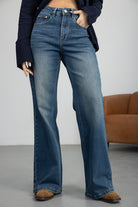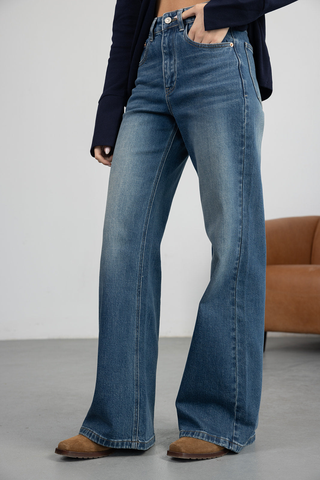 ג'ינס בגזרה מתרחבת עם מותן גבוהה וסגירת רוכסן וכפתור. דגם עם כיסים קדמיים ואחוריים ותפרים מודגשים לאורך הרגל. בד איכותי וקלאסי