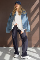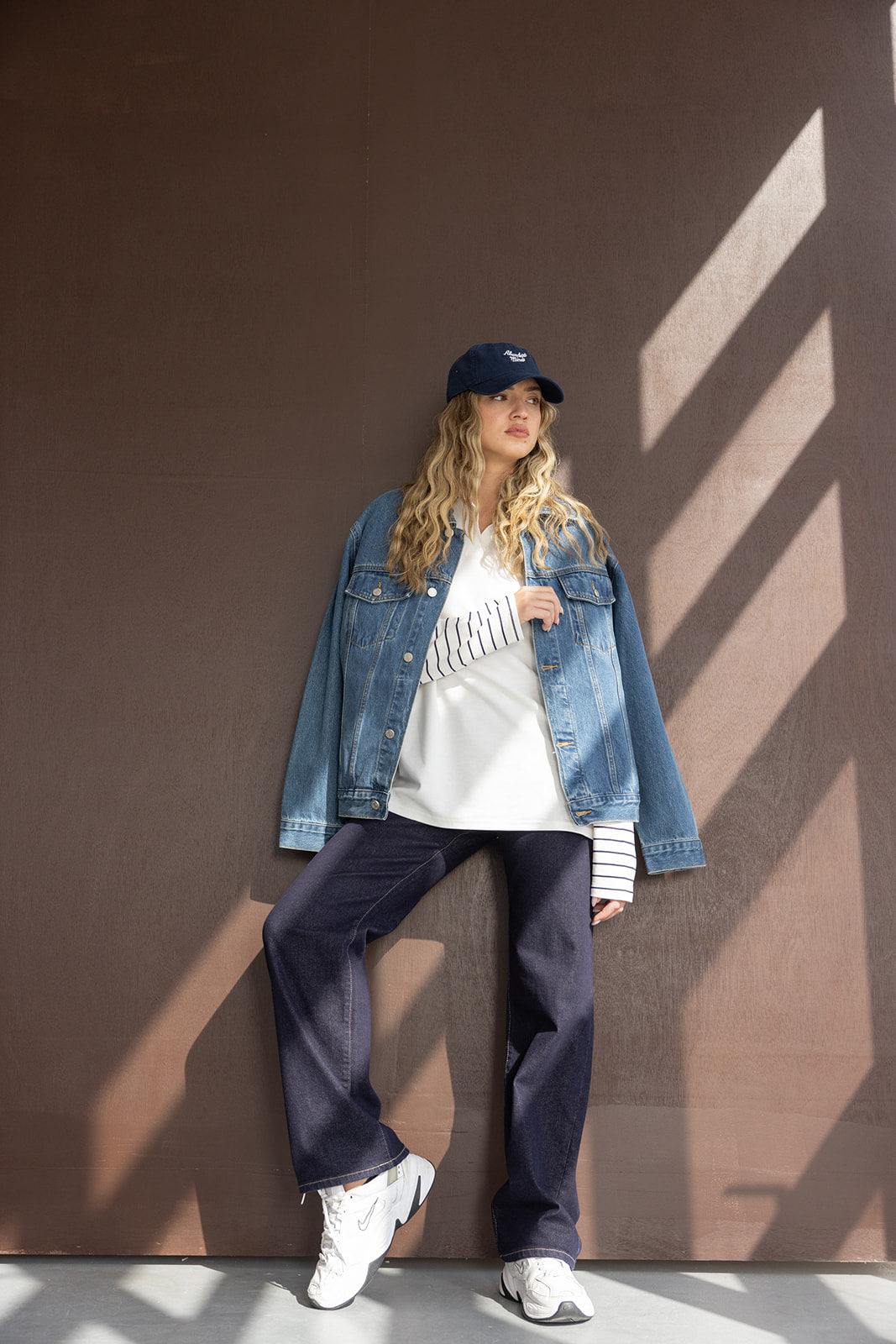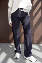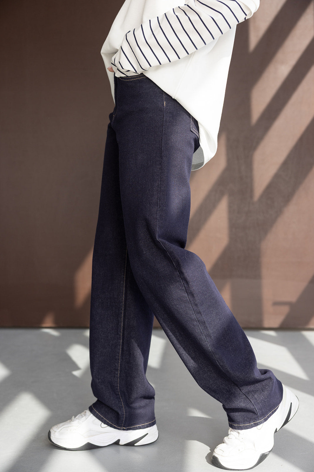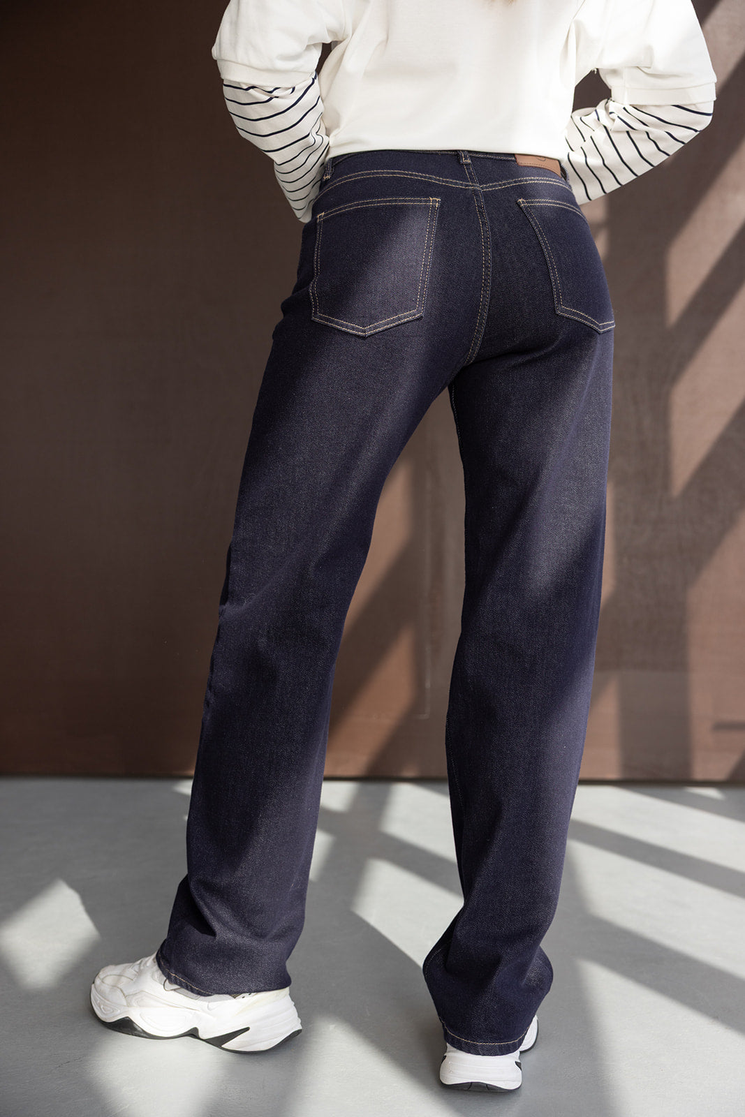 ג'ינס כחול כהה קלאסי בגזרת מידי משוחררת ומתרחבת מעט. לג'ינס שני כיסים קדמיים ושני כיסים אחוריים, כפתור ורוכסן לסגירה.