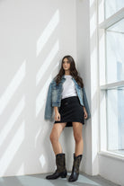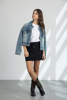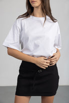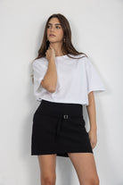 מכנס חצאית בגזרה קצרה ומדויקת עם מראה נקי ומחויט. מותן גבוהה עם חגורה דקה ואבזם דקורטיבי להשלמת הלוק.