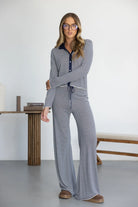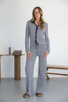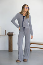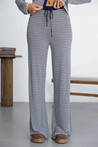 מכנס ארוך בגזרה ישרה, נוח ונעים ביותר לעונה. בשילוב הדפס פסים טרנדי, גומי במותן וקשירה לנוחות מקסימאלית.