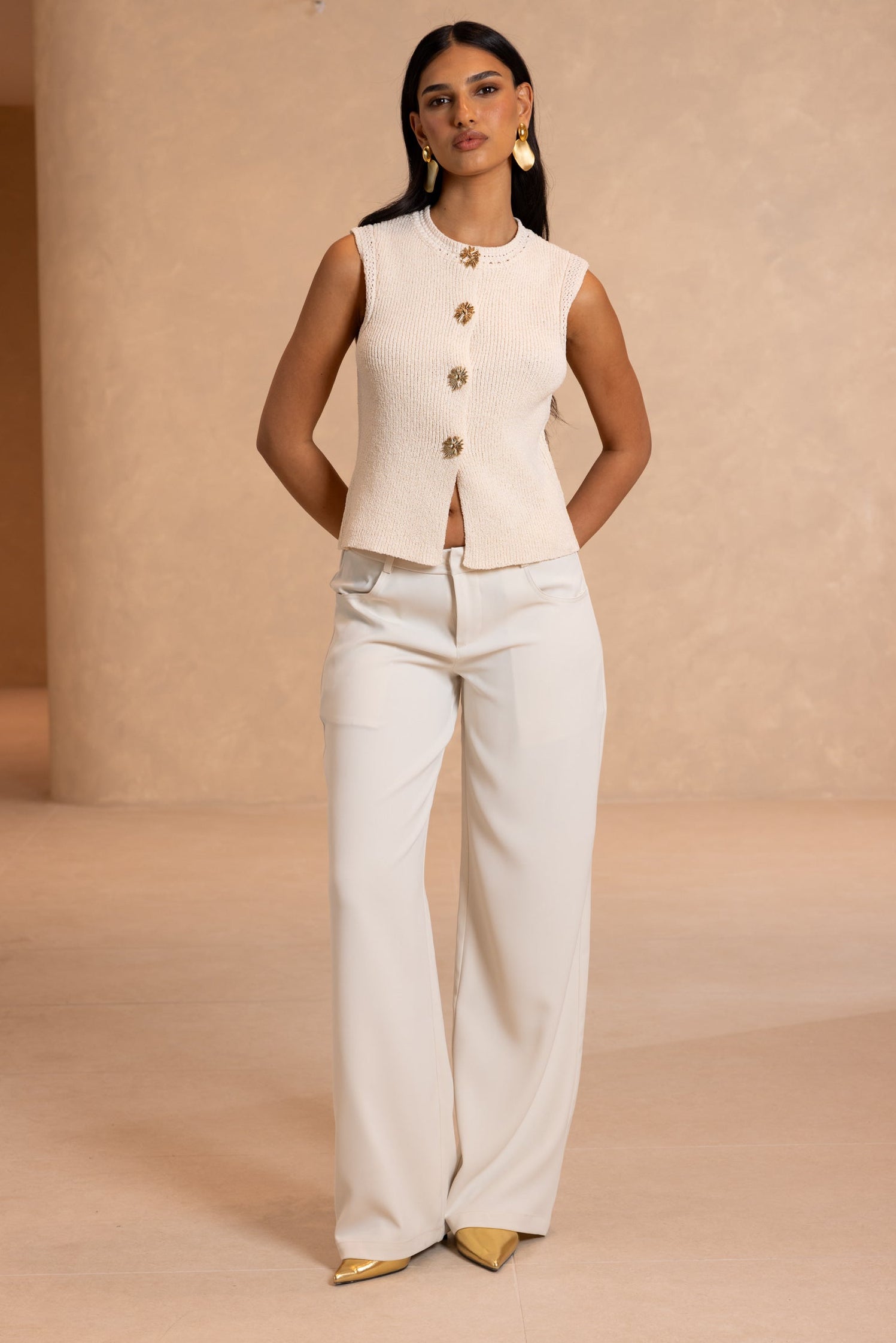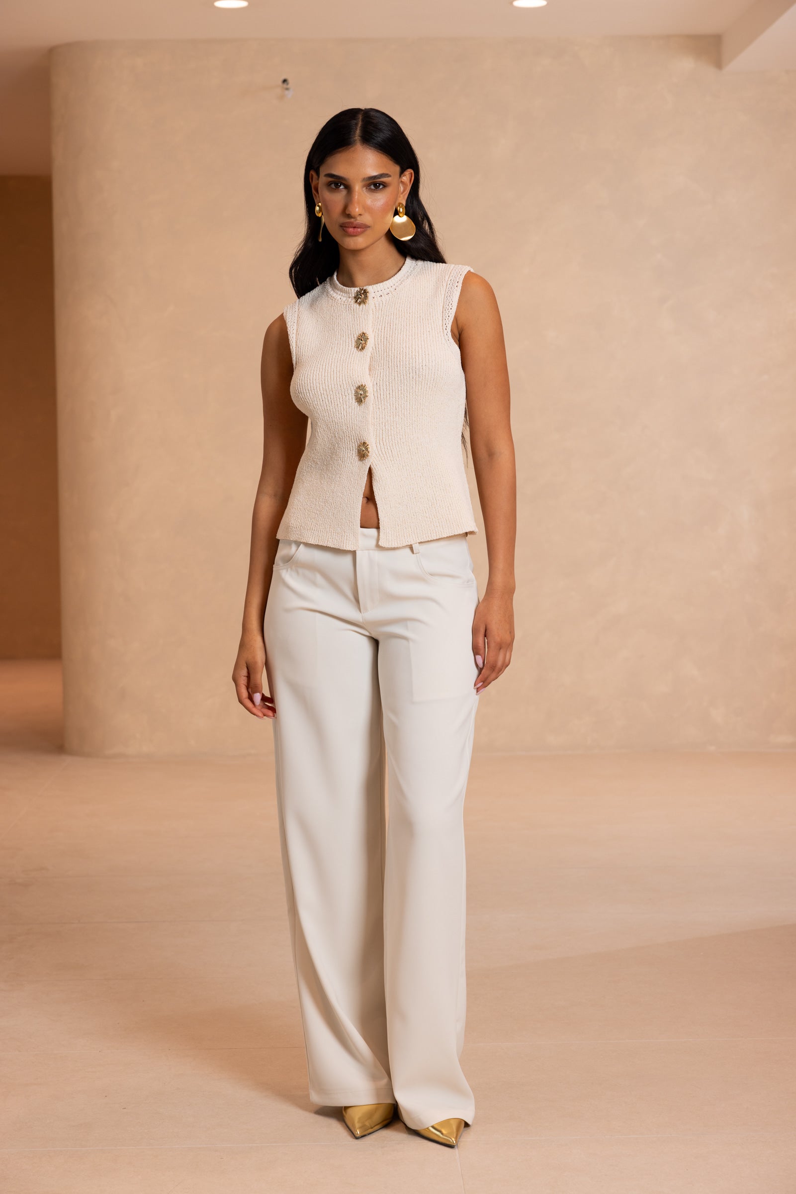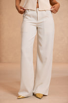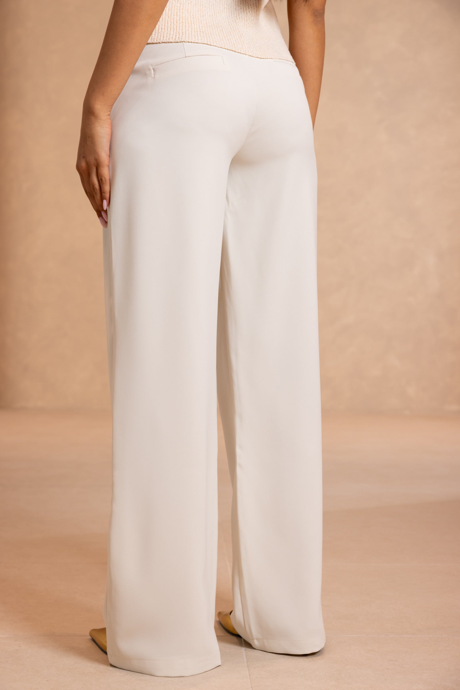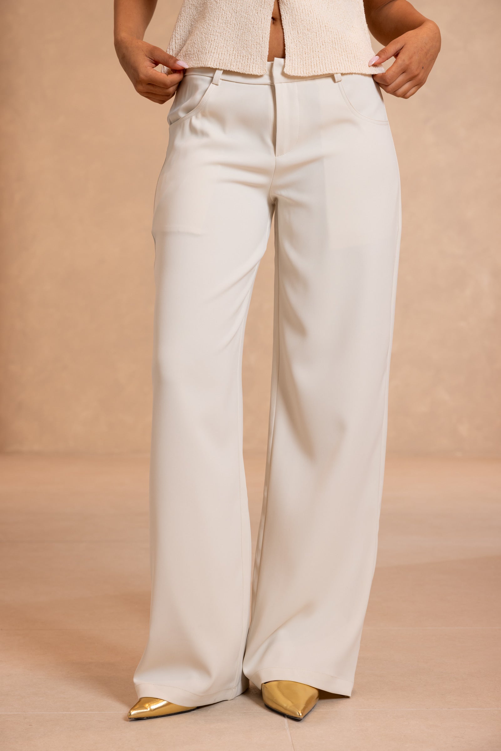 מכנסיים בגזרה מתרחבת עם מותן נמוכה. נסגרים ברוכסן וכפתור, ליצירת מראה חלק ואלגנטי. למכנס זוג כיסים קדמיים וזוג כיסי דמה אחוריים.