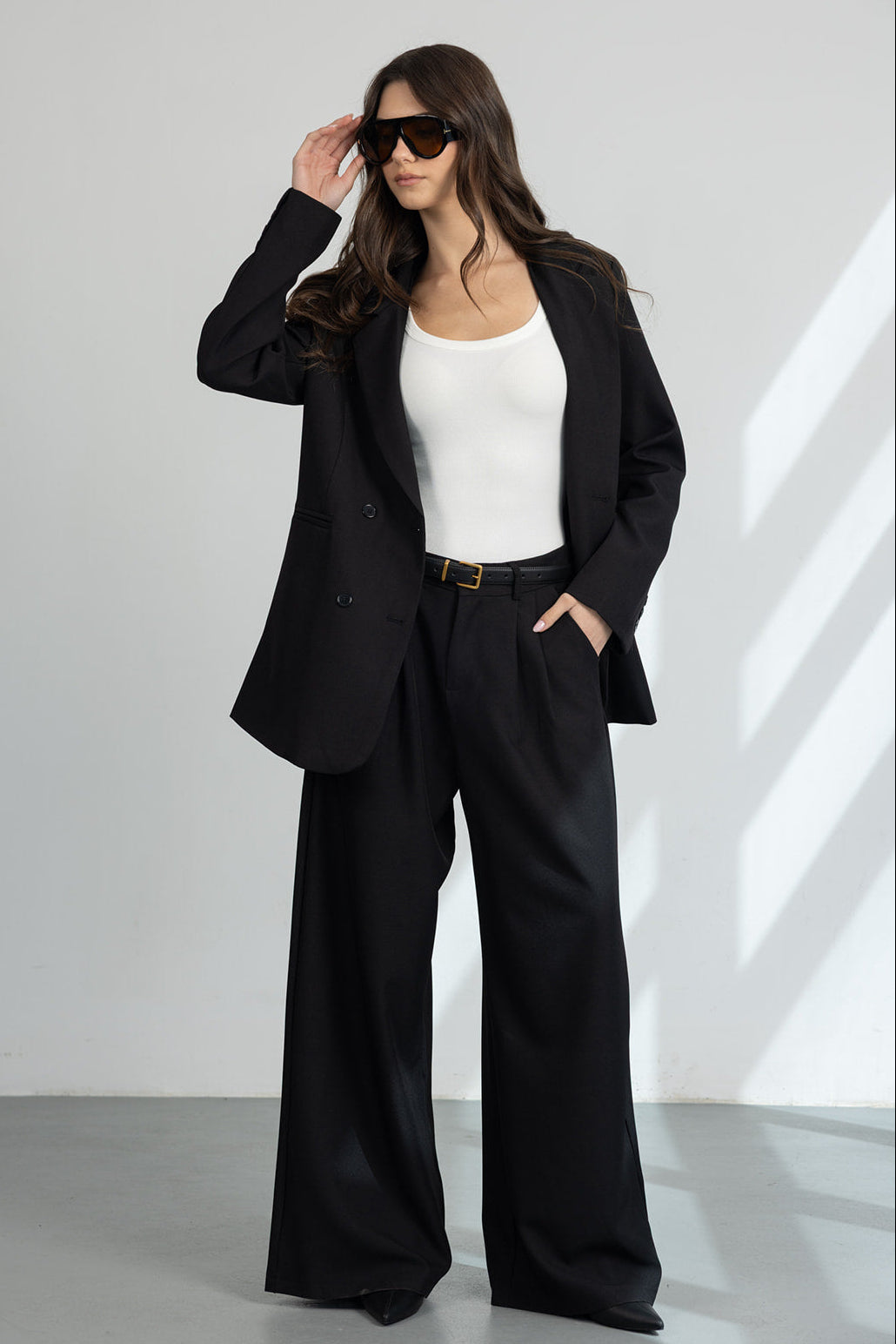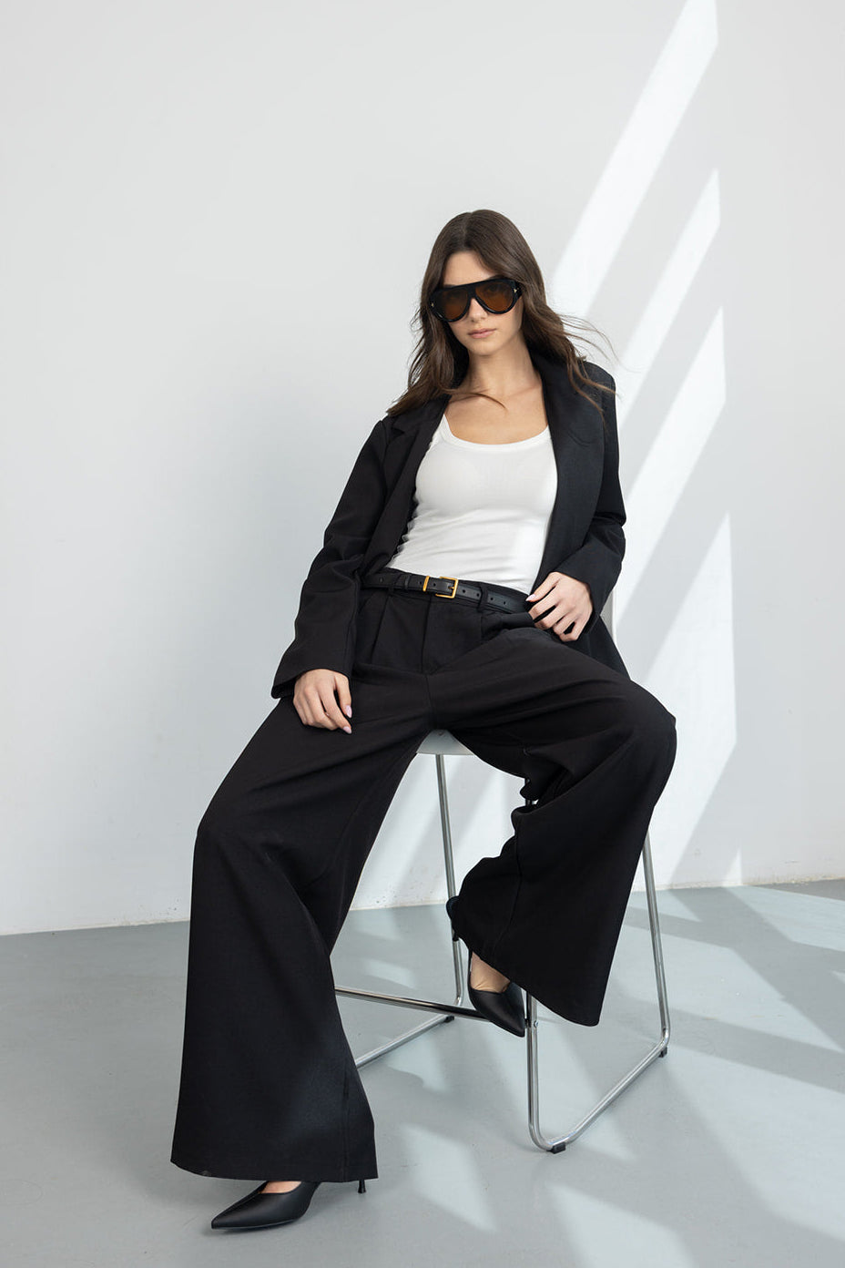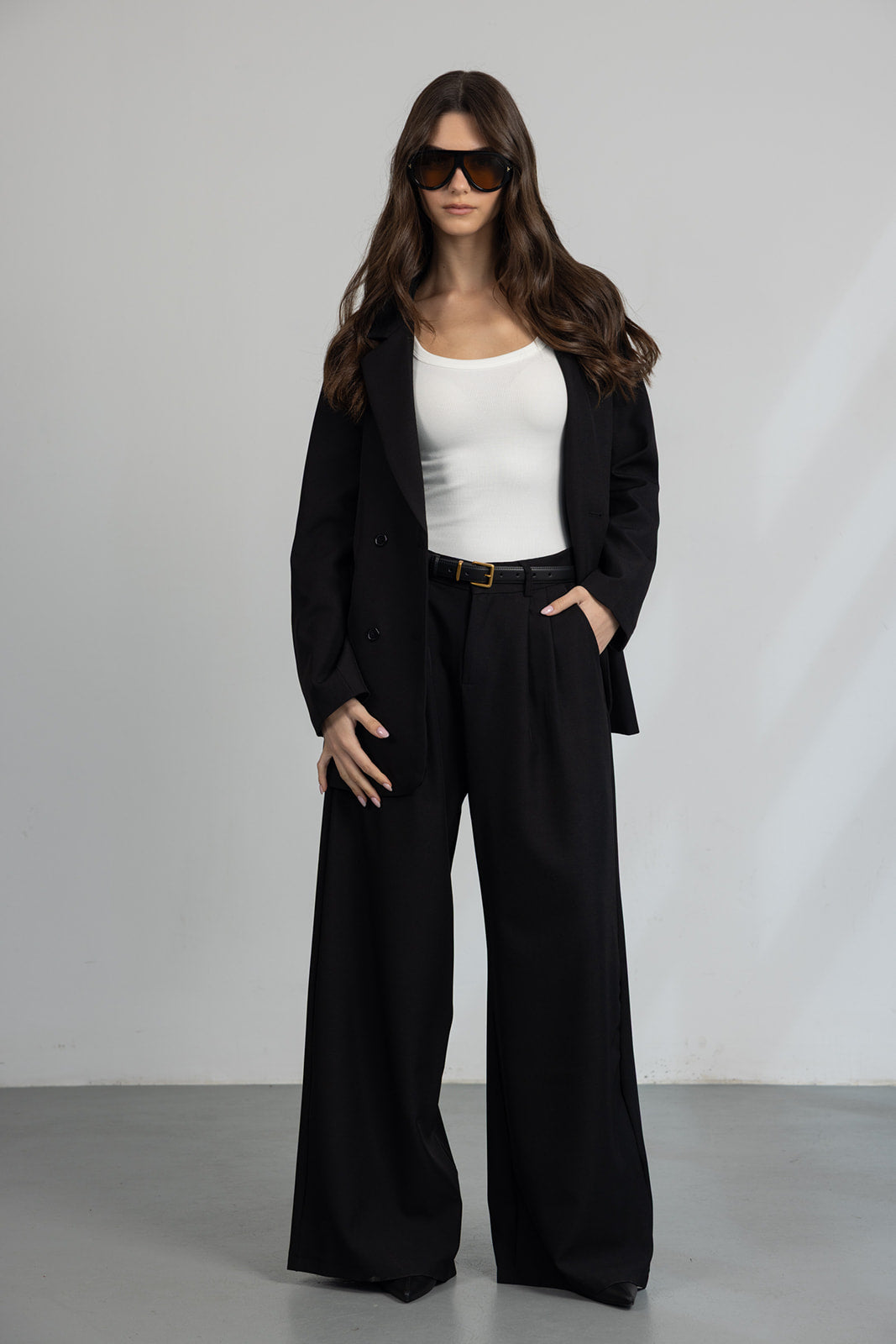 מכנס מחויט במראה קלאסי וגזרה משוחררת, עם כפתור ורוכסן ושני כיסים קדמיים.