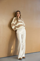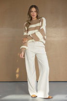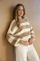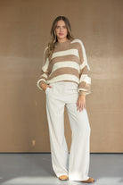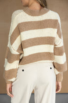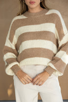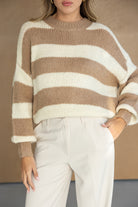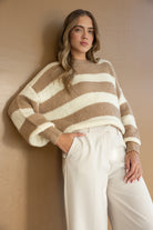 סריג בגזרה משוחררת ומחמיאה, בשילוב דוגמת פסים בז' ולבן