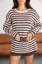 סריג בגזרה משוחררת ומחמיאה, בשילוב דוגמת פסים אל זמנית וחגורה עבה דמוי עור עם אבזם כסוף.