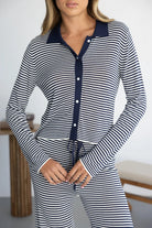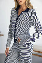 קרדיגן נוח ונעים ביותר לעונה. בשילוב הדפס פסים טרנדי, צווארון פולו קלאסי בצבע כחול כהה וכפתורים.
